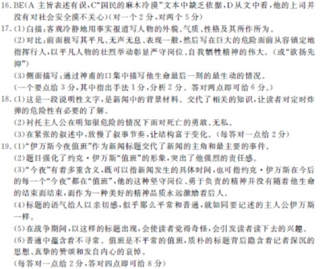 约克•伊万斯今夜值班 罗伯特•凯塞 在德国对英国狂轰滥炸的时候,人们很少有可能想起伊万斯,更不会在他那瘦削的胸艘上挂一枚奖幸,即使在他死后也不会。 他绝不会在一次在低沉的鼓声和嘶哑的喇叭声中进行的殡仪中接受人们的致敬,事实上,人们很可能不会为他举行葬礼。 战争打响之前,伊万斯没有做过任何足以使自己为人所知的事情。他在码头上干过活,那里尘土飞扬,对他的聛部很有影响。战争后期,为招暮新兵进行的体格检查并不十分严格,尽管如此,由于视力差和其他缺陷,人们拒绝他入伍。 然而,他尽管无声无息,却具有英雄的品格, 让我们继续讲伊万斯的故事吧。他死前成了一名防空民防人员。他接受了一年训 这一天夜间,约克•伊万斯值班。过去一个月中,他几乎每夜都要值班,因为每夜都有空袭警报。如果他还活着,那么,他日夜都得值班。现在,空袭随时都可能发生。 那天夜间11时,他打电话给民防指挥中心,报告说他看到远处有一处亮光。伊万斯的长官听说是伊万斯,就漫不经心地说,那是有人抽雪茄烟,不过烟火太亮罢了。 伊万斯守护在郊区某地一个公用电话间旁,敌人轰炸城区时,这里也挨过炸弹。当一枚大炸洋去下来时,他没有来得及离开。 这个炸弹没有爆炸,对此,伊万斯开始变高兴.炸烊是带着撕裂人神经的尖叫声落到地面上的,过了一小会儿,伊万斯想到他应当去看看这枚炸弹,看后,他才恍然大悟,原来,这不是哑弹。在受训期间,他看过不少图片和图表,他知道,这是一枚定时炸弹,而且是一牧大号的。 几分钟之后,他把这一切向上司作了报告。 “炸弹在哪里? “在街心花园里。”伊万斯答道。 上司命令说:“把无关的人赶走,把》近住宅里的人撖光,让行人不要靠近! “是,先生! 我们也许有必要在这里解释一下什么是定时炸弹, 首先,定时炸弹不像老式鱼雷那样,头部装有引信,只要有人用钳子把它拧掉就能使之失效。定时炸弹的结构复杂得多。它装有一个定时装置,其原理是用酸腐蚀金属。被腐蚀的金属板各处厚度不同,因而腐蚀的速度,可以定在一分钟到一个月之间。最后,当金属被穿造、酸液滴到雷酸汞引信上时,就会把炸弹引爆。 伊万斯遵照命令行事。在不到一小时内,他把附近几户人家撤走。在这以后,他坚守在岗位上疏导行人。 早上7时以前,行人不多。在这以后,上班的工人和各种行人成群结队而至,有的步行,有的骑自行车,有的乘汽车。 在连续遭到轰炸的地区,有这样一种荒唐的现象,那就是人们对可能造成严重伤亡的事情,反而非常好奇。 突然,伊万斯发现他一个人得干两个人的事。这枚炸弹落在两条街的交叉口上,使四个方向的行人受到威胁。 伊万斯想尽一切办法解决这个难题。他把炸弹后面100多码的地方用绳子拦了起 有数以百计的行人听到他说此处有定时炸弹,请走开,请走开。”他们走开了。 从这里路过的人中有一位是附近圣公会教堂的神甫。这位神甫描述了伊万斯生命最后一刻的最生动的情况。 神甫说他几乎完全没有必要用手指炸弹在哪里,炸弹就在他身后的草坪上。很明显,他了解这是多么危险。他的面色苍白、憔悴,但是,从他的声音中人们听不到丝毫的颤抖。我永远忘不掉这个场面:他吹哨子,呼喊着,要人们离开。从心理学的角度看,他像中世纪的麻风病人,呼喊着‘避开我,避开我!’ “我要他用绳子把大街拦起来,然后自己撤离。但是,他却对我说:‘我的任务是留在这里。请走开吧,不要给别人树立坏榜样。,于是,我只得走开,到电话间打电话向有关方面求助。” 9时10分,炸洋爆炸了,把地面炸了一个大坑,伊万斯连尸骨也没有留下。 (选自《西方新闻作品选读》) 16.下面对新闻有关内容的分析与鉴赏,最恰当的两项是(5分) A.本文是一篇新闻特写,写的是战争中的一个小人物的故事。平凡与伟大交织在这 B.作者运用目击者的视觉,记述约克•伊万斯在生死关头从容不迫、忠于职守的感人 事迹,增强了现场感和真实性,产生了很强的宣传效果。 C. D. E.“这天夜里”“夜里11时”“过了一小会儿”“几分钟后”“在不到一小时内”“早上7时以前”“9时10分”这些时间词语的使用,增强了紧迫感,使读者的心随作者的叙述而紧张起来。 17.作者用了哪些手法来突出约克•伊万斯这个人物的形象?请简要分析。(6分) 18.文章在写作的过程中,有一段介绍“定时炸弹”的文字,这段文字有什么作用?(6分) 19.标题是新闻的“眼睛”,本文的标题非常有特色,请赏枒本文的标题。(8分) 参考答案 16、BE