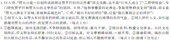 追忆贾大山 彭侃 贾大山,生前一直住在河北正定城内,只去过北京、保定、石家庄、太原等几个城市;他的作品《取经》于1978年获得了首届全国短篇小说奖,是新时期河北省首次获得全国奖的作家;日本,有一个“二贾研究会”,专门研究贾平凹扣贾大山的文学作品;可他在世的时候,却没有出版过一部自己的作品集。 在老朋友肖杰的眼里,贾大山是一个憨厚真诚的人。肖杰回忆了他们1986年一起出差等火车时的情景:“当时一男一女走过来,指着大山说,那个碎纸是你扔的,要罚你款。我说不是我们扔的,大山把我弄到一边去,给了钱。后来我问大山,那个碎纸明明不是咱们扔的,你怎么给钱,他说,没必要吵,跟他们讲不清道理。” 贾大山就是这样憨厚。对待朋友,则非常热情真诚。有客人到访时,他会亲自买菜做饭。有几位作家提到曾经在他家品尝过他做的菠菜蛋花汤,至今还印象深刻。 贾大山淡泊名利、无意仕途,但出于对文化事业近乎痴迷的热爱,他接受组织安排,挑起了正定县文化局局长的担子。作家李春雷在一篇回忆文章中提到,为了修复正定隆兴寺这座国宝级的文物,贾大山奔走于京城、省城和县城之间,往返数十趟,直累得心力交瘁、胃肠溃疡,他蜷卧在吉普车后座上,牙关紧咬、冷汗直流,经过千难万难,修复工程终于圆满完成,隆兴寺成为正定最鲜亮的文化名片。 49岁那一年,他辞去局长职务,回归文坛。1997年,贾大山因病逝世,年仅55岁。 “大山对他的文章精雕细刻、一丝不苟,他的文稿都是用蝇头小楷一笔一画写的,如果有错字要改,他会用小刀挖下来,再一笔一画补上来,大山对自己的作品一字一句甚至一个标点都不放过,非常仔细认真。”当年的文友、编辑肖杰谈起贾大山的写作,最有感触的是贾大山的作品扎根生活,“没有一篇是在屋子里胡编乱造的”。 虽然贾大山的作品受到读者的喜爱,但是他生前并没有出版过一部作品集。当时有出版社愿意出版他的作品集,但是都被他婉拒了。 对待自己的作品,贾大山始终怀有一种谦虚、淡泊的态度。据肖杰回忆,在贾大山生前就曾举办过其作品讨论会,但是他自己从不参加,肖杰记得贾大山曾对他说过:“我坐那儿,人家都给我唱赞歌,都说我作品好,我要不在那儿,人家肯定畅所欲言,好就好,不好就不好,有啥说啥。” “用明净的心,写好的东西”,铁凝是这样评价贾大山的。她在《大山在我心中》一文中写道:“观其一生,大山其实一贯是这样做的,他这种难能可贵的‘一贯’使他留给文坛、留给读者的不仅是独具价值的小说,还有他那令人钦佩的品性。” 大山已逝,但是他的文字和他的精神的确如大山一样,已经挺立在中国文坛和中国人心中,历久弥坚。 4.下列对材料有关内容的分析和概括,正确的一项是(3分) A.贾大山是一位创作成就堪比贾平凹的河北作家,因此,日本人成立了“二贾研究会”,专门研究贾平凹和贾大山的文学作品。 B.贾大山作为正定县文化局局长,他恪守职责,带病坚持工作,特别是为了修复正定隆兴寺,他和李春雷四处奔走,争取领导群众支持。 C.贾大山生前总是回避关于自己作品的讨论会,他认为,在自己不在场的情况下,别人更可能会给自己的作品做出不好的评价。 D.贾大山的文学创作曾受到铁凝极高的评价,她认为“用明净的心,写好的东西”是贾大山的小说独具价值的重要原因。 5.选文在材料运用方面有什么特点,请结合材料简要概括。“分) 6.铁凝评价贾大山留给文坛、留给读者的不仅是独具价值的小说,还有他那令人钦佩的品性。他的品性有哪些?请结合材料简要分析。(5分) 参考答案 4、D 5、细节入文,别人评价入文,如引述铁凝对贾大山的评价,肯定贾大山的贡献。 6、憨厚真诚。淡泊名利,热爱文化事业。仔细认真。谦虚低调。