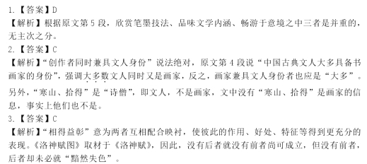 中国传统绘画作品中文人绘画始终是作为主要的方向。文人常与画家紧密地联系在一起。画家的学识、文化品质与文人的内涵构成了书画创作的内在底蕴。文学与绘画虽然表现形式不同,但传统绘画与文学却是紧密相连、相互影响的。文学性的主旨要求在绘画创作中首先要得以表现。文学与绘画,追其根本都是人类的物质生产和人类社会发展到一定阶段因适应人类物质生产和精神生活的需要而出现的精神现象。 中国古典文学在传统绘画中的渗透首先表现在传统绘画的创作主题常来源于古典文学。中国古典文学作品的人物和事件,是绘画创作的重要题材和源泉。中国传统绘画作品取材于古典文学由来已久,我们现在所能看到最早取自文学作品的绘画当是晋代顾恺之的《洛神赋图》,此画完全取材于曹植的《洛神赋》。曹植的《洛神赋》用诗的语言描绘出了想象中洛神的神韵,表现出了作者寄托的情嗦。画家顾恺之用绘画语言将洛神赋所表现出的语言画面展现在纸卷上,准确表现出了诗赋中描绘的梦幻般柔情,使《洛神赋图》与曹植的《洛神赋》相得益彰。此后,历代取材于文学作品的绘画不胜枚举,成为中国文学与绘画有机结合、相互渗透所独有的特征。 以文学作品作画几乎成为历代画家创作的必修课,历代众多诗画结合的经典之作已载入中国绘画艺术史,并传颂后世,对传统绘画“尚意”、“尚情”的艺术追求起到了一定的推动作用。中国传统文人形象也是中国传统绘画中经常表现的另一题材。唐代著名诗僧寒山与拾得,一直是历代画家们经常表现的人物形象。南宋著名画家梁楷和元代著名禅僧画家因陀罗等人都曾创作过寒山和拾得的人物像。以爱国诗人屈原的精神风貌和品格而创作的《屈子行吟图》是明末画家陈洪缓杰出的版画作品。《苏轼回翰林院图》是明代画家张路的作品,表现了宋代文学家苏东坡的神韵。中国古代文人以其与众不同的文人品格,独特的精神风貌,成为画家创作的对象。 中国古典文学对传统书画艺术的渗透,还表现在创作者的身份上。中国古典文人大多具备书画家的身份。唐代王维不仅会作诗,还擅长绘画与演奏,多方面的艺术修养使王维的艺术作品显示出独特的内涵和情趣。宋代苏轼不仅在诗、词、散文等多方面有较大成就,其书法和绘画也取得了杰出的成就。他的书法代表之作《黄州寒食诗帖》、《黄几道祭文帖》等都表现出了雄浑奇崛的气势,绘画作品《古木怪石图》则集中凸显了其厌世疾俗的孤傲与寂寞心灵。 中国古典文学中所表现出的色彩也是传统书画作品蕴涵的重要组成部分。传统书画所表现的神韵与古典文学所表现出的意蕴,融会成新的艺术境界,使人产生更多新的感受。我们在欣赏中国传统绘画作品时,不仅仅沉醉于笔墨技法之间,更是在品味作品所表现的文学内涵,畅游于书画与文学相互交织所表现出的意境之中。 (摘编自李晓男《论中国古典文学在传统书画艺术中的渗透》) 1.下列关于原文内容的表述,不正确的一项是(3分) A.文人绘画始终是中国传统绘画作品的主要方向,文人的内涵是书画创作内在底蕴的构成要素之一。 B.中国传统绘画创作首先要表现文学性的主旨要求,可见传统绘画与文学是紧密相连、相互影响的。 C.传颂后世的历代众多诗画结合的经典之作,在一定程度上推动了传统绘画“尚意“尚情”的艺术追求。 D.对于中国传统绘画,欣赏笔墨技法是次要的,更重要的是品味画作表现的文学内涵,畅游于书画与文学相交融的意境中。 2.下列关于“中国古典文学在传统书画中的渗透”的理解,不符合原文意思的一项是(3分) A.古典文学经常成为传统绘画的创作主题,历代取材于古典文学作品的绘画不胜枚举。 B.以文学作品作画几乎是历代画家创作的必修课,中国传统文人形象是传统绘画中经常表现的题材。 C.中国传统书画的创作者同时兼具文人的身份,如顾恺之、寒山、拾得、王维、苏轼等,其艺术作品往往体现出多方面的艺术修养。 D.传统书画作品中蕴涵着古典文学中所表现的色彩,前者的神韵与后者的意蕴融会成为新的艺术境界。 3.根据原文内容,下列理解和分析不正确的一项是(3分) A.文学与绘画虽然表现形式不同,但两者都是为适应人类物质生产和精神生活的需要而出现的精神现象。 B.中国古典文学作品中的人物和事件是中国传统绘画创作的重要题材,最迟在晋代就出现了取材于古典文学的画作。 C.《洛神赋图》与《洛神赋》相得益彰,没有《洛神赋》,就不可能有《洛神赋图》,而没有《洛神赋图》,《洛神赋》也难免黯然失色。 D.中国古代文人之所以成为传统绘画创作的对象,主要是由于其与众不同的文人品格及独特的精神风貌。 参考答案 1、D 2、C 3、C