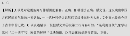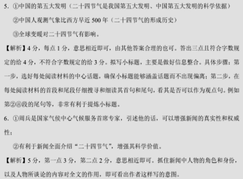 “二十四节气”的科学价值 袁于飞 近日,中国的“二十四节气”被联合国教科文组织列入了人类非物质文化遗产代表作名录。那么,“二十四节气”有哪些科学价值?全球气候变暖对“二十四节气”有无影响?记者日前专访了国家气候中心气候服务首席专家周兵。 “春雨惊春清谷天,夏满芒夏暑相连。秋处露秋寒霜降,冬雪雪冬小大寒。”——这首中国农历的“二十四节气歌”在国际气象界广为人知,“二十四节气”也被誉为“中国的第五大发明”。 “‘第五大发明’的说法有科学依据。因为‘二十四节气’不仅是人类的非物质文化遗产,还是中华民族的祖先历经几千年的农业生产实践创造出来的宝贵科学遗产。从气候学角度看,‘二十四节气’是中国人在长期的生产实践中逐步认识到的季节更替和气候变化规律,凝聚了中国人对大自然的科学态度和正确的观点及方法。”周兵接受记者采访时解释说,“二十四节气”起源于黄河流域,把全年分为立春、立夏、立秋和立冬等,以反映四季、气温、降雨、物候等方面的变化。这反映出中国古代民间对气候的朴素认知,农耕时代中国农民一直依靠“二十四节气”来安排生活和生产,这种科学认识然后又远播海外各大洲,影响了全世界。 “以现代气象学的观点来看,气候的形成主要受太阳辐射、地球运动、大气环流等影响,‘二十四节气’虽没有从这些角度去解释,但也从自然现象中反映出中国古代民间对气候的认知,客观反映了我国独特的气候特点,比如四季分明等。”周兵说,到现在“二十四节气”也是有用的。 “《夏小正》一书是我国最早记录节气以及物候变化的里程碑式的文字,所记载的内容和观察,是后来‘二十四节气’形成的基础。古人以五日为候,三候为气,六气为时,四时为岁,每岁‘二十四节气’,七十二候应,气候的实质是地球与太阳的相互运动,以及农业生产实践过程中物候与气象的有机组合。”周兵说。 周兵介绍,在中国,“二十四节气”系统是逐步完备起来的。早在春秋战国时期,中国就已经能用土圭(在平面上竖一根杆子)来测量正午太阳影子的长短;战国末期《吕氏春秋》已明确提到冬至、夏至、春分、秋分四个节气:一年中,土圭在正午时分影子最短的一天为夏至,最长的一天为冬至,影子长度适中的为春分或秋分。西汉刘安组织编写的《淮南子》一书里就有完整的“二十四节气”记载,并详细地介绍了节气推算的方法和节气的有关内容,论述了天地日月、风雨雷电等自然现象的生成,以及对人类和社会生活秩序与农业生产的影响。 “尤其值得注意的是,陶寺古观象台形成于公元前2100年的原始社会末期,比目前世界上公认的英国巨石阵观测台(公元前1680年)还要早近500年。”周兵说,随着山西襄汾陶寺古观象台的发现,进一步印证了《尚书·尧典》中的记载,这说明中国人观测气象比西方早了500年。 从“二十四节气”的命名可以看出,节气的划分充分考虑了季节、气候、物候等自然现象的变化,一直沿用到现在。不过,工业革命以后,气候明显发生了变化,全球变暖的趋势会不会对“二十四节气”有影响呢? 周兵表示,在气候变暖的背景下,“二十四节气”的适用性也发生了变化。桃花常常在惊蛰节气到来前就红了;清明节后时常出现气温飙升,一日入夏;夏天雨日少了,暴雨强降水多了;冬天里冷空气频数小了,寒潮强度变弱了,暖冬成为新常态。 周兵说:“我国气候专家研究发现,在区域和全球变暖的大背景下,整个季节循环趋于整体增暖,对气候学意义的节气而言,全国平均状况下的早春到初夏节气提前了6天至15天,夏末到初冬的节气推迟了5天至6天;大暑天增加了81%,从白露到寒露显著推迟了5天左右,大寒天减少了57%。”这些说明了气候变化对“二十四节气”产生了影响。 (摘编自《光明日报》2016年12月05日06版) 4.下列对新闻有关事实与背景的分析,不正确的一项是(3分) A.本文是科技新闻,写作缘起是“二十四节气”被联合国教科文组织列为人类非物质文化遗产,着眼点是其科学价值。 B.“二十四节气”是一种科学认识,这在《夏小正》《吕氏春秋》《淮南子》中有着相关认识发展程度的记录和保存。 C.气候的实质是地球与太阳的相互运动,是利用现代气象学研究对“二十四节气”所做的解释,在文中属于新闻事实。 D.工业革命后,全球气候逐渐变暖,我国气候专家研究发现节气出现或提前或推迟的现象,这在文中属于新闻背景。 5.请为②-④段、⑤-⑦段、⑨-⑩段拟写小标题,每个小标题均不超过15字。(4分) 6.新闻中多处引述周兵的话,这样写有什么作用?请简要分析。(5分) 参考答案 4、C 5、中国的第五大发明 ![]()