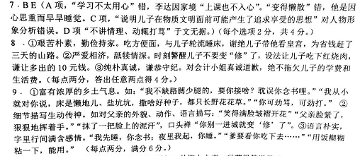 达娃在城里上大学,达娃大名叫李达,家在遥远的大别山深处。 开学有些日子了,李达的学费还没交,学校知道李达的情况,还没有狠着催他交款。可李达心气高,总觉得像偷了东西似的,上课也不入心,人蔫蔫的。家里穷,李达其实不想念书,可拗不过父亲。 这天晚上,李达在宿舍无心看书,便早早蒙头睡下了。不一会儿,同学将他捅醒,说宿舍门口有人找你,门卫不让进。李达一愣,莫不是父亲来了?李达哧溜下床,连鞋也顾不得穿就朝门口奔去。 果然是父亲。昏暗的灯光下,灰蒙蒙、矮小的一个山里人,肩上背着一只蛇皮口袋。李达心一紧,泪蛋蛋就从眼皮底下往外拱。李达上前接过口袋说,爹,你多会儿来的?咋不说一声?我好去接你啊!父亲抹了一把脸上的泥汗说,我不缺胳膊少腿的,要你接啥?耽误你念书哩。再一看李达身上披着衣服,光着脚,就黑了脸说,你这么早就躺下了?我就知道你离了我不会正经念书。我从小就对你说,床是懒地儿、盐坑坑,撒啥好种子,都只长野花野草。李达不敢顶嘴。 李达给父亲泡了一碗方便面。李达不是不想领着父亲去外面吃夜宵,像那些城里学生一样。可李达不敢,他怕说出口就遭父亲骂,父亲的口头禅是:你别一进城就变“修”了。可睡觉得给父亲安排好,因为父亲这一路,少说有三天没歇脚地奔波。李达每次回家也是那样。 学校的招待所在地下室,很便宜。李达说,爹,我送你去招待所睡觉。父亲眉毛一竖,说,你真变“修”了,发财啦?你这不是铺吗?我先睡,你念书;夜里我起,你睡。李达不敢吱声。 学费是父亲和李达一块去财务室交的。父亲不停地对涂着口红的会计小姐点头赔不是:大姐,对不住!晚了,地里头庄稼正长草哩,马虎不得,耽搁了……没误事吧?我这娃嘴木,不识礼,有不周到的地方,你可劲骂,可劲打。年轻的会计不知所云,李达在一旁又不敢笑。 第二天正好是礼拜天,李达想留父亲在城里玩一天,说,爹,我领你去看过去皇帝住的地方。父亲这回没说他变“修”了,笑得满脸皱褶开花,说,达娃,我知道你是想孝顺爹,你爹,我还真想去看看皇帝老儿快活的地儿……可现在还不是时候,等你出头了,在城里扎根、落了窝,我和你娘来享享福也不晚。你要过意不去,就上你们食堂给我买一碗红烧肉来,我晚上喝二两,然后可劲睡一宿。明天你送我上火车。” 吃饭时,父亲却不动那香喷喷的红烧肉。李达说,爹,你不爱吃吗?怎么不吃?父亲突然抹起泪来,哽咽道:你小时候就馋肉,今天可劲吃,爹要看你吃下去……李达和父亲谁都吃不下。 第二天送父亲上火车时,人特多。父亲刚挤上去,列车就启动了。李达没有像城里人那样向父亲挥手,而是在站台上和列车一同向前走着,两眼盯着父亲,一眨不眨地盯着父亲。突然,父亲趴在窗户上向李达招手,见父亲手上攥着一张10元的票子。父亲说,达娃,我算错了,这路上只要47元钱就够了,多出10元,你拿着!李达浑身一颤,说,爹,你带着,路上买点好吃的。父亲却吼道,我算过了,多出10元,你拿不拿!李达见父亲要扔下来,忙说,风大,别扔下来,你留着用。父亲脸紫了,狠命地挥着手。李达紧跑几步将父亲的手往回推。可父亲的手像山里的柞树一样坚硬,使劲往李达手心里塞那张票子。这时,车站警察一把将李达揪住。 火车走远了。低头发现手里攥着被撕坏的半张10元票子,李达两眼模糊地看着远方。 几天后,李达准备将那半张票子寄回家去。可信刚要寄出去,李达就收到父亲的来信和半截票子,拆开一看,上面就一行字: 我儿达娃,用饭糊糊粘一下,能用。 (选自2003年《小小说月刊》傅昌尧《天下父亲》) 7﹒下列对小说相关内容和艺术特色的分析鉴赏,最恰当的两项是(4分) A﹒开学有些日子了还没及时交学费,李达自感家境贫寒,但又心气很高,所以学习不太用心,甚至不想念书,就变得懒散,有些胆小懦弱。 B﹒“床是懒地儿、盐坑坑,撒啥好种子,都只长野花野草”,父亲的训斥意在表明:即使天资再好,懒惰也会让人失败,长不成参天大树。 C﹒文中父亲的口头禅“你变‘修’了吧”,反映了父亲对进城读书儿子的担忧,同时说明儿子在物质文明面前可能产生了追求享受的思想。 D﹒“可拗不过父亲”“不敢顶嘴”“不敢吱声”,说明李达懂得父亲只是要他念书,但也侧面写出了父亲教育严厉、不讲情理、动辄打骂的特点。 E﹒站台上父亲手上攥着的一张10元的票子,李达与父亲却推来让去,在这一推一让中充分体现了父亲关爱儿子、儿子孝顺父亲的真挚亲情。 8﹒请结合全文分析这位山村父亲的形象。(4分) 9﹒小说感人至深,请结合全文分析本文的语言特色。(6分) 参考答案 7、BE 8、艰苦朴素,勤俭持家。严爱相济,舐犊情深。纯朴真诚,谦恭守纪。 9、富有浓厚的乡土气息。细节描写生动传神。语言朴实,字里行间满含感情。