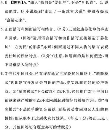 那山那人那条路 在黔西南州晴隆县的南郊,陡峭的山壁上,一条蜿蜒的公路盘龙般曲折而上,划出二十四道令人惊叹的大转弯。这里就是抗战时期著名的“史迪威公路”中最险峻的一段——二十四道拐。 七十多年前,为打通连接滇缅公路和重庆间的交通线,人口不到5万人的晴隆县城几乎出动了全部劳动力,以血肉之躯和最原始的石锤铁钳仅用一年时间就开出了这条抗战生命线,被称作“人类奇迹”。遥望二十四道拐,至今仍能从中感受到晴隆人在逆境中的坚韧与不屈,这是一条用生命铺就的道路。 岁月穿梭。如今,晴隆又有了一位用生命来开路的人。他就是姜仕坤——倒在脱贫攻坚道路上的县委书记。 当了四年县长、两年县委书记,姜仕坤在下乡调研的途中曾无数次经过二十四道拐。在这条颠簸辗转的山路上,他第一个提出要将二十四道拐打造成“晴隆名片”,作为开发山地旅游的看点和抓手。然而比这更加重要的是,这条凝聚着血汗与牺牲的道路让姜仕坤坚信,晴隆人有能力靠着自己的努力改变自己的生活。 在遇到姜仕坤之前,40多岁的山里汉子肖长青几乎就要被贫困打垮了。一年辛苦到头,所有收入加起来不过几千块钱,妻子因贫穷离他而去,两个儿子每天两块钱的生活费有时都会让他捉襟见肘,至于已经住了三十多年的吊脚楼,四面透风却没有多余的钱去整修。 姜仕坤在进村入户排查中认识了肖长青,把他定为自己的帮扶对象。和很多干部送生活必需品、送现金搞帮扶不一样,姜仕坤首先问肖长青自己究竟会做什么,想干什么。 曾经学过电焊的肖长青最大的理想就是开个电焊铺。姜仕坤当即拍板,自己出钱给肖长青“投资”。一个月后,姜仕坤带着焊枪、氧气瓶、电焊面具、切割机再次来到肖长青的面前……肖长青至今还记得姜仕坤当时对他说的话:“给你多少钱,都不如给你找条路。” 现在“长青电焊铺”在四邻八村已经小有名气,肖长青靠给乡亲们焊接门窗,每个月的收入超过了3000块,离开几年的妻子回了家,想了多年的新房子终于盖了起来。 姜仕坤始终认定,只要把晴隆人的积极性调动起来,把晴隆人修筑二十四道拐时的那股劲激发出来,那么面前的困难就一定会被克服,实现小康就不会是遥不可及的梦想。 在他的劝说下,大田乡董箐村村委会副主任李安珍放弃了去城里生活的机会,带着村里人搞山地畜牧业,靠养羊富了一户又一户,村里的小楼越来越多。 在他的要求下,晴隆的乡镇干部几乎人人都是脱贫攻坚的尖兵。大田乡乡长田志敬告诉我们:“现在没人坐得稳办公室,每天不是在村里帮着搞易地扶贫搬迁,就是在农户家里帮着算脱贫账。” 在他的嘱托下,早就可以“功成身退”的畜牧业专家张大权依然孜孜不倦地奋战在推广“晴隆模式”的第一线:“仕坤认定‘晴隆模式’是推动晴隆脱贫攻坚的关键。他现在走了,我就要替他坚持下去!” 在他的影响下,越来越多的领导干部走到了脱贫攻坚的第一线,很多县里局委办的工作人员骑着自己的摩托车走村串户,听百姓的意见,办扶贫的实事。 …… 没有比人更高的山,没有比脚更长的路。曾几何时,黔西南大山里的农民,会想尽办法在遍地石头的山坡上寻找哪怕碗口大的土地播下种子。在姜仕坤的带动下,晴隆的干部群众铆足了干劲,在一切可能的地方找机会、找突破,为脱贫播撒下希望、开辟出道路。 整整六年,在姜仕坤的带领下,在全县干部群众的努力下,晴隆县逐渐形成了以山地畜牧业、山地旅游业两大产业强力拉动,以易地扶贫搬迁托底保障的发展格局,脱贫攻坚形势发生根本性扭转。穷了几辈子的晴隆县,终于在石头缝里走出了一条致富大道。 这条路,比七十多年前那条曲折蜿蜒的二十四道拐更加令人惊叹,更加让人感动,更加充满希望。 (摘编自“新华网”,记者罗宇凡、李春惠同名文章) 【相关链接】 ①2006年6月,全国南方草地畜牧业现场经验交流暨培训会议就在晴隆召开,总结和推广“晴隆模式”。时任国务院扶贫办主任刘坚高度评价“晴隆模式”:一是思路好,二是模式好,三是机制好。 ②2010年9月,国家再次在晴隆召开“石漠化地区种草养畜产业化扶贫贵州试点工作现场会”,决定在全国13个省和贵州43个县全面推开和继续巩固“晴隆模式”。在全国首批100个石漠化综合治理试点县中,有33个推广“晴隆模式”,都收到了较好的效益。 ③何为“晴隆模式”?“因地制宜,靠人工种草养羊,实现经济效益、生态效益和扶贫效益同步发展的模式,这是一个富民的模式。”晴隆县委书记姜仕坤说。 4.下列对材料有关内容的分析和概括,最恰当的一项是(3分) A.“那山那人那条路”分别指的是晴隆县的南郊陡峭的山、肖长青和二十四道拐。 B.抗战时,晴隆人用生命开辟了二十四道拐,打通了抗战生命线。如今,姜仕坤又用生命在此开辟了一条脱贫致富路。 C.在姜仕坤的影响下,全县的领导干部都投身到帮扶困难群众的一线中,全县面貌焕然一新。 D.在姜仕坤的带领下,在全县干部群众的努力下,穷了几辈子的晴隆县,终于在石头缝里富裕起来。 5.结合内容,请简要分析本文是如何塑造姜仕坤的形象。(4分) 6.根据作品,结合现实,请简析“晴隆模式”对当代中国的意义。(5分) 参考答案 4、B 5、正面描写和侧面描写相结合。 6、