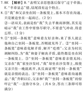 和父亲坐一条板凳 孙道荣 上大学后的第一个暑假,回家。坐在墙根下晒太阳的父亲,将身子往一边挪了挪,对我说,坐下吧。那是我第一次和父亲坐在一条板凳上。 家里没有椅子,只有长条板凳,还有几张小板凳。家里来了人,客人或者同村的男人,父亲会起身往边上挪一挪,示意来客坐下,坐在他身边,而不是让他们坐另一条板凳。让来客和自己坐同一条板凳,不但父亲是这样,村里的其他男人也是这样。让一个人坐在另一条板凳上,就见外了。 工作之后,有一次回家,父子俩坐在同一条板凳上,闷头抽烟。烟雾从板凳的两端飘浮起来,有时候会在空中纠合在一起。而坐在板凳上的两个男人,却很少说话。与大多数农村长大的男孩子一样,我和父亲的沟通很少,我们都缺少这个能力。在我长大成人之后,我和父亲最多的交流,就是坐在同一条板凳上,默默无语。①坐在同一条板凳上,与其说是一种沟通,不如说更像是一种仪式。 父亲并非沉默讷言的人。年轻时,他当过兵,回乡之后当了很多年的村干部。村民有矛盾了,都会请父亲调解,主持公道。双方各自坐一条板凳,父亲则坐在他们对面,听他们诉说,再给他们坪理。调和得差不多了,父亲就指指自己的左右,对双方说,你们都坐过来嘛。如果三个男人都坐在一条板凳上了,疙瘩也就解开了。 结婚之后,有一次回乡过年,与妻子闹了矛盾。妻子气鼓鼓地坐在一条板凳上,我也闷闷不乐地坐在另一条板凳上,父亲坐在对面,严厉地把我训骂了一通。训完了,父亲恶狠狠地对我说,坐过来!又轻声对妻子说,你也坐过来吧。我坐在了父亲左边,妻子扭扭捏捏地坐在了父亲右边。父亲从不和女人坐一条板凳的,哪怕是我的母亲和姐妹。那是唯一一次,我和妻子同时与父亲坐在同一条板凳上。 在城里终于有了自己的房子后,我请父母进城住几天。客厅小,只放了一对小沙发。下班回家,我一屁股坐在沙发上,指着另一只沙发对父亲说,您坐吧。父亲走到沙发边,犹疑了一下,又走到我身边,坐了下来,转身对母亲说,你也过来坐一坐嘛。沙发太小,两个人坐在一起,很挤,也很别扭,我干脆坐在了沙发帮上。父亲扭头看看我,忽然站了起来,这玩意太软了,坐着不舒服。只住了一晚,父亲就执意和母亲一起回乡去了。后来妻子提醒我,一定是我哪儿做得不好,伤了父亲。难道是因为我没有和父亲坐在一起吗?不是我不情愿,真的是沙发太小了啊。我的心,隐隐地痛。 父亲健在的那些年,每次回乡,我都会主动坐到他身边,和他坐在同一条板凳上。父亲依旧很少说话,只是侧身听我讲。他对我的工作特别感兴趣,无论我当初在政府机关工作,还是后来调到报社上班,他都听得津津有味。有一次,是我升职之后不久,我回家报喜,和父亲坐在板凳上,年轻气盛的我,一脸踌躇满志。父亲显然也很高兴,一边抽着烟,一边听我滔滔不绝。正当我讲到兴致时,父亲突然站了起来,板凳一下子失去了平衡,翘了起来,我一个趔趄,差一点和板凳一起摔倒。②父亲一把扶住我,你要坐稳喽。不知道是刚才的惊吓,还是父亲的话,让我猛然清醒。这些年,虽然换过很多单位,也做过一些部门的小领导,但我一直恪守本分,得益于父亲给我上的那无声一课。 父亲已经不在了,我再也没机会和父亲坐在一条板凳上了。每次回家,坐在板凳上,我都会往边上挪一挪,留出一个空位,我觉得,父亲还坐在我身边。我们父子俩,还像以往一样,不怎么说话,只是安静地坐着,坐在陈旧而弥香的板凳上。 (有删节) 7.下列对小说相关内容和艺术特色的分析鉴赏,不正确的两项是(4分) A.小说开头写“我”在大学第一个暑假里第一次和父亲坐在同一条板凳上,由此引出下文坐同一条板凳的几件事情,“板凳”成为一条贯穿全文的线索。 B.“我”和父亲虽然坐同一条板凳,但很少说话,说明“我”们平时缺少沟通,使“我”们之间存在代沟;而父亲从不和女人坐同一板凳,表明父亲思想落后保守。 C.父亲嫌“我”家的客厅里的沙发软,坐着不舒服,其实父亲并非不想坐沙发,是由于“我”没跟父亲同坐沙发而是坐在沙发帮上的举动深深刺痛了父亲。 D.父亲总是让“我”和他坐同一条板凳,其实是对“我”的启发和教育,尤其是在“我”升职以后,父亲这种特殊的教育方式让“我”懂得了做人和做事的道理。 E.小说没有过多的语言描写,也没有跌岩起伏的故事情节,而是以回忆的形式进行平实而亲切的叙述;小说的结尾写“我”坐板凳留出空位,卒章显志。 8.小说中画线的两句话有怎样的含意?请简要分析。(4分) 9.“坐同一条板凳”只是日常生活中的一件小事,但它蕴含着丰富的思想内涵,请结合全文就其思想性进行分析。(6分) 参考答案 7、BE 8、“我”和父亲坐在同一条板凳上,基本不存在沟通,只是被迫坐在一起而已。一语双关,表面是怕“我”失去平衡,其实是暗示“我”在工作中要恪尽职守,不要意气冲动,得意忘形。