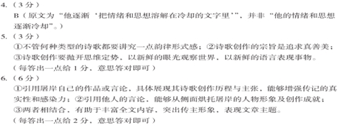 写诗的冲动始终存在 李扬 1941年,18岁的屠岸第一次发表诗作《美丽的故园》,到现在,他的诗歌创作已跨越了70余年。 诗人成幼殊是屠岸的诗友故知。1945年,屠岸与成幼殊、卢世光、陈鲁直、何溶、吴宗锡、章妙英等人成立“野火诗歌会”,以诗会友,友情长达60余年。成幼殊说,当年的屠岸有着生动的形象,沉静、纯净、清澈,很有风骨,可谓“诗如其人,人如其诗”,她从与屠岸的诗歌交往中读出“一贯清亮的笔调”。 1946年,参加地下党外围组织工作的屠岸在《梦幻曲》一诗中写下:“……但是,不中用的土牢呵,/圈住了我,可也得圈住我的灵魂呀!/它只要伸一下腰,就会展开洁白的巨翼,/开始,翩翩地,飞往自由的土疆;/呵!彼方,一片朝雾熹微,/在嘶叫马群的杂沓奔驰中,/猛然,跃起你矫壮的戎姿,/冲向寒栗的晨光……”可以看到年轻时代的屠岸鲜锐的革命激情与思想。 后来,他逐渐“把情绪和思想溶解在冷却的文字里”。特别是他的十四行诗,体现了他对现代汉语词汇、音节、韵律的细微考察。 在《哑谜》(1990)中,他写道:“……无知和悟性在宁静和骚动中溶解;/宇宙万物渗入朦胧的瞳仁。/千古哑谜在哲学 家头脑里萌灭,/疑问如游丝潜入童心的裂痕。/为什么我是我,不是别人?脆声问。/上帝不言语,魔鬼睁大了眼睛。” 屠岸先生说,他尝试写十四行诗是在1940年代翻译《莎士比亚十四行诗》之后,同时受到了冯至的影响,他认为冯至的十四行诗集是中国新诗的经典。 “不管是自由诗还是格律诗,诗歌还是要讲究一点韵律形式感,否则就变成了散文。写十四行诗,我想把思想天地放在一个艺术的规范里加以表达。我有时也写一些自由诗,但喜欢自由当中有严谨。我用‘古典的抑制’风格,把自己充沛的感情凝缩、冷冻起来,成为一种精炼的现代语言。我很佩服的一位诗人是吴汶,他的诗,自由当中有严谨,他的诗集《菱塘岸》即‘古典的抑制’的一个典范。”屠岸先生说。 1986年,屠岸出版了诗集《屠岸十四行诗》,得到诗界称誉。卞之琳评价他的十四行诗“得心应手,不落斧凿痕迹”。诗人郑敏认为他的诗是“在朴素而凝练的词句和严谨的艺术形式上透出深刻的思想之光”,是让“哲理穿上布衣裳”。 上世纪八九十年代,有人提出写诗要“颠覆传统”“颠覆崇高”“颠覆理性”,甚至“颠覆语言”,同时口水诗泛滥,这让屠岸感到十分悲哀。“无论形式如何创新,但万变不离其宗,宗就是真善美。不能为了创新而写泡沫诗、伪诗、非诗。离开这个底线求变,必定走到诗的反面,诗也就死亡了。”屠岸先生说,“我一生在追求真诗,最讨厌虚假。我喜欢莎翁十四行诗,喜欢济慈,因为他们的诗真情流露,正像济慈所说‘真即是美,美即是真’。” 在《济慈墓畔的沉思》(2001)一诗中,屠岸写下:“你所铸造的、所有的不朽之诗/存留在‘真’的心扉,‘美’的灵府,/使人间有一座圣坛,一片净土,/夜莺的鸣啭在这里永不消逝。”这是屠岸对济慈的评价,也可视为他对自己诗歌的期许。 诗歌创作70余载,他至今仍感到“写诗的冲动始终存在,没有退潮”。有时已经上床入睡,如果出现诗思,立即起床把灵感记下。屠岸说,自己的创作方法是抛开思维定势,带着新鲜的眼光看待、观察熟悉的世界,从中发现新鲜的东西并用新鲜的语言加以表现。 屠岸先生正是以此保持着长久的创造力,诚如洪子诚、刘登翰在《中国当代新诗史》中所写:“屠岸是执着的‘美’的不懈追求者,细心且有耐性地去发现事物中的美、圣洁、欢愉。直到晚年,屠岸的诗也仍保持着年轻的心态,一种不做作的诚挚的童心。” (节选自《屠岸:诗歌是我的圣坛》) 4.下列对传记有关内容的分析和概括,不恰当的一项是(3分) A.文章按时间顺序叙述了屠岸诗歌创作70多年的漫长历程,真实地反映了屠岸对于诗歌的执着追求,即使耄耋之年,“写诗的冲动始终存在”。 B.年轻时代的屠岸沉静、纯净、清澈,很 有风骨,他的诗歌中蕴含着鲜锐的革命激情与思想;随着时间的推移,他的情绪和思想逐渐冷却。 C.在冯至等因素的影响下,屠岸开始创作十四行诗,并于1986年出版了诗集《屠岸十四行诗》,受到了包括卞之琳、郑敏在内的诗界人士的高度评价。 D.屠岸勤勉努力,一旦出现诗思,即使已上床入睡也立即起床把灵感记下;且一生不懈追求和发现美。这些是他诗歌创作成就巨大的重要原因。 5.结合文本,概括屠岸关于诗歌创作的基本观点。(3分) 6.文中大量引用屠岸以及他人的作品或言论,有何作用?请简要分析。(6分) 参考答案 4、B 并非“他的情绪和思想逐渐冷却” 5、不管何种类型的诗歌都要讲究一点韵律形式感;诗歌创作的宗旨是追求真善美;诗歌创作要抛开思维定势,以新鲜的眼光观察世界,以新鲜的语言表现事物。