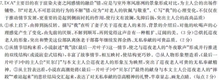 冬夜的歌 谢静 太阳像一只橙黄的圆橘,渐渐被灰蒙蒙的暮云遮去。呜呜鸣响的西北风摇撼着树木,摇撼着电线杆。狂舞的雪片碰撞在窗玻璃上,开始了它化为冰凌的再生…… 坐在温暖如春的屋里,靠近银白色热烘烘的暖气片,我在阅读欧·亨利的名作《最后一片叶子》。 写字台上的两盆腊梅和玉兰,给房间增添了淡淡的幽香。那圆的、扁的、方的、长的,从海滩捡回来的五彩石,点缀于花盆之间,望去完全没有冬日的景象。 妻悠然斜倚于沙发上,正在织一件米黄色的毛线衣。纤细的手指,轻盈地抖动。 不知从何处,传进耳鼓一阵时断时续的悠远的喊声:“各家各户……注意啰……小心煤气……中毒……防火……防盗……” 这声音由远而近,在寒风凛冽的冬夜回响着,使我油然产生一种苍凉之感。读书的兴致完全被搅乱了。我刚看到“老贝尔门是住在她们这座楼房底层的一个画家。他年过六十,有一些像米开朗琪罗的摩西雕像那样的大胡子……”便就此打住,折页合书,忍不住问: “这是谁?神经病?深更半夜在街里大呼小叫的,不怕惹人烦?” “你才出差回来,不知道咱们街里出现的新鲜事儿。”妻继续织着毛线衣,没抬头,“这是一个部队离休的老干部,回来跟女儿、女婿养老的,半个月前开始,天天这么喊呐!” “嘿,干嘛不住干休所?”我诧异了。 “大约是怕寂寞。”妻按自己的理解说。 “他女儿、女婿也够呛,父亲辛劳了一辈子,晚年应该让他在家享享清福,怎么会让老人到街上干这呢?难道是缺钱花吗?”我不满地嘟哝。 “哪里话,他的钱多的花不完,给区幼儿园送了三百,国库券买了一千。”妻抬起头来辩解说,“人家夜间值班,完全是尽义务。” 我呆了,有些不可思议。听那喊声越来越大,已接近我居住的楼下。 “各家各户注意啦,提高警惕,防火防盗,防止煤气中毒——!” 这声音倏忽间变得顺耳起来,可以听出是走南闯北、有点走了调儿的中原乡音,带着其特有的悠长的拖腔,容易使人联想到草原上的牧人,在广阔的原野呼唤走失的骏马…… “……喂,这是谁家的自行车?谁的车?快搬进去,天不早啦!” 那绝不是民警们手中拿的那种半导体喇叭。是纸喇叭筒,还是铁皮的?我猜测,并直起身来,想看清楚这吆喝的老人的模样。窗玻璃上蒙着一层薄冰。室外是浓深的夜色和飞扬的雪花。 “呀,真该死,是我的自行车忘搬了!”妻的脸上含着些微的惊慌。 “我去搬!” 穿上外套我飞步下楼。刚走到二楼楼梯口,见妻的那辆“凤凰”车已搁在梯口的空档上。 我的心热了。 此后,每天傍晚至深夜,我的耳边都回响着这老人的吆喝声。渐渐习惯了。像听风声、车声、雨声、树声一般习惯。这吆喝声,穿越深深的夜空,把人安然地带入了温暖甜美的梦乡。 因为工作忙,业余时间要赶写技术论文,《最后一片叶子》一直没有读完,真有点对不住欧·亨利先生。也对不住妻,她读了多遍,向我介绍。不过,那吆喝声却必不可少。每当此刻,耳神经似乎变得特别敏锐灵巧。 “咦,是时候了,怎么那老人没出来?”我在写字台边不安地问妻子。 “哦,他作为区街系统的先进代表,到市里出席劳模会去了!”妻在读《英语九百句》,乐呵呵地告诉我。“我说呢!”心,释然了。 “……还有亲爱的,瞧瞧窗子外边,瞧瞧墙上那最后一片藤叶。难道你没有想过,为什么风刮得那样厉害,它却从来不摇一摇,动一动呢?唉,亲爱的,这片叶子才是贝尔门的杰作——就是在最后一片叶子掉下来的晚上,他把它画在那里的。” 我终于读完了《最后一片叶子》,这最后一段大约是小说的文“眼”吧?我大声地读给刚进门的妻听。妻的眼眶湿润了。肯定是为了贝尔门的献身精神。 我看看表,该是老人吆喝的时间了。 我凝神静听,没有。我挨近窗户,还没有,我不安起来。贝尔门的死和妻子的泪给我带来了不祥的预感。我拉开门,要到阳台上去—— “别等了,”妻在身后喊,声音有些哽咽,“他……在结冰的街上……滑了一跤。从夜校回来时……我……看到了……他,难站起来了……”妻变得泣不成声。这难道是真的吗?泪水模糊了我的视线。 “各家各户……注意啰……防火防盗……小心煤气……中毒……” 不,我分明听到了那亲切的永不消逝的喊声!像一首动听的灼人心胸的歌。 (本文略有删改) 7.下列对小说相关内容和艺术特色的分析鉴赏,最恰当的一项是(3分) A.小说中描写了室内温暖如春的氛围,把盆植的幽香、点缀的五彩石等作为背景,主要目的在于渲染夫妻之间感情的融洽。 B.小说通过“我”的妻子之口叙述了主人公的身份与社会关系、生活与工作现状等情况,表达了她对老人不可思议的行为的不解。 C.“诧异”“不满”“呆了”“心热”“释然”“不安”这些词语写出了“我”的心理变化的过程,主要是为了推动情节的发展。 D.小说以“冬夜的歌”为题,反复描写老人的吆喝声,将之喻为“灼人心胸的歌”,起到标明线索、提示主旨的作用。 8.文中划横线语段有什么作用?请简要分析。(5分) 9.小说写“我”读欧·亨利小说《最后一片叶子》这一情节有什么意图?请结合文本,从情节结构、人物形象、主旨三个角度进行探析。(6分) 参考答案 7、D