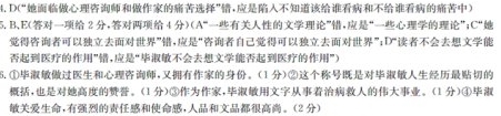 毕淑敏:从作家到心理咨询师(节选) (毕淑敏,从事医学工作20年后,开始专业写作。1998年,毕淑敏又步入北京师范大学心理系,开始进行心理学专业的系统学习。作家王蒙曾说,毕淑敏是“文学的白衣天使”) 主持人:经过北京师范大学这个学习的过程,所接触到的这些理论知识和您之前对人的内心的理解,最大的不同是什么? 毕淑敏:可能是我对人其实有了一个更真实的了解。 主持人:毕业之后您就和几个朋友一起开了一家心理诊所,那时候真的是想当心理医生了吗? 毕淑敏:一是掌握了这些理论的知识以后,特别想用于实践。再有一个,我那时候已经慢慢感觉到,其实在我们中国现在急速变化的年代里,人们特别需要心理帮助,我感觉到这是一种使命感吧。 主持人:对于所有的咨询者来讲,您对他们的帮助帮到什么程度,您自己就觉得满意了呢? 毕淑敏:我确认咨询者的内心经过成长,他们对心理问题已经有了一个比较清楚的思考,而且他们觉得可以离开咨询师独立去面对这个世界了。我们就结束咨询。 主持人:和几百个人面对面的交流之后,您对人的理解有变化吗? 毕淑敏:我变得更尊重人了,因为原来觉得,按照我的逻辑,这个事情是想不通的,觉得怎么会这样,太不可思议了。 主持人:两年的时间如果用来写一本书,可能至少要十几万或几十万人读到它,而您做心理咨询师只接触几百人,这个影响力会不会觉得小了一点? 毕淑敏:对我来说,我觉得自己的生命也是一个过程,我的生命曾经和几百个人的生命发生过如此深切的碰撞,这对我来说已经是非常宝贵的一份经历了。 (在做了两年时间的心理咨询师之后,毕淑敏又退出了这个行业,继续专注于文学的创作) 主持人:做过直接面对病人的那样的心理医生,后来为什么又不做了? 毕淑敏:因为来的人太多了,我不知道给谁看和不给谁看,我真的陷入一种特别大的愁苦之中了。我那时候其实面临一个挺痛苦的选择,也许我要换一种方式,把我的那种感悟和启示,用文字来表达,这样可能会有更多的人看到这些书,也许一句两句话可能会触动他们,可能会有更多的人分享。 主持人:这次心理学学习,对写作的影响又是什么? 毕淑敏:那种影响好像是一个潜移默化的过程,比如说我原来要写一个人物会非常辛苦地去设计他,对于人物,有的时候就会觉得有点不自信。现在是,现实中有一个现成的人,我只是把他描绘出来就行了。 主持人:文学作品能不能起到治疗的作用呢? 毕淑敏:我觉得在文学里其实是有多样人生的,如果我们在阅读过程中,能有同感,能有心灵的激荡,包括可能在某些方面改变我们对世界或者对自我的一些认识,我想这就是文学的功能之一。我写作时其实没有去想文学是否具有治疗的作用,我只是想,那些生活中的人物,他们感动过我,我愿意用文字把他们表达出来,和更多的人分享。 主持人:您不管是做作家还是做心理咨询师,都是在用不同的方式影响着一些人的生命,这是不是您做这些事情时一个心理上很大的成就感? 毕淑敏:一个生命和一个生命密切的接触,这个过程是神圣和庄严的,去从事这样的工作,我觉得有非常多的挑战,包括对我自己的反思,我也会有很多错误,很多不足,可是我依然对人和人之间这种亲密的联系,抱有非常高的敬畏和热情。 (选文略有删改) 4.下列理解和分析,不符合原文意思的一项是(3分) A.毕淑敏与人合开心理诊所的原因,一是想把理论用于实践,而是意识到中国正处于社会转型期,人们对心理咨询的需求越来越强烈。 B.两年时间,毕淑敏做心理咨询师,只帮助了几百人,而假如她写一本书却能让更多人读到它,但她觉得这段经历同样弥足珍贵。 C.毕淑敏认为文学如果能感染读者,引起读者心灵的共鸣,可能在某些方面能促使读者改变对世界或自我的认识,这是文学的功能之一。 D.毕淑敏做了两年心理咨询师之后,退出了这个行业,原因是来进行心理咨询的人很多,她面临做心理咨询师和做作家的痛苦选择。 5.下列对材料有关内容的分析和概括,最恰当的两项是(4分) A.毕淑敏在北京师范大学学习心理学,接触到一些有关人性的文学理论后,她对人的内心的理解发生了改变,对人性有了更真实的了解。 B.毕淑敏原来觉得按照她的逻辑,有些事想不通为什么会这样,不可思议,但是和几百人面对面地交流后,她变得更加尊重人了。 C.毕淑敏确认向她咨询的人经过内心的成长并对他们的心理问题已经有了一个比较清楚的思考,她觉得咨询者可以独立去面对世界,就结束咨询。 D.生活中有些人感动了毕淑敏,她用文字把感动她的人表达出来,和更多人分享。她认为,读者不会去想文学能否起到医疗的作用。 E.毕淑敏学习心理学之后,她的写作在不知不觉中受到了影响,比如原来写人非常艰难,现在写人比较轻松,她写作时更加自信了。 6.毕淑敏被作家王蒙称为“文学的白衣天使”,请结合材料,谈谈你对这个称号的理解。(5分) 参考答案 4、D 5、B 6、毕淑敏做过医生和心理咨询师,又拥有作家的身份。这个称号是对毕淑敏人生经历最贴切的概括,也是对她高度的赞誉。作为作家,毕淑敏用文字从事着治病救人的伟大事业。毕淑敏关爱生命,有强烈的责任感和使命感,人品和文品都很高尚。