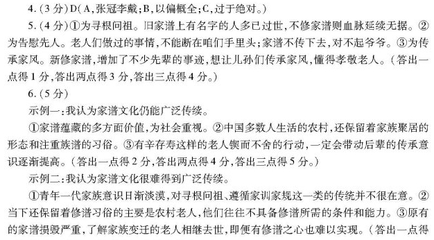 家谱传家风 央广网北京2月12日消息(记者牛萌 王涛李楠)寻根问祖,是中国的文化传统。家谱,延续着家族血脉,更传承着伦理规范、家风家训。如今,也许只在一些乡村,还保留了这一文化习俗,修谱人也大多是老人,他们走了,谁再来接续呢? 山西原平上院村,90%都姓辛。辛氏家谱70多年前修过,2002年,作为上一代修谱人的孙辈,辛存寿和辛根兰开始集资,新修家谱。 辛存寿介绍:“我们的旧家谱是1941年修的,辛根兰的爷爷辛在勤和我爷爷辛兆仁他们两个人为主,修成了家谱。到了2002年,我们又开始修。” 辛存寿把手仔细擦干净,解开正房厅堂几案上摆放着的新修《辛民族谱》侧面的黄丝带,捧起家谱,细说往事。“1941年印家谱时,上面有名字的人,到2009年6月发行新家谱的时候,老家谱上还有166个人在世。从2009年到现在,又去世了35个人……” 辛氏旧家谱历经战乱、文革,散失殆尽,时隔70多年重修家谱,困难重重。为修谱,辛存寿工作之余四处奔走。后期病重,调查时都说不了话,只能写在纸上,让别人念。 辛存寿说,八年能坚持下来,就是因为心里记着祖辈。当年,辛存寿的爷爷辛兆仁修家谱,就靠几十块墓碑。“当时找到碑以后,因为时间长了碑上面有土,字就看不清了。他就带一壶水,把这些碑冲了,洗出来,所有的字不一定都认得,他就把这个字照原样描下来。”时值隆冬,寒风刺骨,水浇到碑上,也浇到手上。“爷爷的手裂开一道道口子,整个冬天都无法愈合。”辛存寿说,想起祖辈,心里不平静,家谱不传下去,对不起爷爷。 辛存寿说,新修家谱,增加了不少先辈的事迹,像有一位叫栓恒的孝子,后代人都已不知道他的故事,这次把他的事迹写进家谱,就是想让儿孙们传承家风,懂得孝敬老人。 故事是这样的:六十年代的时候,有一天栓恒的母亲想吃一个冰棍,但村里面没有,他就跑到原平县里去买;没有保温杯,他就拿一块毛巾把冰棍包起来,放在茶缸里,回来冰棍全化了,他把毛巾拧出甜水来,让母亲喝了。 辛氏家族新家谱修成后的领谱大会,族人来了四五百,辛存寿特意让孩子们也参加。他说,老人们做过的事情,不能断在咱们手里头。 看着一本本家谱被大家恭恭敬敬领走,辛存寿觉得,可以告慰先人了。 【相关链接】 (1)青年一代家族意识日渐淡漠,是家谱文化将遭遇或已遭遇的真正壁垒。兰溪市图书馆副研究馆员李彩标担忧:“《家谱》收藏户主已由父祖辈开始向对家谱无多大兴趣的儿孙辈交替,而年轻人对家谱的存放、借用、翻晒等并不重视,所以家谱损毁较多。”(陈宣章《十谈<家谱>》) (2)2016年3月4日,“常州市家谱档案馆”正式挂牌。这是全国首个家谱档案馆,是由市档案局和家谱收藏爱好者朱炳国合作建立的,该馆的成立是政府部门和民间收藏者为了保护档案而进行的一次有效探索。馆内珍藏新老家谱近千套,计10000余册,涉及江南地区100多个姓氏。同时,还有部分古老的谱牒木刻雕版。 家谱蕴藏着大量有关人口学、社会学、民族学、经济学、人物传记、宗族制度及地方史等资料。因此,家谱不仅具有教化作用,还具有珍贵的史料价值。(《常州晚报》 20160305第A03版,有删改。) 4.下列对本篇报道的概括与分析,正确的一项是(3分) A.辛存寿为修家谱,四处奔走,心里记着祖辈,就算病重也没有放弃,坚持了八年,靠着几十块墓碑,艰难地完成了家谱的修订。 B.辛存寿特意让孩子们也参加领谱大会,就是为了让孩子们体会长辈们修谱的辛苦,希望孩子们能够珍惜来之不易的家谱。 C.传统的修谱习俗,现代只在一些乡村得以保留,且修谱工作基本没有年轻人参与。上院村家谱传承的现状正是普遍的写照。 D.本文不同于一般新闻报道的客观呈现,而是以小见大,通过辛家修谱的故事,让主人公现身说法,表达对文化传承的深沉忧虑。 5.面对重重困难,辛存寿为什么坚持要新修家谱?请简要分析。(4分) 6.当代中国,家谱文化还能不能广泛传续?请结合文本谈谈你的看法。(5分) 参考答案 4、D 5、为寻根问祖。为告慰先人。为传承家风。 6、示例一:我认为家谱文化仍能广泛传续。