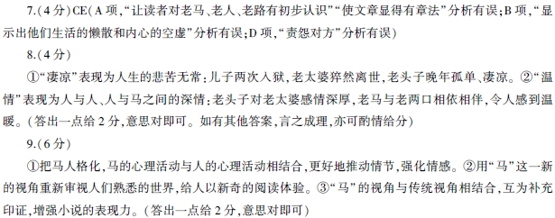 一匹马两个人 迟子健 一匹老马拉着两个老人,朝二道河子方向走。 马是瘦马,走起路来就难免慢慢腾腾的。两个老人,是一对夫妻。老头子跟老马一样瘦,老太婆则像个大树墩一样胖。他们都是小眼睛,是那种懒得睁开的、老是处在半梦半醒间的小眼睛,尤其是老太婆。因而有的时候,马觉得老太婆是没长眼睛的人。 二道河子离他们居住的村庄有二十里路。这条路,马不知走了多少趟,也不知走了多少年,只记得以前背上吃了主人数不清的鞭子。马还记得,他们的儿子第一次被人用手铐带走时,哪怕是走在没有辎重的平道上,它也要挨上几十道鞭子。而他第二次戴着手铐被人带走后,他们对它则温情多了,夜里不忘了喂点豆饼给它吃,女主人还常常用一把刷子给它理鬃毛,仿佛把它当成了他们的儿子。 同以往一样,坐在车辕的男人垂着头袖着手打盹,车尾的老太婆则躺着睡觉。他们不用担心马会走错路,因为去二道河子只这一条路。他们也不用担心马会受惊,因为这个季节没有其他的车辆过来。马呢,它知道两个人都在迷迷糊糊地睡,所以它若遇见笔直的路段时,也抽空打一下盹,它老是觉得累。 马打了一个响鼻,示意二道河子已经到了。果然,老头子下了车,他先用乎抚摩了一下汗涔涔的马,无限怜惜地说:“唉,瞅瞅你这一身的汗,真让我不忍心再使唤你了。”说着,他回头去看车尾的老伴。 “老太婆,你到哪里了,我看不见你,你给我个音呀!” 老头子叫道。 老头听不见老太婆的声音,他急了,仔细地看看周围,也不见人影。他这才明白,老太婆丢了。他责备自己太粗心,边掉转车头,折回去寻找。 马听见老头呼唤老太婆,已经明白了。尽管它已经累得眼花缭乱了,还是加快了步伐。可是老头还是嫌它走得慢,他没有鞭子,就下车折了一根柳条,不停地抽它。马虽然疼痛难耐,但仍闷着头,拼命快走。老头子并不领情,心急火燎地持续抽它。 大约走了四里路,他们发现了老太婆,她横躺在路上。老头叫了一声:“你怎么睡在路上了,吓死我了。” 马满身是汗,疼痛难忍,四条腿没有一条不在打哆嗦。它不像老头子那么乐观。 果然,老头子发现老太婆的额头都是血,而地上也是血迹斑斑。老头试了试她的鼻息,一点呼吸都没感觉到,再摸她那双粗糙的手,已经冰凉如秋日的河水。 当老头子看见路面有一块凸出来的像笋尖一样的带有血迹的石头时,他咆哮着,使劲踢那石头,而石头就龇着血红的牙望着老头子。老头子从车上取下镐头,奋力砸那石头,石头迸溅出一串串火花,瞬间分崩离析。 他们朝那村庄走去。 一块这么不起眼的石头就要了她的命,老头子想不明白。她落地后是不是呼唤他了?可惜他耳朵不如年轻时灵便了,而且马车一旦走起来,听到的只是马蹄声。他这样一想,就有些怨恨马了。 而马呢,也走得心事重重。它在责备自己。一定是因为它走路不如以往利索,腿常常抖一下,车也随之颠簸一下,相必她就是这么被颠倒地上的。而且,在拉扯的过程中少了分量,它应该有所觉察的,可它什么也没有察觉到。它是个废物了。马觉得自己最好就此不要吃草了,就这么晚结算了。 老马就在那一天水草未尽,老头子也是粒米未食...... (节选自迟子健《一匹马两个人》有删减) 7.下列对小说相关内容和艺术特色的分析鉴赏,最恰当的两项是(4分) A.开头一段如特写镜头,把读者带入悠远的情境中,让读者对老马、老路有初步认识;同时引领全文,使文章显得有章法。 B.眼睛是心灵的窗户,两位老人“懒得睁开的、老是处在半梦半醒间的小眼睛”显示出他们生活的懒散和内心的空虚。 C.老头子垂着头袖着手打盹儿,老太婆躺在车尾睡觉,老马也抽空打个盹儿,这些描写都为老太婆出现意外和没及时察觉埋下伏笔。 D.在朝村庄走去的路上,小水细腻地刻画了老头子和老马深深自责又责怨对方的心理,这这使他们的形象更加鲜明。 E.本文讲述了一匹马和两个人的故事,老人和老马相伴的平静生活被一块石头突然打破,情节简单,语言质朴,缺耐人寻味。 8.小说讲述的故事“凄凉但不乏温情”,请结合具体内容进行分析。(4分) 9.除使用传统叙事视角外,小说还刻意选取了“马”的视角。从“马”的视角叙事,有什么作用?请简要分析。(6分) 参考答案 7、CE