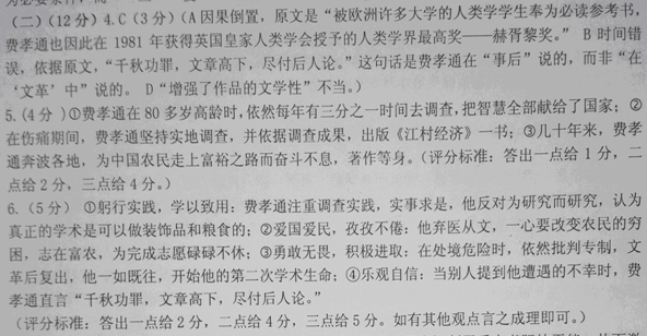 社会学及人类学大师——费孝通 1910年11月2日费孝通出生于江苏省吴江县松林镇。由于受到曾留学日本的父亲和喜欢新思想的母亲的深刻影响,费孝通在蒙童时代就开始接受了不同于传统教育的新式教育。 1928年,带着医学救国的理想,费孝通进入东吴大学学习医学,但是没过多久,他发现当时中国的很多问题光靠医学是不能解决的,而是要首先解决人的问题。于是在1930年,在北京燕京大学社会学系系主任许仕廉的影响下,他注册进入了燕京大学社会学系,开始了他的学术人生。 1935年夏,在老师吴文藻的推荐下,费孝通应当时的广西省政府之邀赴大瑶山开始了广西特种民族考察。考察中,费孝通误入瑶人设下的“虎阱”,身受重伤,在养伤期间就开始进行了对中国江南村落小社区的田野调查。1936年秋,费孝通带着他养伤期间的调查结果远赴英伦深造。在导师马林诺斯基的指导和鼓励下,根据出国前的社会调查成果,完成了他的成名大作——《江村经济》。在书中费孝通通过对乡土中国的描述,从历史的变迁中进行客观调查分析,认为小城镇包含有中国特色的农村发展大问题。《江村经济》于 1939年在伦敦出版后,被欧洲许多大学的人类学学生奉为必读参考书。费孝通也因此在1981年获得英国皇家人类学会授予的人类学界最高奖——赫胥黎奖。 1946年7月,李公仆、闻一多被暗杀后,费孝通面临的处境十分危险。但是费孝通并没有因此就放弃了对专制的批判,他在在《这是什么世界》一文中写到:“一个国家怎能使人人都觉得自己随时可以被杀!人类全部历史里从来就没有过这种事。我们如今活在什么样的世界里?” 1957年费孝通因创作《知识分子的早春天气》被错误地划为右派,成了在《毛泽东选集》中被点了名的人物;“文革”中,受到反革命集团的迫害,住牛棚、下干校,一切学术研究活动都被迫停止,直到1979年复出。当事后有人对这段不堪回首的历史作出上联“早春前后,大江南北,一例前生事”请他对时,他慨然对曰:“千秋功罪,文章高下,尽付后人论。” 20世纪80年代中期,费孝通开始了他的第二次学术生命。作为一个社会人类学家,费孝通已是八十多岁的高龄,但他每年都花三分之一的时间去搞调查,他边行走,边调查,边思考,他多次提出改变穷困地区的重要建议,把他的智慧全部献给了祖国。正如他晚年所写的《江村偶读》一诗:“李白六十二,杜甫五十九。我年已古稀,虚度岂可究?梦回苦日短,碌碌未敢休。文章千古事,万顷一沙鸥。” 2005年4月24日22时38分,费孝通结束了他半个世纪无愧于心的考察,中国失去了一位杰出的知识分子,中国知识界蒙受了巨大的损失。但是,“逝者如斯,而未尝往也”。 作为著名社会学家、人类学家、社会活动家,中国社会学和人类学的奠基人,费孝通用生命、劳动和乡土完美结合的爱国情怀是最不怕岁月冲刷的。 (摘自《大师中国》,有删改) 【相关链接】 ①在他80岁生日那天,有人问他一生中最有意义的是什么,他说志在富民。他的学术是为人民服务的学术,他说:“我所知道的是真正的学术,是有用的知识,学术可以做装饰品,也可以做食粮的。”他“反对为研究而研究,为理论而理论,为定量而定量”。 (王超华《一代宗师费孝通》) ②他一生的志愿就是如何使一穷二白的中国农民走上富裕之路,并为此奋斗不息。几十年来,他奔波于全国各地,调查研究,著书立说,影响深远。其主要著作有:《江村经济》《乡土中国》《行行重行行》《学术自述与反思》《中华民族多元一体格局》《重访英伦》等。 (蒋晔、武京予《费孝通》) 4.下列对材料有关内容和写法的分析和概括,正确的一项是(3分) A.费孝通在1981年获得英国皇家人类学会授予的赫胥黎奖,因而他的成名作《江村经济》被欧洲许多大学的人类学学生奉为必读参考书。 B.在“文革”中,费孝通受到反革命集团的迫害,但他慨然说:“千秋功罪,文章高下,尽付后人论。”可见,他并没有被历史的漩涡吞没。 C.费孝通能成为社会学及人类学大师,既有父母和系主任许仕廉的影响,也与老师的帮助和鼓励分不开,还和自身的追求及努力息息相关。 D.文中多次引用费孝通的话,增强了作品的真实性和文学性,突出了人物的特点并丰富了传主的思想精神,同时使传记具有更为感人的力量。 5.“梦回苦日短,碌碌未敢休。”这句诗在费孝通的一生中是如何表现的?(4分) 6.作为社会学及人类学大师,费孝通身上有哪些可贵品质?请结合材料简要分析。(5分) 参考答案 4、C 5、费孝通在80多岁高龄时,依然每年有三分之一时间去调查,把智慧全部献给了国家;在伤痛期间,费孝通坚持实地调查,并依据调查结果,出版《江村经济》一书;几十年来,他奔波各地,为中国农民走上富裕之路奋斗不息 6、躬行实践,学以致用;爱国爱民,孜孜不倦;勇敢无畏,积极进取;乐观自信。
