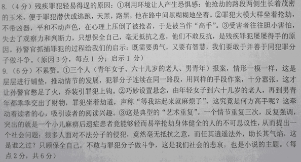 关于多起抢劫案 老邱 孙警官接到报案后,感觉到了案情的严重:罪犯居然不带凶器,大模大样地坐在路中间,只一句:“把钱和值钱的东西放下,等我站起来就麻烦了。”就把行人的财物给劫了。 报案人是个青年女子,她是在下夜班的路上被劫的。那个女子面带惊恐,在孙警官的面前还不断地发抖,她边哭边说:“天也黑,路也黑,那个劫道的,坐在路中间,我骑着自行车,差一点撞了他。他说话的口气并不很横,还有点像商量。” “那你就把钱和金项链给他了?”孙警官有些不理解,“他又没拿刀,也没用枪逼你。”“我怎敢不给他?他不带凶器劫道,这说明他肯定是个高手。” 孙警官做过笔录,跟报案人来到现场,那是周庄到县城必经之路的中段,全长约两公里,路两侧生长着茂密的玉米。孙警官在案发现场查看了好一阵,没发现罪犯留下的任何 踪迹后,又扩大了搜索范围,他想在玉米地里找到罪犯在作案前潜伏过、或作案后穿越玉米地逃跑的路线,结果,还是一无所获,孙警官决定蹲守。 一连几夜的蹲守,没有出现任何情况,计划便撤消了。孙警官又从周庄开始排查,可周庄连一个有劣迹的人都没有,连周庄公路沿线的县城居民中,有过前科的有几个,可均没有作案时间。案子只好搁下。 这天早上,孙警官刚到办公室,一位六十几岁的老人,由儿子陪着,来报案,说是昨晚,老人骑自行车夜里从县城到周庄,半路被劫了,1000多元钱归了那个抢劫犯,作案经过和那个青年女子被劫一模一样,罪犯也是坐在路中间,只说一句:“把钱和值钱的东西放下,等我站起来就麻烦了。” 孙警官说:“你才六十几岁,身体这么棒,怎么没反抗呢?” “你说的轻巧,那贼人胆敢不拿家伙,还坐着,绝对是个高手。”老人心有余悸地说。 孙警官扩大了排查范围。因罪犯是在夜里作案,又是坐着,被害人无法提供体貌特征,调查陷入僵局。 时隔几日,又一个男青年报案。他的金戒指和50元钱被劫,作案地点、作案手段,与前两起案件丝毫不差。孙警官有些冒火:“你年轻力壮,怎么不反抗?”男青年说:“他坐着劫道,不拿刀,也不带枪,证明他是有准备的,说不定玉米地里还有他的同伙呢!我可决不会为了一个金戒指搭上一条命。” 孙警官和办案人员再次蹲守多日,还是无功而返。 那条路上在平静了数日后,又接连发生了几起抢劫案,罪犯用的都是同样的手段。 这次孙警官憋足了火,他每天夜里,换上女人的衣服,骑上自行车,沿那条公路往返几次,勾引罪犯上钩。工夫不负有心人,在第6天的夜里,当孙警官骑车至多次案发路段时,路中间黑糊糊坐着一人,那人不动声色,看孙警官近了,就说:“哎!哎!哎!把钱和值钱的东西留下,等我站起来就麻烦了。” 孙警官装出吓坏了的样子,哆哆嗦嗦地往怀里掏,他想让罪犯以为是因为害怕掏不出来,从而赢得时间观察一下是否有同伙。孙警官哆嗦了半天,也掏了半天,既没有罪犯同伙的出现,罪犯也极有耐心地等着。孙警官这才放心大胆地掏出手枪,对准罪犯的脑袋,大喊一声:“我是警察,把手举起来,你被捕了。” 罪犯乖乖地举起了双手,但依然坐着。孙警官的怒火一下就顶了上来:“你还挺牛,站起来!” “我早就跟你说了,等我站起来就麻烦了。”罪犯说的很平和,也没有动。 孙警官顿时警觉起来,以为罪犯站起来是什么信号。他抓紧手枪,掏出手电四下里照照,没发现什么,回头踢了罪犯一脚,说:“你给我站起来,我倒要看看是怎么个麻烦法。” 在孙警官的逼迫下,罪犯艰难地从屁股底下摸出一副拐杖来,晃晃悠悠地站起。这时孙警官才看清,罪犯原来是个小儿麻痹后遗症的患者。 (选自《感动中学生的100篇微型小说》) 7.对小说思想内容与艺术特色的分析和鉴赏,不正确的两项是(4分) A.孙警官假装害怕是为了赢得时间观察罪犯是否有同伙,确认没有同伙才掏出手枪,可见,他的性格是勇敢而不失谨慎。 B.“案子只好搁下”,“调查陷入僵局”,“孙警官和办案人员再次蹲守多日,还是无功而返”,从侧面写出了罪犯是个穷凶极恶、狡诈无比的惯犯。 C.小说的三个报案人的顺序安排是很讲究的,青年女子、六十几岁的老人和男青年,一个比一个强壮,但都没有一丝反抗,由此提示了小说的主题。 D.小说结尾表明罪犯原来是个小儿麻痹后遗症患者,读者到此才恍然大悟,坐着劫道和“等我站起来就麻烦了”的秘密得以揭开,受害者竟不敢反抗显得更加令人悲哀。 E.小说将罪犯的平和与受害者的惊恐进行对比,目的是批评和讽刺受害者的胆小无能,从而激励人们要不怕牺牲,勇于与不法分子做斗争。 8.小说中的残疾罪犯为什么能轻易得逞?请简要分析原因。孙警官抓捕罪犯的过程给我们什么启示?(4分) 9.全文一共写了三个人(青年女子、六十儿岁的老人、男青年)报案,情形一模一样。这样写是否累赘,为什么?(6分) 参考答案 7、BE (B“穷凶极恶”错;E“目的是批评和讽刺受害者的胆小无能,从而激励人们要不怕牺牲,勇于与不法分子做斗争” 错)