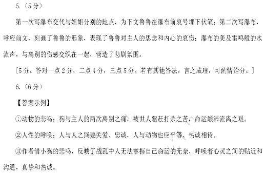 鲁鲁(节选) 宗 璞 鲁鲁原是孤身犹太老人的一只狗。老人前天死去了,他的死和他的生一样,对人对世没有任何影响。后事办完了,这矮脚的白狗却守住了房子悲哭,人们打他,他也不肯离去。房东灵机一动说:“送给下江人范先生养吧。”这小村中习惯把躲避战乱到当地的外省人一律称作下 江人。于是他给硬拉到范家,拴在大树上。 晚上,鲁鲁坐在地上,悲凉地叫着,声音更带着十分的痛苦、绝望,像一把锐利的刀,把山村的春夜剪碎了。 房门开了,两个孩子走了出来。6岁的弟弟捧着一钵饭,对鲁鲁说:“鲁鲁,你吃饭吧,这饭肉多。”10岁的姐姐温柔地说:“鲁鲁,你就住在我们家吧。拉拉手吧?”这话今天姐姐已经说了好几遍,鲁鲁总是发出一阵悲号,并不伸出脚来。姐姐伸手去摸他的头,鲁鲁一阵颤栗,连毛都微耸起来。这只小手很轻,但却这样温柔,使鲁鲁安心。他咻咻地喘着,向姐姐伸出了前脚。 “好鲁鲁!”姐姐高兴地和他握手。“爸爸妈妈!鲁鲁愿意住在我们家了!” 爸妈走出房来,在姐姐介绍下扣鲁鲁握手。妈妈轻声责备姐姐说:“你怎么把肉都给了鲁鲁?我们明天吃什么?”弟弟忙说:“明天我们什么也不吃。” 过了十多天,鲁鲁情绪显然已有好转。有一天,鲁鲁出了门,踌躇了一下,却忽然往山下城里跑去了。他要去解开一个谜。 黄昏时他进了城,在一座旧洋房前停住了。他坐在门外,不时发出长长的哀叫。这里是犹太老人和鲁鲁的旧住处。主人是回到这里来了罢?怎么还听不见鲁鲁的哭声呢?有人推开窗 户,有人走出来看,但都没有那苍然的白发。鲁鲁在门口蹲了两天两夜。第三天早上,人们气愤起来,拿来绳索棍棒下决心要处理他。他又饿又渴又累,看着屋门,希望在这一瞬间老人会走出来。但是没有。这时他想起了那温柔的小手,便跳起身,冲出重围向城外跑去了。 姐弟俩很难过,傻鲁鲁!怎么能离开爱自己的人呢!你一定会回来的吧。 他们终于等到了鲁鲁回来。姐姐冲过去弯身抱着他的头,他舐着姐弟俩的手,又给爸爸妈妈作揖。那晚全家都高兴极了。 从此鲁鲁正式成为这个家的一员了。 日本投降的消息传来的那天,整个小村沸腾了。一家人紧紧抱在一起,他们终于可以回北平去了。但路途遥远,交通不便,鲁鲁是不能去的。最后的决定是把他送给T市爱狗的唐伯伯。 T市附近,有一个著名的大瀑布,l0里外便听到水声隆隆。车经这里的那天,姐姐发着 烧,还执意要下车去看。于是爸爸在左,妈妈在右,鲁鲁在前,弟弟在后,向观瀑亭上走去。 急遽的水流从几十丈的绝壁跌落下来,在青山翠峦中形成一个小湖,水气迷蒙,一直飘到亭 上。姐姐觉得那白花花的厚重的半透明的水幔和雷鸣般的轰响仿佛离她很远。她努力想走近些看,但它们越来越远,什么也看不见了,倚在爸爸肩上晕了过去。 姐姐因病住进了医院,从此鲁鲁再也没有看见姐姐。没有几天,他就显得憔悴,白毛失去了光泽。唐家的狗饭一律有牛肉,他却嗅嗅便走开,不管弟弟怎样哄劝。 范家人走时,唐伯伯叫人把鲁鲁关在花园里。在飞机上,姐姐和弟弟为了不能再见鲁鲁,一起哭了一场。他们听不见鲁鲁在花园里发出的撕裂了的嗥叫,看不见鲁鲁因为一次又一次想挣脱绳索,磨掉了毛的脖子。他们飞得高高的,遗落了儿时的伙伴。 鲁鲁发疯似地寻找主人。唐伯伯总是试着和他握手,同情地、客气地说:“请你住在我家,这不是已经说好了么,鲁鲁。” 有一天,鲁鲁又不见了。过了半年,大家早以为他已离开这世界,他竟又回到唐家。他瘦多了,身上好几处没有了毛。他又一次去寻找谜底后,又历尽辛苦回来,只是为了不违反主人的安排。 但后来他却有了观赏瀑布的癖好。他常常跑出城去,坐在大瀑布前,久久地望着那跌宕跳荡、白帐幔似的落水,发出悲凉的、撞人心弦的哀号。 4.下列对文中相关内容和艺术特色的分析鉴赏,最恰当的一项是 (3分) A.本文运用了拟人手法,赋予小狗以人的心理,细腻地描摹小狗鲁鲁的内心活动,使读者能真切地感受到小狗内心复杂的情感。 B.鲁鲁去城里的旧住处守候旧主人,最后又回到范家,只是因为他遭到了人们的驱赶,再加上饥渴疲累,这让读者看到了他的痛苦和无奈。 C.去到唐家后,鲁鲁得到了很好的优待,但他并不吃那一律有牛肉的饭,这反映了鲁鲁对新主人的不满,以及对旧主人的忠诚。 D.文章以鲁鲁第一次丧家的哀号开篇,又以它第二次丧家的哀号结束,首尾呼应,对小狗被无情抛弃的悲剧命运寄予了无限的同情。 5.文中两次写到了瀑布,有什么作用?请结合文本简要分析。(5分) 6.著名作家孙犁评价《鲁鲁》:“表面是动物的悲鸣,内含是人性的呼喊。”请结合文本谈谈对这句话的理解。(6分) 参考答案 4、A