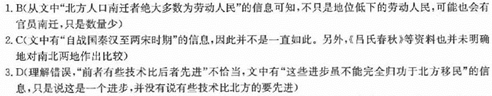 史上三次大规模人口南迁对南方地区的影响及其意义 刘铮 魏晋南北朝时期,中原人民为避战乱开始了中国历史上的第一次人口南迁的历程,北方人民的南迁为南方农业生产增加了大批劳动力,特别是带来了先进的生产技术和生产工具,他们同南方的汉族人民及山越等少数人民共同兴修水利,开垦出大片良田,水稻栽培技术有所提高,小麦开始推广,牛耕得到普及。隋唐五代这一时期,南方经济继续发展,“安史之乱”后伴随着第二次人口南迁,南方农业、手工业、商业、对外贸易都呈现出前所未有的发展势头,史称“天下大计,仰于东南”。两宋时期,南方经济呈现出繁荣的景象,在“靖康之乱”后,随着第三次的人口南迁的高峰出现,南方的粮食产量、农业技术、手工业技术与规模、商业贸易、城镇数量都超过了北方,江浙一带已经成为全国粮仓地带和最大的纺织中心和商业中心,同时经济重心南移的历史进程也终于完成。 北方人口南迁者绝大多数为劳动人民,他们来自封建经济文化高度发达的黄河流域,拥有比较先进的生产技术和丰富的劳动经验。从《吕氏春秋》、《四民月令》等文献资料中可以清楚看到,自战国秦汉至两宋时期,黄河流域的生产技术水平已经达到相当的高度。相比之下,同一时期的长江中下游平原及以南地区则要落后得多,北方人口南迁将黄河流域的先进生产技术与工具带到长江流域,必然推动这一地区的农业与手工业生产。有些南方地区开始实行区种法,并开始采取轮作复种制。这些进步虽不能完全归功于北方移民,但是北方移民所起的突出作用,是应该得到充分肯定的。 北方人口的大量南迁给南方地区带来了大量的劳动力。在南迁过程中,能够顺利到达南方地区并且能生存下来的,多为一些青壮年,他们能够承受一路南迁的颠簸与艰辛,同时他们也是廉价的劳动力。当时南方的士族地主阶级具有从事土地开发的强烈冲动,他们迫切要求开发江南,建立强大的经济基础,以增强南方的军事力量。北方南迁人民来到南方地区后,两手空空,一无所有,而政府无法解决他们的生计问题,所以士族有需要劳动力来开发山川泽林的积极性,南迁人民有需要解决生计问题的积极性,在这两个积极性的推动下,终于使南方地区的面貌焕然一新。 中国古代历史上的三次大规模的人口南迁和其所带来的中国经济重心的南移过程,是南方地区逐步开发、发展的历程,它改变了黄河流域“一枝独秀”的历史现象,使南方摆脱了“荆榛遍野,刀耕火种”的原始状态,经济得到飞跃发展,进而后来居上,成为全国经济最发达的地区,对中国经济的格局产生了深远影响。经济重心的南移也带动了全国经济的发展,中原地区先进的生产技术向南传播,进而向边疆地区渗透,使各地经济的发展趋于平衡,并且南方经济的发展也拉动了北方经济的发展,促进了全国经济的整体发展。而且,人口的南迁促进了我国古代的民族融合,使各族人民交错杂居,接触频繁,甚至互通婚姻,大大促进了民族融合。 (摘编自中“国国学网”作者同题文章,略有删改) 1.下列关于原文内容的表述,不正确的一项是(3分) A.中国古代历史上的三次大规模人口南迁不是人们的主动行为,而是战争、动乱等原因被迫进行的。 B.从北方迁往南方的人员都是地位低下的劳动人民,而具有一定权力的官员没有迁移到陌生的南方。 C.从北方迁到南方,路途遥远,需要承受一路南迁的颠簸与艰辛,因此,老人和小孩子能顺利到达南方的很少。 D.原先,北方地区的经济要比南方地区的经济更发达,但随着三次大规模人口南迁,南方地区的经济超过了北方地区。 2.下列理解和分析,不符合原文意思的一项是(3分) A.随着南方地区的开发、发展,南方逐渐改变了“荆榛遍野,刀耕火种”的原始状态,经济后来居上,打破了黄河流域“一枝独秀”的经济格局。 B.面对一无所有的大量南迁人员,南方当地政府无力解决他们的生计问题,此时,南方士族地主阶级刚好迫切需要劳动力。 C.一直以来,黄河流域的生产技术水平比长江中下游平原及以南地区要发达得多,这一点,《吕氏春秋》等文献资料中有明确的记载。 D.中原地区先进的生产技术随着人口南迁而向南传播,再向边疆地区渗透,拉动了当地经济的发展,为各地经济的发展趋于平衡作了贡献。 3.根据原文内容,下列说法不正确的一项是(3分) A.魏晋南北朝时期人口南迁后,南方的农业生产有所发展;隋唐五代时期人口南迁后,南方的农业、手工业、商业等都有了较大发展。 B.古代历史上的三次人口南迁带来的不仅是南方经济的崛起,也使我国古代各民族之间频繁互通,从而促进了民族大融合。 C.南方士族地主阶级具有开发江南的积极性和北方南迁人民有需要解决生计问题的积极性,促进了南方地区的经济发展。 D.虽然在经济重心南移前南方地区的劳动经验等与北方劳动人民的相比要逊色很多,但是前者有些技术比后者先进。 参考答案 1、B 2、C 3、D