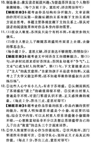 价值 刘永飞 苏国良还没回到村里,却已成为村人的笑柄。 起初,村人将信将疑,可是待苏培盛回来之后,一切得到证实,原来苏国良还真是个“二百五”。 苏培盛是腊月二十七的下午回到村子的,当晚已有多家备宴来请。席宴间,主人极尽奉承之能事,说他是村里的致富带头人,还说什么“国有邓小平,村有苏培盛”。 苏培盛听了这句话,噗的一声吐出酒菜,差点笑岔了气儿。他说,这是哪儿跟哪儿呀,我是一小偷,能和邓小平比吗? 主人说,“别管黑猫白猫,逮住老鼠就是好猫”,这不是邓小平说的么,别把自己说得那么难听。你看看这几年村里起了多少高楼,哪一栋不比外村的气派,这都是您的功劳呀,要不然,光凭他们出去打打工能盖起这样的楼?下辈子吧。再说了,这都啥年代了,小偷咋啦,我看比那些贪官污吏高尚多了,还是那句话,能抓住老鼠的就是好猫! 酒肉吃完,好话说尽,主人这才借着酒动儿说出了自己的小九九。说什么自家的孩子不是读书的料,又说考上了大学又能怎样呢,还不如趁早跟你培盛叔出去历练历练。 话都说到这份上了,苏培盛自然无法拒绝,他吐掉牙签说,行,年后跟我走,只要别学苏国良就成。 不会的,不会的,酒桌旁一直沉默寡言的后生信誓旦旦地说。 酒足饭饱,苏培盛打着嗝,在主人一家的簇拥下,歪歪斜斜地走了。 一年前的这一天,苏培盛也是这样从苏国良的家里走出来的,那时候和现在唯一不同的是,苏培盛眼里噙着泪花,他在门口心情复杂地拍了拍苏国良的肩膀说:“放心跟我走,今后有我吃的就有你吃的。” 可是,谁都没有料到平日里并不憨傻的苏国良第一单“买卖”就搞砸了。在这之前,苏培盛在技术和心理上亲自培训他。在培训心理时,苏培盛说,干这行最重要的是不能紧张,要装得跟没事儿人似的。 他还说,别怕被人抓住,你要谨记,现在已不像早些年,如今管闲事儿的人越来越少了。当然,即使碰到个“愣头青”也没关系,咱们人多,稍微一打掩护就能脱身。 那是个星期天,一个妇女怀抱着一个哭个不停的婴儿去医院,幸运的是一车人没一个给她让座的,这就大大降低了“做活”的难度。 更可喜的是,那妇女从口袋里取纸巾时忘了拉拉链,厚厚的皮夹子裸露在外,这可真是无赐良机!可是,就是这闭上眼睛也能十拿九稳的活儿,愣让苏国良搞砸了。 煮熟的鸭子飞了,飞就飞了吧,尽管小组成员对苏国良不满,苏培盛还是替他说好话,他说,谁没个第一次呢。 其他成员问苏国良那么容易的事儿为什么不伸手,他说觉得良心上过意不去,还说一看就是乡下来的,没了钱孩子的病怎么办?那不是要人家的命吗? 他这么一说大家都不乐意了,他们说敢情就你有良心,有良心你还干这行? 这次也就算了,关键是接下来的几单活儿全砸了。做贼不偷东西,在团伙里是大忌,你总不至于让别人养吧。 促使苏培盛让他离开的是后来发生的一件事儿,那次,也是在公交车上,偷窃对象是个老人。苏培盛知道苏国良的毛病,只让他打掩护,可是就当自己人逼近老人时,苏培盛却清晰地看到苏国良趁一个刹车,猛地将老人撞了一个趔趄。老人警惕了,生意又砸了。 看着小组成员一张张愤怒的脸,苏培盛平静地说,国良,你走吧。可,他是个老人呀,我实在不忍心……好啦,苏培盛打断了他的话,他说,我需要的是个能偷东西的贼,而不是个有良心的人! 这不,苏国良离开的消息传到村里,村人的嘴巴都快笑歪了,他们说:“良心,良心能值几个钱,他们家祖孙三代倒是都讲良心,结果呢,穷得连个婆娘都找不到……” 新年到了,归来的人都在庆祝一年的收获,唯有苏国良家冷冷清清。去年的今天父亲还在,甚至老父亲求苏培盛的情景还历历在目。 父亲说自己无能,连给孩子找个媳妇的本事都没有,他希望苏培盛能把苏国良带出去。他知道,父亲说这番话时,内心一定很痛苦。 野外,爆竹声四起,许多人家都在拜祖。直到夜幕降临,苏国良才买了纸,默默地去了祖坟,他要请列祖列宗回家过年。 远远的,他见自家的坟地里有火光跳动。这么晚了,谁会来我家坟地呢?走近了,他看到一个身影堆坐在父亲坟前。火光暗淡下来,眼前一片模糊。 “二爷,您千万别怨我,不是我不收国良,而是我不忍心看他变成一个跟我一样的人,二爷,我虽不讲良心,可是我知道良心金贵呀。当初要不是您在大灾之年宁可全家饿肚子也要来救济我这个孤儿,怕是我的尸骨早就没了呢。二爷呀,今天这世道坏啦,不是良心不值钱了,是良心太贵重了,一般的人已经拥有不起了……” 这是苏培盛的声音,苏国良听着听着,再也忍不住地蹲在地上“呜呜”地哭起来。 (选自《小说月刊》2014年第8期) 10.第一段写“苏国良还没回到村里,却已成为村人的笑柄”的作用是什么?(4分) 11.结合语境,解释下面句中加点词语的含义。(4分) (1)原来苏国良还真是个“二百五”。 (2)主人这才借着酒劲儿说出了自己的小九九。 12.文中描写以“主人”为代表的村里人奉承宴请苏培盛,有什么作用?(6分) 13.结合全文主题,谈谈本文标题“价值”的含义。(6分) 参考答案 10、制造悬念,激发读者阅读兴趣;为塑造苏国良这个人物形象做铺垫。 ![]() 13、穷人致富要以良心作为价值底线。世风败坏、歪门邪道没有价值可言。坚守良心,坚持正义才是真正的价值。