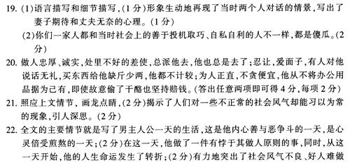 不寻常的一天 『俄罗斯]弗·格列恰尼诺夫 和往常一样,这天也没什么特别的,上午、下午都过去了,现在是晚上,接着就该是深夜了。列夫·尼古拉耶维奇用自己的钥匙打开了家门,走进厨房,坐到了桌旁。 ①“怎么了?”索涅奇卡用期待的目光看了一眼丈夫说,“你还去?”列夫·尼古拉耶维奇很内疚地叹了一口气,没出声。 “我早就料到了。”索涅奇卡说完就去卫生间洗被罩去了,也是去那儿偷偷地哭去了。自己动手洗被罩是因为不喜欢去洗衣店,哭是因为刚才提到了丈夫又要出差很长时间,这是他今年第三次出差了。丈夫这次要去特穆塔拉坎,离这儿很远,连一家像样的旅馆饭店也没有。而最让人气愤的是,只在有这种差事的时候,处里才会想起列夫·尼古拉耶维奇这个人。列夫·尼古拉耶维奇又是一个爱面子的人,让他去就去。办公室领来的办公用品,什么稿纸啊,还有其他一些不值钱的什么东西呀,同事们都统统拿回家去了,只给他剩些带格子的账本。等工作中需要那些东西的时候,他只好去学生用品商店买,还得自己掏腰包。有一次,他在家讲了这件事,打这以后,原来一直在心里暗暗恨他的丈母娘也就不再隐瞒对他的态度了。 “你嫁了个傻瓜,”有时候甚至当着他的面,丈母娘就这么跟女儿索涅奇卡说,②“你看看,他像谁?你像谁?你们的孩子又像谁?” 这些话让列夫·尼古拉耶维奇感到特别委屈和不公平。列夫·尼古拉耶维奇本人像一个地地道道的主任工程师,这也正符合他的身份;妻子则完全像一个经济学家,这也和她的职业相当;孩子们有的地方像他,有的地方像索涅奇卡,更像这个世界上其他的孩子。 列夫·尼古拉耶维奇活得不太舒心。公交车上有人对他说话无礼,售货员卖给他东西总是缺斤少两,因为他从不看秤,他认为这不体面,即使看了,也不出声。不过,只有一次,他没忍住,说了出来。回到家,他对妻子说,他替售货员感到羞耻。听了这话以后,本来就沉默寡言的索涅奇卡更没动静了,连着两个星期没说话。 这时,索涅奇卡红肿着眼睛从卫生间里出来了,默默地找出一只旅行箱,开始往里面放丈夫出差要带的东西。 “索涅奇卡,”列夫·尼古拉耶维奇实在受不了这种沉闷的气氛了,央告说。“我到底错在哪儿啦?” 索涅奇卡也控制不住自己了,“上帝呀,”她低声喊道,“为什么你就不能像别人那样活着?你哪怕拿一沓复印纸回来也行啊!” “我不会拿复印纸。”列夫·尼古拉耶维奇回了一句。 “那你就学学。”索涅奇卡说,“要不我走,永远不回来了。” 最后一缕阳光照进房间后,太阳落山了。列夫·尼古拉耶维奇穿上一件鼓鼓囊囊的上衣,戴上一顶涂着防潮油的窄边帽子,走出了家门。 “好,”他自己也不知道是在威胁谁,“我这就去给你们拿。” 随后他感到了一种前所未有的轻松,于是他走进了拐角处的一家小商店,闭上眼睛,往衣兜里塞了一块友谊牌软形干酪(值26个戈比),就径直往外走。 他等着有人来拦住他,臭骂他,再把他的双手扭到背后去,甚至也许还会把他关进监狱里去。但是,什么事儿也没发生。 他一直在一个什么地方徘徊,自言自语,还来回晃动着胳膊。明亮的月光洒满了大地。黎明时分,他回到了家,把那块该死的干酪塞进了冰箱,就睡着了。 清晨,响起了一阵急促的电话铃声。 “列夫·尼古拉耶维奇,”处长异乎寻常地温和,甚至有点像讨好似地说.“您今天坐飞机去一趟里加吧,去参加个研讨会。千万别急着回来。在那儿晒晒太阳,好好休息休息,我们可没少让您受累。” “那出差的事儿怎么办呢?”列夫·尼古拉耶维奇刚一开口,电话里处长马上又和蔼地说:“您就别考虑这事儿了,会找到人的。总之,您就出发吧,什么也别想了。我已经派车接您去了。” 列夫·尼古拉耶维奇去了里加。回来的时候,精神饱满,皮肤黝黑,简直像换了个人似的。 不久,列夫·尼古拉耶维奇在里加刚认识的一个大人物,就把他调去了,让他当了主任,当时正好空出来一个主任的位子。再后来他有了一套位于河湾处的房子,那儿空气清新,离地铁站只有几步远,虽然那个时候他早就把地铁给忘了。孩子们转到了一个因材施教的学校,丈母娘现在也只是星期天才登门了。 列夫·尼古拉耶维奇也和以前大不一样了。现在他穿着高档,但很有品位,人年轻了,腰挺直了,步伐矫健,目光自信,睡眠酣畅。 只是一到望月那天,他就失眠,躺在那儿辗转反侧,心烦意乱。当月亮爬上窗户,月光照进这套大房子最黑暗的角落的时候,他就悄悄地从床上爬起来,穿上那件鼓鼓囊囊的上衣,戴上那顶涂着防潮油的窄边帽子,到街上去。直到黎明时,他才回来,这时他已经安静下来了,也疲劳了,然后就躺下睡觉了。 第二天,一家商店的工作人员准会发现门槛上有26个戈比,已经接连好几年了。开 始时他们还感到奇怪,后来也就习以为常了。 人嘛,对什么事儿都会习惯的。(有删改) 19.阅读文中画线的句子,完成下面的题目。(4分) (1)分析画线①处的表达技巧与表达效果。(2分) ①“怎么?”索涅奇卡用期待的目光看了一眼丈夫说,“你还去?”列夫·尼古拉耶维奇很内疚地叹了一口气,没出声。 (2)解释画线②处的含意。(2分) ②“你看看,他像谁?你像谁?你们的孩子又像谁?” 20.小说中的男主人公有哪些性格特点?请简要分析。(4分) 21.小说以“人嘛,对什么事儿都会习惯的”来结束全文,这样处理有什么作用?(4分) 22.小说写