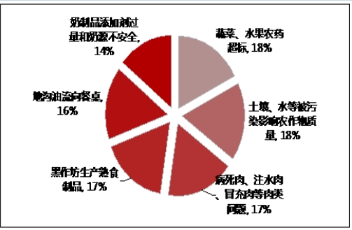 B.图表显示,6项食品安全问题调查中“奶制品和奶源”问题关注度略低,其它大致相当。