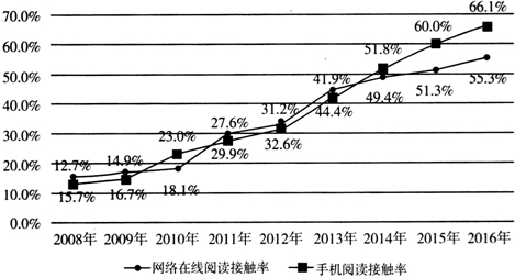 材料一: 1995年联合国教科文组织将每年4月23日确定为“世界读书日”,提 出“让世界上每一个角落的每一个人都能读到书”。2006 年,原国家新闻出版总署在借鉴国际经验基础上,提出“全民阅读”,并会同中宣部等11个部门联合发出《关于开展全民阅读活动的倡议书》。经过不懈努力,我们欣喜地看到,微信“朋友圈”中的读书人多了,报刊媒体上倡导全民阅读的声音响了,各种荐书书目看不过来了,众多民间图书馆、绘本馆、阅读推广公益组织成长起来了,自动借书机、流动借书车、流动图书角和24小时书店在各地出现了……全国国民阅读调查数据显示,我国国民阅读率和阅读量开始持续上升。(摘编自《光明日报》) 材料二: 2017年4月18日上午,中国新闻出版研究院发布《第十四次全国国民阅读调查报告》。进一步对各类数字化阅读载体的接触情况进行分析发现,2016年我国成年国民的网络在线阅读接触率[注]和手机阅读接触率有所上升,其他数字化阅读方式的接触率有所下降。 ![]() 历年网络在线阅读接触率、手机阅读接触率 (摘编自2017年4月《199it》中文互联网数据资讯中心) [注]接触率:一个人或家庭在一特定时间内接触某一媒体的次数。 材料三: 亚马逊中国发布“2017全民阅读报告”。从阅读报告整体来看,全民阅读发展趋势良好,受众的阅读热情不断高涨,阅读内容及形式也越来越多样。调查显示,56%的受访者年度阅读数量超10本,并且85%的受访者同时使用纸、电两种介质进行阅读。电子书作为阅读的重要形式,已经越来越多地被读者接受,而年轻一代更成为了电子阅读的生力军。其中,90后和00后对于电子书的接受程度高于其他各年龄段,纸、电“一起读”成为主流。同时,78%的受访者选择通过社交平台分享阅读有关的内容,与网友“一起读”成为数字阅读时代的独特行为。亚马逊中国的大数据显示,热门影视剧原著依然是畅销书榜的常客,《人民的名义》《三生三世十里桃花》持续畅销,诗词类节目《中国诗词大会》带火诗词类图书。 (摘编自2017年4月《techweb》) 材料四: 古有鱼传尺素,今有图书漂流。而当图书漂流遇到高铁,旅行的你会跟哪一缕书香邂逅?“鱼书计划”旨在推动全民阅读,“鱼书”二字出自中国古代典故“鱼传尺素”。意味着书信的传递。参与图书漂流活动的旅客,可在候车厅的自助式图书漂流点——鱼书漂流站上选取想要阅读的书籍,并通过输入身份证号码或车票信息注册个人信息,扫描图书编码之后,即可将图书借走。此外,读者可以通过扫描漂书上的官方二维码,进入漂书讨论区,与来自不同城市的漂书人一起分享自己的阅读感受,参与实时书评互动,让图书在日常生活中真正漂流起来。 (摘编自2017 年4月《长沙晚报》) 7.下列对材料相关内容的理解,不正确的一项是(3分) A.联合国教科文组织确定“世界读书日”后,我国在借鉴国际经验基础上提出“全民阅读”,并发出《关于开展全民阅读活动的倡议书》。 B.分析各类数字化阅读接触率,我国成年国民的手机阅读接触率最近连续三年超过网络在线阅读接触率,并逐渐拉开距离。 C.数据显示,我国国民手机阅读接触率与网络在线阅读接触率2009年的差距最小,2016年的差距最大。 D.数字阅读时代,年轻人成为电 子阅读的生力军,他们大多愿意通过社交平台分享阅读有关的内容。 8.下列对材料相关内容的概括和分析,正确的两项是(5分) A.只有在国家层面出台鼓励全民阅读的相关政策、措施,才能提高我国国民的阅读率和阅读量。 B.相较于其他数字化阅读方式,我国成年国民的网络在线阅读接触率和手机阅读接触率上升较快。 C.大部分读者同时使用纸、电两种介质进行阅读,并且对电子书的接受程度随年龄段的增大而提升。 D.热门影视剧推动了其原著的畅销,亚马逊中国的大数据显示,热门影视剧原著稳居畅销书榜首。 E.“鱼书计划”使得旅途不再无聊,旅客可按照鱼书漂流站提示借走图书,并与他人分享阅读感受。 9.根据上述材料,概括说明怎样才能有效地推进全民阅读。(4分) 参考答案 7.C 【评分说明】3分 8.B E 【评分说明】5分,答对一项得2分,答对两项得5分。答三项不得分。 9.①国家出台政策,营造良好的阅读氛围;②有关部门开展多样的阅读活动;③读者积极参与阅读活动。 【评分说明】此题4分。答对1点得1分,答对2点得3分,答到3点得4分;意思对即可。