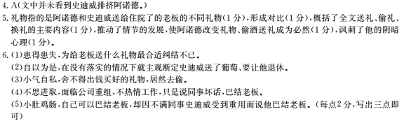 礼物 【英】梅亚·格林 阿诺德走进病房,却突然收住了脚步。他看见了伯吉斯先生,左边第六床便是。他还发现伯吉斯先生病床旁边站着一个人。糟糕!阿诺德心里咯噔了一下,史迪威可能会发现他的。他是无意中听到史迪威可能要去医院探望伯吉斯先生。得知这一消息后,阿诺德马上意识到自己也应该去医院看望一下。于是,他赶紧喝了一杯茶,便匆匆地朝医院奔去。然而,史迪威还是先到了一步。 阿诺德买了一些葡萄!可是,他看见床边的储柜上竟也放着一大串葡萄,好像是那种无核的小葡萄,属于价钱较贵的那种。肯定是该死的史迪威送的!他觉得还是将自己的那串葡萄扔了为好,但又觉得扔了实在可惜。留下自己吃算了,他心想。此时,他的面孔就像那串葡萄一样看起来总觉得有点别扭。于是,他将那葡萄随手揣进了自己的口袋里。 只要史迪威在那里,他就不好进去了,可病房外面又没有什么可以躲避的地方。想来想去,阿诺德只得又退到了楼下,在接待处茫然无措地转来转去。 究竟该给伯吉斯先生送点什么礼物呢?买束鲜花?那太丢人现眼了!买本书怎么样?正好那边有一个书摊。阿诺德走过去随手捡起一本平装书,一看价格,脸色一下子变得煞白,将近6英镑!上次买的那本书才花了他2.5先令。 阿诺德走进自助餐厅要了一杯茶。餐厅已经坐满了人,他只得与别人共用一张餐桌。坐在餐桌的东面,外面的人看不到他,而他却正好可以盯到那边的楼梯口。 在他的旁边,一位穿红色外套、身材高大的女人正和一个朋友交谈着。她的手提包敞开着,就放在她身边的座位上。里面的东西阿诺德看得一清二楚,在一堆妇女日常用品中间夹着一个小瓶子。一个小瓶子装的威士忌酒! 这下他心里总算有了主意!刚才自己怎么就没有想到这一点呢?伯吉斯先生平时就喜欢喝上一杯。史迪威也应该考虑到这一点!但现在即使想到也为时已晚了。医院是不会卖酒的,即使他想跑出去买,恐怕在这座医院周围方圆几英里的范围内也找不到一家卖酒的商店。 一想到生活中的不公,阿诺德的心情不由得郁闷起来。自己在那岗位上干了四十五年,如今突然来了这个史迪威,用他那些不切实际的想法和一时的热情拍老板的马屁。阿诺德压根儿就不相信热情。现在,他们要讨论什么重组问题。阿诺德心里明白,这所谓的重组无非就是要将一些人重组掉,他们竟然还美之名曰提前退休。哼!如果经济上负担得起,提前退休也就罢了,而阿诺德是负担不起的。到了这种年龄,他还能去哪里找到工作呢? 阿诺德的眼睛死死盯着那个小瓶子。史迪威怎么在病房里待了那么长时间?想必,他也找不到那么多话要说吧。老伯吉斯先生在精神状况最好的时候也不会有那么多言语的。“身体还好吗?”“这里的饮食怎么样?”“工作情况怎么样?”三言两语问候一下不就得了,还有什么要说的?当然,史迪威与众不同,他可以谈上几个小时还觉得言犹未尽。阿诺德真希望史迪威把伯吉斯先生烦得要死。 红衣女人还坐在那儿跟朋友交谈着。她在详详细细地讲述着自己的家族病史。 史迪威终于出来了!他走下了楼梯。阿诺德站起身来,故意将那女人的手提包碰到了地上。 “噢,请原谅,你看我笨手笨脚的。让我来捡吧。” 阿诺德弯下腰捡起了滚落到地上的那些稀奇古怪的东西,面带微笑地将手提包交还给它的女主人,然后,快步跑向楼梯口。 把它搞到手简直不费吹灰之力,阿诺德暗自庆幸。不过,他的心头也掠过一丝负罪感。可他转念又想,这完全是那女人自己的过错。谁让她将自己的手提包那样敞开着,让那诱人的东西暴露在人们的眼皮底下?完全是自讨苦吃嘛!总而言之,所有这一切都可以成为一个充分的理由。 阿诺德迫不及待地想知道伯吉斯先生接到自己礼物时究竟是什么样的一副神情。 他想,肯定会比史迪威的要好。你看他,就提了那么一串灰不溜秋的葡萄! 想到这儿,阿诺德充满信心、充满期待地走进了病房。 大约过了几分钟,红衣女人坐在楼下病房的一个小隔室里。她在手提包里不停地翻着,脸上流露出一种疑惑的神情。 “非常抱歉,”她说道,“我记得出门的时候自己是带上了的。” “别着急。”护士安慰道,“你可以去再接一份。记住,要采用中段尿样。厕所就在那边。” 4.下列对小说相关内容和艺术特色的分析鉴赏,不正确的一项是(3分) A.小说按照事件发生的顺序写阿诺德到医院探望老板,交代了阿诺德遭到同事史迪威排挤的背景。 B.阿诺德两次提到史迪威的葡萄,给出的是不一样的评价,这与阿诺德变得自信的心态有关。 C.“红衣女人还坐在那儿跟朋友交谈着。她在详详细细地讲述着自己的家族病史。”这句话起到了必不可少的铺垫作用。 D.作者没有交代阿诺德拿着礼物走进病房后的情节,但结合后文,反倒起到了言有尽而意无穷的效果。 5.小说以“礼物”为题有什么好处?请简要说明。(5分) 6.文章主人公阿诺德有着怎样的性格特点?请结合作品进行分析。(6分) 参考答案 4、A
