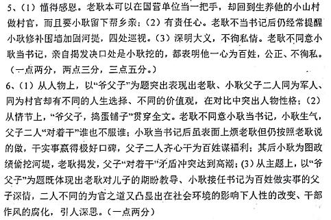 爷父子 肖建国 爷父子,捣蛋铺子。 这是地方俗语。捣蛋,对着干,谁也不服谁。 老耿和小耿就是这样一对父子。比如,大伙儿选小耿当村支部书记,老耿首先不同意。老耿小于,没公心,不顾人,从我们一家人吃饭就看得出来。饭菜一端吃狼吞虎咽。还得历练历练。 大伙儿先一愣,后哄笑,认为老耿幽默,欲擒故纵。 小耿在多数人的支持下当了书记。前任书记——老耿,退下来,当了委员。 老耿是孤儿,参加过对越反击战,在丛林里出生入死,立过军功。選伍后本来安排在国营单位当一把手,但老耿倔,偏要回到生他养他的小山村,心甘情愿地做了几十年的小村官。轮到儿子从都队复页,老耿才感觉自己实实在在地老了。看着依旧破落的村子,老耿对小耿说,留下吧,帮帮大伙儿。没有乡亲们当年的施舍,我早就饿死了,也就没有你,更不会有我们今天这个家。 小耿准备去深圳,战友泥鰍给他介绍了一份差事,年薪六万。老板说,表现好再加。小耿看看老耿通红通红的眼,思索了良久,才点头。 没想到,老耿竟然不同意他当书记。小耿气,不理老耿。吃饭也不聚一桌。端起碗,夹点菜,蹲在门口榆树下,吧唧吧唧吃得山响。 老耿没事一样,瞅空就对小耿指点这指点那。“学校的国墙裂了,娃们都是一群踩死蛤蝶踢死的主,要赶紧修修。”“夏季就要到了,河堤要加固,万一有个闪失,损失就大了。” 小耿烦了,反问道:“到底我是书记还是你是书记?” 气归气,老耿的话小耿还是照着做了。学校砌国墙,他时不时都过去看看。给工人发一遍说要保证质量,孩子的事,不能闹着玩。河堤加国,他第一个扛着铁楸到现场——这里没有机械化,全靠人工挖土方。他一捋袖子,干。工地上一片欢。 春夏秋冬,一晃5年过去了,小耿赢得了群众极好的口碑,然而他却没有得到任何重用和提拔。和伍的战友们相聚,他最寒酸。人家上了一瓶XO,他竟说这黄酒没有自家釀的,辣辣的,没点笑得满来子人噴饭。已是处级干部的泥鰍意味深长地拍拍他的肩,说“想当官,要会作秀”。 这话,让他嚼了又嚼。 进入六月,暴雨连绵。市里的头头亲自带队到各地巡视防洪工作。小耿眼前一亮,吩咐村里要准备好二十只木船。老耿骂他乱花钱,杞人忧天。“这河堤我天天都在观察,结实着呢。”小耿只是笑笑,难得一次不顶嘴,只是文代村干部要让村民们进行自救演习。老耿骂,“神经病!” 然而,让人意想不到的是,这天半夜,河堤决了口,洪水铺天盖地涌进村子。好在村民们都有准备,那边铜锣一响,这边村民们都收拾重要家当爬进小船。洪水来得快、大,冲倒了七八间房屋,但没有一人受伤。保住了性命的群众都说小耿有眼力,是个好干部。这样,一传十,十传百,小耿就成了非常时期的典型人物,受到了头头的亲自接见。 雨季过后,小耿连升三级;给县长做助理。 上任前一天,一直沉漫在幸福之中的小耿才发觉这些天来很少看到老耿。小耿心里顿时就慌慌的。 他想到了老耿,老耿就出现在他的面前。赤着脚,喘着粗气,手里还提了一双被泥巴包裹了的解放鞋。这鞋是他的。 小耿的脸一阵发白,浑身起鸡皮疙瘩。 父子俩对视良久,小耿慢慢地低下了头。 老耿一字一句地说,“去自首吧,河堤是你挖了才决口的。 “不。” “你不去,我去。”老耿说着就往外走。 小耿扑通跪了下来。“爹啊,你是我亲亲的爹啊。你不能把这事沤在肚子里吗? “不能。” “那我就死在你面前。” “你死在我面前,我也要把这事说出去。否则,我就对不起把我养大的百家饭,就不是一名上过战场的军人,也就不是你的爹。” 老耿说完就往外走,任小耿将头在青石板上磕得鲜血直流。(有删改) 4.下列对小说相关内容和艺术特色的分析鉴赏,不正确的一项是()(3分) A.小说语言平白质朴,富有地方色彩,口语化。既能引发读者阅读兴趣,又塑造了个性鲜明的人物形象。 B小说运用动作、神态、语言等多种描写方式,生动形象地刻画了小耿的形象,也凸显出了在社会环境的影响下人性的改变。 C小说到结尾处才交代决口处其实是小耿自己挖的,既在意料之外又在情理之中,老耿劝小耿留下、反对准备木船等情节都为这一结尾做了铺垫。 D小耿赢得群众极好口碑却没有得到重用和提拔,弄虚作假却连升三级。前后的反差体现出小说对官场不择手段“作秀”之风的批判。 5小说在刻画老耿这个形象时,突出了他的哪些性格特点?请简要分析。(5分) 6.“爷父子,捣蛋铺子”,小说以“爷父子”为题有什么作用?请结合文本加以探析。(6分 参考答案 4、C 老耿劝小耿留下并未对结尾做铺垫
