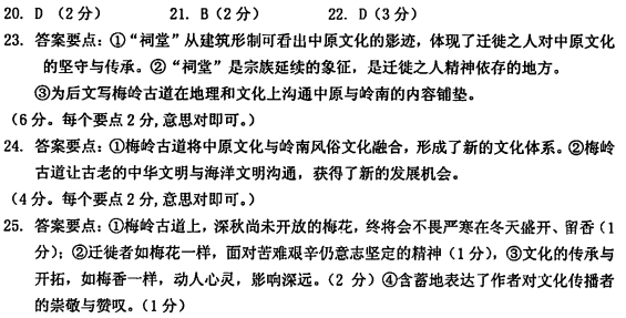 寒梅未著仍渗芳 ①梅岭注“古道上铺满了碎石,那是从山里就地取材挖来铺设上去的。梅岭古道还没开通前,由岭南通往中原,靠的是“庚岭未开,南北通衢也”的另一条位于乌迳新田村的古道。其间,新田村古道“日屯万担米,夜行百只船”,非常热闹繁华。 ②走进南雄乌迳有一千七百年历史的新田村,仿佛感到时间是凝固的,但分明有种难以言说的气息在散发,从时间捆绑的绳索中挣脱出来,我在一片土黄的颜色诱感下穿过狭窄的巷道,感受着时光的老去,有东西埋藏在这里,并没有【甲】(淹没/湮灭)它藏在那些用红黄的泥土砌成的倾颓的墙体中,藏在疯长的野草掩盏的野径上。 ③在一处祠堂高悬的匾额上,见到“祖德重光”几个字,这座祠堂的房顶不是岭南比较多见的大耳房檐,而是状如官帽;从这建筑形制可看出中原文化的影迹。褪色的香案,冷寂的残灰,由于没有人打扫,新田村的祠堂变得冷清,有几座祠堂祖先的牌位还供奉在那儿,估计只有到了节日祭祀,这些祠堂才会重新热闹起来,打破往日的沉寂。青砖砌成的祠堂院墙,泛着苍黑的光泽,祠堂的建筑风格与簇拥在祠堂周围的泥坯土房形成了鲜明的对比。那一片村舍的土黄是如此的耀目,它沉稳地烘托起祠堂的辉煌,突显了祠堂在乡村中所具有的中心地位。 ④那些泥坯砌成的房舍,是岭南粤北乡村基本的建筑式样,它的来源并不费功夫,中原迁徙过来的人,从落地生根那天起,他们就与这红黄的泥土产生了亲和力,从挖出的第一抔土开始,那些泥团与他们的汗水相互搅和,经过无数次的翻滚揉搓,再掺杂进禾秆草梗加以固形,阳光晾晒后,一块块垒筑起来,住在里头能嗅到泥的气息、草的芬芳,这些泥坯房总是带着烟火的味道。因为它所要承担的是起居饮食,生儿育女。而祠堂是属于精神的,是每一个迁徙者魂灵所系的居所,是精神依存的地方,祠堂很自然就有了一份庄重与典雅。 ⑤夕阳荒草,整座村子显得寥落,祠堂的烟火也冷寂多时。祠堂维系着宗族的根,象征着一种精神的存在,哪怕再破败,它依然延续着香火,哪怕游子迁徙到远方,总有安家的地方,有家了,祠堂就屹立在哪儿,那是一个宗族的魂灵所在,香火的冷寂与有无,不是重要的,它始终在那些后人心中燃点,毁掉了又重建。 ⑥梅岭上的秋天,绿薄了,但繁密的树丛还没有层林尽染的秋深气象。城楼上“岭南第一关”几个大字赫然在目,那就是梅关了。苍黑的城砖,写实般见证着岁月和人世的浮沉。自张九龄奉唐玄宗之命修筑梅岭古道以来,走过古老的城门下,踏上这崎岖古道的,就有六祖惠能,韩愈、苏东坡、汤显祖;但是更多从梅美走过的,是囚徒,貶谪的官员、失意的文人,天涯的倦客、被迫流落他乡的迁徙者。 ⑦山石凹凸不平,我想象着那些迁徙者穿过梅美的城檯,流落到岭南各地的身影,他们逝去的足音,已无法寻觅。我如今踩着那些迁徙者曾经走过的足迹,顿时感到脚下的石头仿佛变柔软,它仿佛让你的指尖触摸到一页尘封已久的隐秘的历史。 ⑧梅岭古道作为一条南迁之路,它打通的不仅是岭南与中原的交通要道,实际上也打通了一条文明的根脉,中原文化通过这里与岭南文化相融合。张九龄奉旨历经两年艰辛修建的梅岭古道,后来沟通了长江与珠江两大水系,成为“海上丝绸之路”的中转站,而与梅岭古道相连的珠玑巷也逐渐【乙】(演变/蜕变)为古道上最重要的商业重镇。 ⑨二百年间,由梅岭古道穿过梅关,再由珠玑巷南迁岭南,有记载的迁徙就达一百三十多次,其中大规模的南迁有两次:第一次南迁是为逃避金兵的杀戮而南迁,发生在北宋末徽宗、钦宗二帝被俘,史称“靖康之耻”前后;第二次南迁,是南宋灭亡前后,为逃避元兵追杀而迁。 ⑩梅岭古道,在某种程度上为延续文化的命脉留下了一线生机。何况依靠珠江水系的出海口,开通了海上丝绸之路,那更是向海洋文明张开了怀抱。文化是需要交流的,而梅关作为海上丝绸之路的一个重要起点,与海外相连,这让古老的中华文明获得了一次重生的机会。 ⑾由于族群的大迁徙,那些不得不离开故土的人,以开拓者的姿态,来到岭南,先在梅岭下的珠玑巷落脚。以梅关为界,迁徙者将中原文化与岭南的凤俗文化及地理坏境融合,逐渐形成了新的文化体系:广府文化、客家文化、潮汕文化,还有四邑侨乡的华侨文化,这几大文化,随着那些不同姓氏的族群的迁徙,以珠玑巷为根据地,逐渐散布于岭南各地,更随着海上丝绸之路的拓展传播至海外。 ⑿现在是秋天,梅岭上难觅梅花的影踪,但经冬终要绽放的梅花,总会把一段香,留在寒冬的枝条上,那在霜雪中盛开的寒梅,目送着那些从古道走过并远去的迁徙之人。古道虽然发出过带枷囚徒镣铐刺耳的悲鸣,难免带着悲情,但也留下了像六祖慧能、韩愈和苏轼等衣袂飘飘的身影。经过历代重修的梅岭古道,山石坚硬,好像要让我们感受那些迁徙者如梅花一样傲立寒冬的坚定和意志,我们虽然看不到梅花的姿影,但它不灭的香魂仿佛早就驻留在这梅岭古道,这时候我仿佛嗅到了夹杂在梅岭山野上仍没有散尽的梅花的香气,那幽香中恐怕也渗入了迁徙者的汗水。 (取材于杜璞君同名散文) 注:梅岭,即大庾岭,因岭上多植梅树雨得名 20.文中下列加点字的注音,不正确的一项是(2分) A.倾颓(tuí) 21.依据上下文,在文中【甲】【乙】处依次填入的词语,最恰当的一项是(2分) A.淹没 22.下列对文章的理解与分析