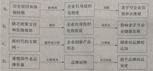 材料一 : 我国千百年的社会经济发展,孕育了众多具有浓郁民族特色、享誉国内外的老字号。据了解,建国初期我国约有1万多家老字号,分布在餐饮、零售、食品等众多行业。 老字号承载着优秀的中华民族文化,是新时期开展诚信兴商的核心内涵和宝贵财富。但由于历史原因和体制转换的影响。我国老字子企业在发展中遇到许多新问题。部分老字号企业组织化程度低,技术、管理落后,市场开拓能力较弱。特别是长期以来,由于对老字号的重视和支持力度不够,缺乏合理的发展规划,老字号传统特色技艺和文化缺少必要的政策支持,这些都严重制约了老字号的发展。 (摘编自《关于保护和促进老字号发展的若干意见》 材料二: 目前商务部认定的中华老字号有1128家,发展良好的如片仔癀、稻香村等仅占20%--30%,受困于缺资全、缺人才和缺品牌三大问题,多数企业经营欠佳。以云南为例,该省老字号企业共计89 家,但只有38家实现持续3年盈利。 老字号价值在老,出路在新,这个“新”不仅体现在对传统产品的改造上,还体现在发展理念的转型、销售方式的变化中。要创新理念、开阔视野,打破固有格局,多角度地提升老字号品牌的市场活力;要创新产品形态和营销模式,善于用互联网思维挖掘老字号的文化内涵。在知名度、忠诚度方面赢回顾客群。在“互联网+”的大潮中找到生存之道。 (摘编自《老字号价值在老,出路在新》.2017 年6 月22 日光明日报) 材料三: “中华老字号”的招牌和“非遗”文化赋予老品牌新的增长点,但其传承百年的生命力归根结底还在于久经考验的制作技艺,正如同仁堂古训所言:“炮制虽繁必不敢省人工,品味虽贵必不敢减物力。”中华老字号传承百年有其坚守,在传承中不断创新,诚信严谨,追求卓越品质;品牌新星上榜百强有其专长,稳健中开拓进取,用人才,重服务,讲诚信、担责任。不管是老字号还是百强企业,透过各家官方网站上关于企业文化的相关介绍,我们可以发现,“创新、诚信、卓越”的共同价值观是中国品牌永不褪的底色。 ![]() (摘编自《从“老字号”到“百强企业”,看中国品牌本色》,2017 年5 月10 日新华网) 材料四: 在调查中发现,部分消费者对所属本地的老字号品牌比较熟悉。但对于其他城市的认知度却偏低。对于国外老品牌,消费者的认知度较高。中华老字号品牌与国外老品牌相比的不足,大多在于传播、推广、销售上缺乏延展性与国际化发展策略,使得品牌不断老化,国外老品牌有90%经过品牌延伸来重塑品牌形象,恢复、提升品牌活力。 消费者对中华老字号的印象仍停留于老字号的“传统”上,未能直观地感受老字号的发展与创新,据统计,最能直接吸引改变消费者的途径是通过创新来重塑视觉形象实现品牌的崛起。在中华老字号的改造和创新中可以系统而又规范化地重塑品牌视觉形象。结合多元化传播推广模式。全面塑造、提升品牌形象。 (摘编自周怡洁《中华老字号品牌的形象重塑》) 7. 下列对材料相关内容的梳理,不正确的一项是 ![]() 8. 下列对材料相关内容的概括和分析,正确的两项是 A. 与建国初相比,开前的中华老宁号企业数量明显减少,企业自身规模缩小,盈利的企业就更少。 B. 中华老字号能传承百年,既有坚守的因素,也有创新的理念,而最根木的要素是精湛的技艺。 C. 根据材料三可知,无论是老字号还是百强企业,它们共同的核心价值观是创新、诚信、卓越。 D. 根据材料二两幅图可知,从老字号发展到百强企业,最需要坚守的企业文化元素创新。 E. 消费者对国内老品牌形象的认知往往停留于直观的感受,老品牌的产品包装显得至关重要。 9. 根据上述材料,请分析中华老字号企业如何做到传承与创新的统一。 【答案】 7. C 9. ①老字号传承优秀的中华民族文化和久经考验的制作技艺。②注重创新,改造老字号传统产品,转型发展理念,改变销售方式,重塑品牌视觉形象。③传承是创新的基础和前提,创新是传承的转变与发展。