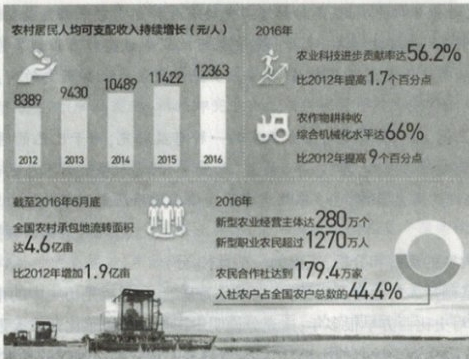 材料一: 党的十八大以来,我们统筹工农城乡,强农惠农富农,“三农”工作取得了历史性成就,发生了历史性变革,可以说,实施乡村振兴战略有基础、有条件。 ![]() (摘编自《增强实施乡村振兴战略的使命感》,2017年12月30日《经济日报》) 材料二: 党的十九大报告指出,建立健全城乡融合发展体制机制和政策体系。中央经济工作会议进一步强调,要科学制定乡村振兴战略规划,健全城乡融合发展体制机制,清除各种阻碍要素。在农村基本经营制度和土地制度稳定以及集体产权制度改革方面要给农民吃“定心丸”,进一步构筑和巩固我国城乡社会结构和农业农村经济持续稳定发展的坚实基础。 农业部农村经济研究中心主任宋洪远说,科学实施乡村振兴战略要有清晰的思路和措施,关键在于土地政策、产权制度、经营体系和政策体系这四个方面,要按照融合发展的角度完善体制机制。 (摘编自《实施乡村振兴战略 促进城乡融合发展》,2017年12月29日“新华每日电讯”) 材料三: 乡村振兴归根结底是发展问题,产业兴旺是乡村振兴的基础。首先,要因地制宜,确定乡村产业发展策略。依据乡村的资源优势、区位优势和发展过程中积累的比较优势,确定主导产业,形成能够充分利用自身资源并符合市场需要的产业结构,重点发展特色产业。其次,促进农业与二三产业融合发展。充分挖掘和拓展农业的多功能性,促进农业产业链条延伸:促进农业与二三产业尤其是文化旅游产业的深度融合,大力发展农产品加工和农村新兴服务业。 乡村振兴要充分利用先进的科学技术成果。首先,整合各方面科技创新资源,完善国家农业科技创新体系、现代农业产业技术体系和农业农村科技推广服务体系,依靠科技创新激发农业农村发展新活力。其次,促进互联网技术、物联网技术等现代技术与农业农村生产生活生态的密切融合,让农民充分享受现代科技成果。 (摘编自刘合光《实施乡村振兴战略的四个着力点》,2017年12月9日《农民日报》) 材料四: 以全域乡村旅游引领乡村产业融合发展新境界。进一步加大农村交通基础设施建设,既要继续修好进村、进社、入户的出行路,又要根据休闲农业与乡村旅游发展需要适度超前规划修建农村产业路、观光路,提高农村公路标准,保障游客进出通畅。完善乡村规划,加大生态环境保护力度,打造各具特色、生态宜居乡村风貌,让城里人到乡村望得见山、看得见水、记得住乡愁。 以健全的乡村治理体系开创乡村社会发展新风尚。要加大农村优秀传统文化、非物质文化遗产的挖掘、保护、弘扬力度,提升农民立足农村发展的自信心、自豪感,增强乡村的文化吸引力和内在凝聚力。 (摘编自《深刻理解乡村振兴战略的重大意义与科学内涵》,2017年11月9日《重庆日报》) 7.下列对材料一相关内容的理解,不正确的一项是(3分) A.实施乡村振兴战略是我国农村发展的战略选择,“三农”工作的历史性成就、历史性变革为实施乡村振兴战略奠定了良好基础。 B.党的十八大以来,我国农村居民人均可支配收入持续增长,2016年达到12363元,其增速高于城镇居民,增强了农民的获得感。 C.与2012年相比,我国农业科技进步贡献率、农作物耕种收综合机械化水平分别提高1.7个、9个百分点,我国农业在转型升级。 D.农业改革取得新进展,至2016年6月底,农村承包地流转面积比2012年有增加;2016年农村合作社人社农户占全国农户的四成多。 8.下列对材料相关内容的分析和评价,正确的两项是(5分) A.这四则材料围绕的中心话题是乡村振兴,但各有侧重,材料一揭示的是乡村振兴的基础,其它三则材料分析的是乡村振兴的途径。 B.实施城乡融合发展,要按照融合发展的角度完善政策等体制机制,这给农民吃了“定心丸”,巩固了城乡社会结构的坚实基础。 C.科技创新是实施乡村振兴战略重要的因素,只要依靠科技创新就能激发农村发展新活力.就能够实现现代技术与农业生态的密切融合。 D.打造各具特色、生态宜居乡村风貌,让城里人到乡村望得见山、看得见水、记得住乡愁,这样农村优美的生态环境更有助于吸引游客。 E.乡村振兴的基础是产业兴旺,所以首先要大力发展农产品加工和农村新兴服务业,其次发展乡村旅游业,最后是挖掘、保护乡村传统文化。 9.怎样才能实施乡村振兴战略?请结合材料简要概括。(4分) 参考答案 7.B(3分。“其增速高于城镇居民”错,无中生有) 8.AD(B项,未然与已然关系错误,原文的意思是“要给农民吃“定心丸”,“巩固了”也是未发生的事情。C项,“只要……就……”错。E项,“首先、其次、最后”错,文中没有这样表述。)(5分。对一处得2分,全对得5分) 9.①建立健全城乡融合发展体制机制和政策体系。②加快振兴农村产业,通过产业发展推动乡村振兴。③发挥科技引领作用,通过科技创新振兴乡村。④增强乡村的文化吸引力和内在凝聚力。(4分。每要点1分,意思对即可)