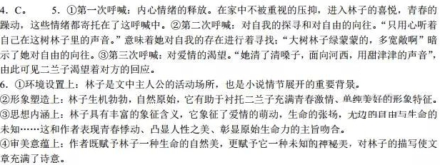 林子深处 张炜 芦青河口那围遭儿树多。大片大片的树林子,里面横一条小路,竖一条小路,非把人走迷了不可。因此河边的各家老人都常常告诫自己的孩子——没事儿,千万不要往林子深处走! 可二兰子倒蛮不在乎。她常钻到林子深处割牛草。家里养个老牛,肚子比碾砣还大,地上放捆嫩草叶儿,它伸出舌头抿几下就光了。大弟弟忙着复习考大学,小弟弟要进重点班,惟独她不被看重,忙里忙外,出工前还得去割一大早的牛草。割就割吧,她没上几天学,管“太”念“大”,常常忽略中间那“一点儿”,还不得割牛草吗?可近处的青草全被人割光了,不进林子深处行吗? 好在二兰子还从没有迷过路。 早晨,还是很早的时候就进林子了。二兰子总是这样:不管心里多么不痛快,一进了这林子就变得高兴了。看吧,这里的草叶儿才叫好呢!青青一片,崭新崭新的,叶片儿宽板板,长溜溜,就像初夏的麦苗儿。那草棵里面还有花哩,红一朵,黄一朵,二兰子先拣一朵大的插在头上,然后才解了绳儿,举起手里那把雪亮亮的镰刀……小鸟儿在头顶“喳喳”地叫了几声,清甜的空气直往鼻孔里扑,二兰子高兴极了!她盯着那镰刀刃儿,镰刀刃儿锃亮锃亮,反射着阳光,耀得她眯起了眼。四周空荡荡的,一个人也没有,她脸儿红红的,四面儿瞧瞧,心里一热,不知怎么脱口喊了一声:“大刀睐,小刀睐——”呀,满林子都喊哟!二兰子听到那声音了,听那尾音儿,在林子里还引起了一阵“啦沙沙沙……”的震动。二兰子恣得闭上了眼睛,一溜睫毛显得格外长、格外密。她大仰着脸儿,眼也不睁,嘻嘻笑着又喊一遍,“大刀睐,小刀睐——”她喊完了,大气儿也不出,只用心听着自己在这树林子里的声音。大树林子绿蒙蒙的,多宽敞啊! 这回的尾音拖得特别的长。奇怪的是,它好像飞到了老远的地方,又从那儿折回来。声音已经变了。二兰子听着愣住了! 她一个字一个字地分辨着:是哪个小伙子在老远的地方接着喊哩!听听,他还在喊哩——“大姑娘睐,小姑娘睐——” 二兰子赶紧藏到了一丛灌木后边。当她听出那声音是从远远的河西岸传过来的,才从灌木丛里走出来。不过她一颗心还在“怦怦”跳着,胆怯地向着河西岸望去——一团绿色又一团绿色,苇行、灌木,遮得严严实实,哪里看得见啊!不过这声音却是蛮嫩气,听那调儿,还是喊的普遍话。二兰子小声骂一句“该死的”,就弯下身子割草了。 这天,她只默默地割草,连大声“哼”一句也不敢,生怕河西岸听见似的。割成了一大捆儿,她就无声地扛起来,踏着那林中小路儿回家了。 以后的早上,她每每来到林子里,刚要弯腰割草,就会听到河西岸那人在喊。“喊吧,喊吧,有谁理你才怪!”二兰子在心里说着,下狠劲儿割着草,头也不抬。割呀割呀!割得草叶堆成小山,老牛吃得肚儿圆;割呀割呀,一口气割了十天。十天里有十个早晨,有十次踢散那林中小路上的露水珠儿,也有十次听到那河西岸的呼喊。呼喊,呼喊,显你小伙子嗓子脆啊!显得你小伙子甜眯嗦嗦啊!二兰子烦他。她这会儿开始后悔了:一个姑娘家,干吗在树林子里乱喊呀?你就不知道这树林子特怪——能让声音大上几倍吗? 二兰子以后割草时,故意用心听那鸟儿吵嘴——这就能忘了那个小伙子的声音。可是几天之后,她突然觉得这无边的林子里好像少了些什么。 少了些什么呢?花也在,草也在,鸟儿也在,手里的镰刀也在——少了些什么呢?她干活不勤快了,再也无心割草,默默地贴站在一棵大杨树上,伸出镰刀刮那衰死的老皮儿……她刮着刮着猛然记起了:是少了他那喊声哩!——他从河西岸走了吗?他回不去了?他怎么就一连这多天不喊哩! 二兰子扛着草捆儿回家,走在路上都没劲儿。她是太累了。早上回到林子里,她清了清嗓子,面向河西,用甜津津的声音喊了一句:“大刀睐,小刀睐——” 树林子哟,树林子哟!树林子又把这声音传走了,那尾音儿不消不失,颤颤悠悠,像琴!像箫!像笛!像鼓!二兰子料定这声音是那千千万万片叶子传动的,要不它们怎么老是唰唰地动呀?她半个脸贴在树干上,她等河西岸那个声音。正在她的心急急跳动的时候,那声音果然又一次传过来了——“大姑娘睐,小姑娘睐——” 那尾声在林中回荡着,悠悠不绝,无边的树林仍在鸣响。这声音扩展到了一个更广阔的世界里,起落、震荡,交织成一个力的回响,深沉、昂扬,像乐章里奏出的和声……二兰子一动不动地谛听着,抿着嘴角。她四周都是高入云天的大树、蓬蓬勃勃的草木。她谛听着,渐渐觉得自己也溶化在一片无垠的绿色里了……二兰子欣慰地笑了。 (选自张炜《林子深处的声音》,有删改) 【注】甜眯嗦嗦,方言,意为“爱在女人面前讨好”。 4.下列对小说相关内容和艺术特色的分析鉴赏,不正确的一项是( )(3分) A.“家里养个老牛,肚子比碾砣还大,地上放捆嫩草叶儿,它伸出舌头抿几下就光了”,这种富有乡土气息的表达使文章呈现出质朴的美感。 B.二兰子的形象非常立体、鲜活,对于老人们的告诫她表现得天真胆大,但“还从没有迷过路”又能从侧面看出她的心细机灵。 C.文章最后写尾声悠悠不绝,草木蓬蓬勃勃,绿色无边无垠……这些充满诗情画意的语句既交代了情节发展的走向,又给读者留下了无限的想象空间。 D.作者用细腻的笔触呈现二兰子心灵世界的成长过程:由开始的“潜意识”发展到了后来的“主观意识”,越来越有主动性。 5.结合小说内容,分析二兰