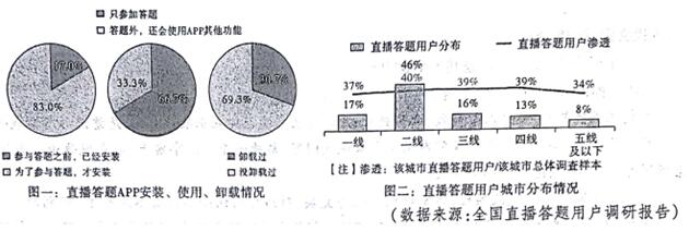 7.A【解析】A项,“对直播答题平台增加包场式广告赞助商产生反感……卸载直播答题APP”错误,用户卸载直播答题APP的原因会很多,平台增加包场式广告赞助商产生反感只能是其中一种,但不是全部,所以卸载直播答题APP的用户不能全是因为“反感”使然。 8.B、C(答对一项得2分,答对两项得满分5分)【解析】A项,“保证了这些用户今后会继续使用直播答题APP”错误,从图表中有三分之一的用户卸载过直播答题APP可以看出,“即答即提现的高效性”未必能让直播答题APP用户继续使用该程序。D项,“这些知识错误使相关部门对直播进行监管”有误,从材料三可以看出,相关部门对直播进行监管除了题目出现知识错误外,还有传播的思想、开办直播答题的资格和主持人业务素质等诸方面。E项,“专业主持人”错误,从材料二可以看出,“合规”的“规”就是《信息网络传播视听节目许可证》,主持人不是规定要求的,同时“通知”要求主持人有“良好的业务素质”而不是“专业主持人”。 9.【解析】回答问题时注重思考几则材料中对直播答题的具体看法。比如材料一,介绍了直播答题的相关情况:直播答题的玩法;直播答题的本质是为直播找一条符合政策的安全之路,直播答题的经济利益涉及到答题者、平台、广告商等三方;直播答题让全民知识有高的飞跃以及答题者一夜暴富都是不可能的。这则材料涉及到直播答题中有关知识方面的内容是有关题目的问题。材料三,介绍了国家新闻出版广电总局对直播答题的监管问题,涉及到文化知识的是有关传播健康有益的知识问题;材料四主要是从直播答题题库质量的角度议论的,主要观点是直播答题题库要传播真正的知识等。由此可以总结出答案内容。 【答案】远离低俗。传播的知识要高雅,也不能拿金钱为噱头。加强监管。管理部门采取措施,规范直播答题节目的管理,直播答题的节目内容要坚持正确的导向,传播健康有益的知识。做好题库。直播答题的基础是题目,不能把垃圾信息作为知识进行传播。(每点2分,任答两点得满分4分)