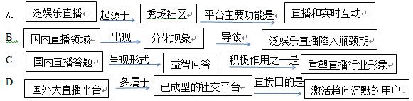 材料一: 泛娱乐直播平台,指主要业务为传播泛娱乐直播内容,并提供用户与主播进行实时互动功能的平台。泛娱乐直播起于秀场社区,自2008年上线后发展至今,在PC端拥有较为稳定的用户基础。2016年,移动直播迅速崛起,对PC端的追赶趋势明显,7月后用户流量激增,迅速赶超PC端用户规模,并逐渐拉开差距。艾瑞分析认为,移动直播的兴起除降低了直播的门槛、拓展了传播渠道外,也激发了直播的社交属性,激活了直播的潜在用户。直播的整体用户规摸扩大,并没有带来PC端固有用户的大量转移,因而PC端的用户基础受移动端影响较小,仍会保持现有规模稳定发展。 伴随着泛娱乐直播的火热,一些不良现象也不断出现在大众视野中。从2016年以来,广电总局、国家网信办、文化部纷纷针对网络直播行为下发系列文件。针对直播平台的监控要求不断提高,内容愈加细化,不仅对表演者提出要求,对用户的互动行为也采取了一定的监管限制,这些监管措施将会推动直播行业健康发展,遏制不良直播内容的传播。 (选自搜狐网,有删改) 材料二: ![]() (数据源自《2018年中国音乐直播用户白皮书》) 材料三: 仅仅两年的时间,曾经“你方唱罢我登场”的直播领域,在国内已经出现日渐明显的分化。一方面是泛娱乐直播的细分化,往游戏、综艺、体育等方面发展;另一方面,则是企业直播与泛娱乐直播之间的分水岭越来越明朗。据艾媒咨询分析,泛娱乐直播领域正处于瓶颈期。数据显示,相比于2016年,2017年的用户规模增长速度明显放缓。首先,主要是优质内容匮乏、内容粗糙和严重同质化,导致了用户的加速流失。其次,泛娱乐直播的发展环境在改变。艾媒咨询分析,政策是主要影响因素。另外,直播的投资热度冷却,资本趋于理性,资源趋于集中,导致行业出现新一轮的洗牌,不少泛娱乐直播平台开始谋求其他出路。最后,变现模式的固化也让泛娱乐直播平台的成本不断提高。用户打赏、网红抽成的变现模式,导致对网红资源争夺日益剧烈,泛娱乐直播平台疲于“抢人”,疏于改进用户体验,进一步造成用户流失,本来就黏性不强的状况又雪上加霜。 然而一段时间,直播答题突然成为中文互联网的新风口,仅仅是2017年年底到2018年新年的短短两周时间里,中文互联网上就有超过六款直播答题产品出现。直播答题的引入为过去奉行流量为王的直播平台找到了一条内容为王之道,益智问答以“知识竞赛”的面貌重塑了直播行业的形象,同时也收割了新的流量和用户。对参与的网友而言,直播答题开辟了新的娱乐消遣方式,甚至是益智、娱乐、赚钱三不误。因此,抛开当前出现的奖金透明性质疑、作弊外挂等问题,短期来看,直播问答是少有的负外部性较小的模式创新,非常有益于行业发展。 (选自《直播行业现状剖析:泛娱乐直播遭遇瓶颈,企业直播潜力大》,有删改) 材料四: 与国内的直播平台不同的是,国外的大直播平台多属于已成型的社交平台,如美国四大直播平台 Facebook Live, YouTube,Snapchat推出的 Live Stories,Twitter旗下的Periscope等,这些平台本身已经是大型流量入口,直播对于它们来说社交工具的属性要更多于流量工具。更直接的目的是用直播带来的社交体验重新激活已经越来越趋向沉默的用户,而不是导流新用户。依靠熟人社交奠定社交地位的 Facebook在全球许多国家都拥有用户,它需要为日趋沉默的用户寻找新鲜感,让互动形式更为丰富,主打视频直播业务的 Facebook ive上线后两个月便被放在了服务栏的明显位置。 目前看来,比较统一的现象是直播更适合作为内容生产工具,而不太具备平台化的条件。国外直播市场 Facebook、 YouTube、Snapchat和 Twitter四大社交巨头激烈角逐,国内直播平台则凭借BAT和资本上层,以及微博等大流量平台的互动来彼此竞争。缺乏稳固的社交和流量基础的国内泛娱乐直播,凭一己之力平台化的道路目前来看非常艰难。 (选自《美国直播占有率出炉 看看国外的直播“四大天王”都是谁》,有删改) 7.下列对材料相关内容的梳理,不正确的一项是( )(3分) 8.下列对材料相关内容的概括和分析,不正确的一项是( )(3分) A.移动直播崛起,用户规模迅速赶超PC端,在大幅扩大我国泛娱乐直播用户整体规模的同时,也没有对PC端用户造成太大冲击。 B.根据材料二可知,至2022年,中国泛娱乐直播的市场规模会逐年增加,但经历2016年的“井喷式”发展之后,其增速将会放缓。 C.材料三重点分析了国内直播领域面临的主要问题及其产生的原因,并指出直播答题这种娱乐方式才是未来直播行业发展的方向。 D.与美国四大直播平台相比,我国的泛娱乐直播缺乏稳固的社交和流量基础,目前尚不具备平台化的条件,只能依赖于其他平台。 9.目前中国泛娱乐直播行业存在哪些问题?请简要概括。(6分) 答 7.B .强加因果。“泛娱乐直播陷入瓶颈期”的原因并非国内直播领域的分化。 8.C “直播答题这种娱乐方式才是未来直播行业发展的方向”不合文意,根据材料三可知,直播答题只是在“短期来看”比较有益于直播行业发展的模式创新,但从文章中并不能看出它是未来直播行业发展的方向。 9.存在的问题:某些直播平台传播不良内容,直播优质内容匮乏,内容粗糙,同质化严重;变现模式固化,成本不断提高;对用户体验关注不够造成用户流失。用户黏性不强;缺乏稳固的社交和流量基础。(答出3点4分,4点5分,5点6分)