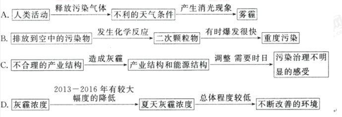 科学治理灰霾,促进绿色发展 (嘉宾:中国科学院院长、党组书记白春礼,中国科学院遥感与数字地球研究所副所长顾行发,中国科学院城市环境研究所副所长贺泓) 记者:能跟我们解释一下灰霾是什么吗? 贺泓:我们往往在媒体上讲到灰霾现象的时候都用“雾霾”这样的词。其实,雾是雾,霾是霾,是两种不同的现象。雾是由大的水滴造成能见度下降,是一种自然现象。霾主要是由于人类活动所造成的污染的排放跟不利的天气条件相互作用下形成的污染的现象。但是,雾和霾有的时候交织在一起,雾加霾,叫作雾霾,也不能算错。我们重点研究的是霾,科学院称作灰霾。大气中所生成的细的颗粒物,比如PM2.5,造成大气能见度下降,从学术的角度来讲就是产生消光现象,我们叫作灰霾现象。 白春礼:有的时候我们感觉到,今天蓝天、白云很好,但第二天马上变为中度污染甚至重度污染。这不是一次排放产生的,不是一夜排到天上的颗粒物产生的污染,而是原来已经排放到空气中的一些氮化物、硫化物等,以气体的形式存在的一些东西,在适当的温度、气候条件下发生化学反应,又重新在天空中快速地聚集,形成了新的PM2.5颗粒,这叫二次颗粒物。有时候二次颗粒物爆发得很快,一下子产生重度污染,因此我们关注一次颗粒物排放的同时,也要关注氮化物、硫化物的排放,使二次颗粒物在天空中产生的先决条件不存在。 记者:我们这么多年治霾,为什么百姓的直观感受不明显呢? 顾行发:整体来讲,环境在不断地改善,而且趋势非常明显。从2013年到2016年,灰霾的浓度降低了30%以上,在京津冀地区,最高的降低了50%以上。在夏天的时候,总的来讲,灰霾的程度比较低,天气也比较好。秋、冬季,降低的程度比较小,甚至有些地区灰霾的程度还有增加。灰霾根本上是过重的产业结构以及偏向煤炭的能源结构造成的,而调整产业结构和能源结构不是一朝一夕的事。我们发现霾不全是一次颗粒物排放导致的,二次颗粒物的占比能占到百分之六七十甚至更高。PM2.5的来源、成因,在不同的区域、不同的季节,有很大的差异。冬季可能是因为取暖燃煤,夏季不一样;长三角、京津冀,各地也不一样。中国目前的大气污染与当初英国伦敦、美国洛杉矶发生的大气污染还不太一样,我们现在的污染是一种复合型的污染。 记者:想问一下中科院在治理灰霾上会提供哪些科技支撑呢? 白春礼:在国家未来大气灰霾治理中,科学院将继续提供坚实的科技支撑。我想支撑主要体现在下面三个方面:第一,科学院作为第三方,进行大气环境的观测和大气灰霾的模拟与预报预警技术的研究,准确、全面地掌握我们国家大气灰霾的污染特征。还有一个很重要的方面是关于灰霾的生成机制的研究。我们监测到灰霾是哪儿产生的,还要了解灰霾是如何产生的。只有知道是如何产生的,才可能采取针对性的治理办法。第三个方面,科学院针对大气污粢物源头减排的迫切需求,积极组织大气污染的控制前沿技术的研发,为实现大气污染源头减排提供更加有效的基础知识和科技的支撑,我想这是今后工作的重点。 记者:今天非常感谢三位的分享,感谢您的关注,再会! (摘编自人民网2017年3月“访谈”) 7.下列对材料相关内容的梳理,不正确的一项是(3分) ![]() 8.下列对材料相关内容的概括和分析,不正确的一项是(3分) A.二次颗粒物是一种新的PM2.5颗粒,是一种气体污染物,它是在一定的温度、气候条件下经过化学反应形成的,与氮化物、硫化物的排放有关。 B.PM2.5的产生,不仅跟人类活动有关,还跟当地的气候、温度等自然环境有关,而这些非人为因素是不能改变的,所以灰霾是不能全面根治的。 C.我国目前的大气污染是一种复合型的污染,与当初英国、美国的大气污染不同,治理的难度较大,尽管已有成效,但百姓的直观感受仍然不明显。 D.三位访谈嘉宾从各自的研究领域分别谈了灰霾是什么、形成的原因以及未来治霾的科技支撑等问题,为人们认识、治理灰霾提供了借鉴。 9.根据上述材料,请概括说明治理灰霾需要做哪些方面的工作。(6分) 答 7.A[解析]“雾霾”中的“雾”不是人类活动造成的,而是一种自然现象。 8.B[解析]B项,“灰霾是不能全面根治的”错。 9.①加强关于灰霾的研究,搞清楚灰霾的特征、形成机制,研究控制技术。②调整产业结构和能源结构,减少一次污染物排放。③积极研发控制大气污染的前沿技术和产品。(每点2分)