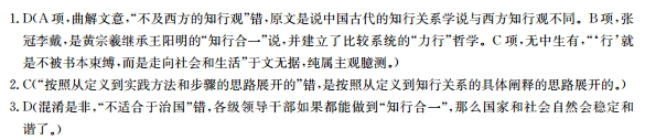 在“知”与“行”的关系问题上,儒家有较为深入的探讨。有知先行后、知易行难、知先行重、知行并进、知行合一等多种说法。 先秦已有“知易行难”之说。但先秦儒家还没有系统的知行观。汉代王充认为所有人都是“学而知之”的,但他对知行关系未做深入探讨。南宋朱熹提出了“知行相须”“知先行重”的观点,认为“知行常相须”“论先后,知为先'仑轻重,行为重”。陆九渊也有“致知在先,力行在后”的观点。王阳明则针对朱陆的“知先行后”说提出了“知行合一”说,认为知行关系是“知者行之始,行者知之成”“知行不可分作两事”。黄宗羲继承发展了王阳明的“知行合一”说,强调“圣人教人只是一个行”,“致字即是行字,必以力行为工夫”,从而把王阳明的“致良知”改造为“行良知”,建立了比较系统的“力行”哲学。王夫之则提出了“行可兼知,而知不可兼行”“知行相资以为用”等论。 以上种种知行关系说只是一种伦理政治学说,它与西方知识论意义上的知行观是根本不同的。 所谓阳明学,实质上是以“良知”为德性本体,以“致良知”为修养方法,以“知行合一”为实践工夫,以经世致用为为学目的的良知心学。王阳明论“知行合一”之说曰: 某尝说知是行的主意,行是知的功夫。知是行之始,行是知之成,若会得时只说一个知已自有行在,只说一个行已自有知在。 知者行之始,行者知之成。圣学只一个工夫,知行不可分作两事。 知之真切笃实处即是行,行之明觉精察处即是知,知行工夫本不可离。真知即所以为行,不行不足谓之知。 我今说个知行合一,正要人晓得一念发动处便即是行了。发动处有不善,就将这不善的念克倒了。 须要彻根彻底,不使那一念不善潜伏胸中。此是我立言宗旨。 概括地说,王阳明“知行合一”论的内涵有三个要点:第一,知行只是一个工夫,不能割裂。而所谓“工夫”,就是认知与实践的过程。第二,知行关系是相互依存的:知是行的出发点,是指导行的,而真正的知不但能行,而且是已在行了,行是知的归宿,是实现知的,而真切笃实的行已自有明觉精察的知在起作用了。第三,知行工夫中“行”的根本目的,是要彻底克服那“不善的念”而达于至善,这实质上是个道德修养与实践的过程。显然,王阳明所谓的“知”即“吾心良知之天理”,其所谓“行”即“致吾心良知之天理于事事物物”的道德实践。可以说,王阳明的“知行合一”论在本质上是集道德、伦理、政治于一体的道德人文哲学。 王阳明“知行合一”、力行实践的精神为我们提供了一种科学务实的思维方法和精神动力,对于当前反腐倡廉,诚信施政具有警示作用。提倡“知行合一”,有助于在新的形势下推进中华优秀传统文化的传承发展,促进“人文化成”。 (选自《光明日报》2017年04月10日,吴光《“知行合一”的内涵与现实意义》) 1下列关于原文内容的理解和分析,正确的一项是(3分) A. 无论先秦的“知易行难”说还是王阳明的“知行合一”说,都不如不及西方的知行观有意义。 B.王夫之继承发展了王阳明的“知行合一”说,建立了比较系统的“力行”哲学。 C.王阳明的“知行合一”论认为“行”就是不被书本束缚,而是走向社会和生活。 D.王阳明“知行合一”、力行实践的精神对于传统文化的传承有着积极意义。 2. 下列对原文论证的相关分析,不正确的一项是(3分) A.文章第一、二段先简介儒家各种有关知行关系的学说,再重点介绍南宋明清的知行学说。 B.文章对比了我国古代知行关系学说和西方知行观后详细阐述了王阳明的“知行合一”学说。 C.文章对“阳明学”的阐述是按照从定义到实践方法和步骤的思路展开的,条理比较清晰。 D.文章简要地概括了王阳明知行合一论的内涵,并指出它对治国和文化传承发展的意义。 3. 根据原文内容,下列说法不正确的一项是 分) A.从“知”与“行”的关系问题上的探讨过程来看,南宋时期,系统的“知行观”已经初步形成。 B.王阳明“知行合一”论是使人止于至善,且特别突出“行”,所以说它是一种伦理政治学说。 C.知行关系是相互依存的,真正的知是伴随着“行”的知,真正的“行”是“知”在心中的“行”。 D.王阳明“知行合一”论主要是强调个人道德修养,但不适合于治国。 参考答案 1、D 2、C 3、D