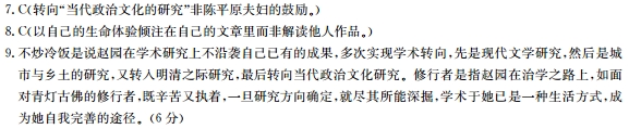 赵园:不“炒冷饭”的修行者 宋静思 初识赵园先生,是在几年前老师的一次家宴上。细边椭圆眼镜,中式对襟盘纽上衣,她看起来气质端庄、气色甚好,斯文的言语里不仅有丰厚的学识涵养,还透着一股英武之气,让人瞬间联想到古代士大夫的清雅。 几年过去,除了增添些许白发,时光似乎忘了这位古稀老人,她的行动依然干净利落,完全看不到曾被疾病纠缠的影子。在人数较多的私人场合,她似乎有些惧怕喧嚣,抑或是在细致观察,一旦进入学术探讨用艮镜后就射出深邃的光,整个人也不再岑寂。 赵园先生是河南尉氏人用945年生于兰州用969年毕业于北京大学,20世纪70年代末在北京大学师从王瑶先生攻读文学硕士,后任职于中国社会科学院文学研究所,出版了《艰难的选择》《论小说十家》等多部对学界影响深远的研究著作。以至于在现代文学研究界,如果学界同仁遇到一位颇具潜质的女弟子用主往会赞叹:“说不定又是一个赵园。” 这样的学术成就和赞誉,在她自身看来充满了偶然。从北大毕业后,时代的扰攘使她未能继续深造。她回到河南农村插队,去了一所偏远的中学,如一粒沙尘被挟裹进洪流之中,一晃便是十年之久。在那段时光,除了鲁迅的著作,她很难搜寻到与后来的学术研究有关的阅读记忆。当重返北大,她已过而立之年,甚至连《子夜》《骆驼祥子》这样的作品都没有读过。最终,她实现了这次命运的转折,与年龄更大、已近不惑的钱理群、吴福辉等同期入学。有了一把年纪的人再重返学校,就像是面对青灯古佛的修行者,一面是凄凄然的辛苦,一面是千淘万漉的执着。 在20世纪80年代那种空前自由开放的氛围中,赵园得以从过去捆绑自我的束缚中解脱出来。她进入郁达夫、老舍等人的作品,一发不可收,写出了《艰难的选择》和《论小说十家》等著作。她把自身的苦痛、困惑、迷茫投入到对象世界的关照中,把自己的生命体验倾注在文章里,从而把五四一代知识分子的遭际写得丝丝入扣。这时的赵园用令峻、敏锐、细腻,她对人物和作品的解读有一种理性的直觉用艮容易引起读者的共鸣。 激情消退之后,她逐渐变得宁•平和,其文笔也更加沉郁。在《北京:城与人》和《地之子》里,她聚焦于对“城市”与“乡土”的关照,有读者便体味出了她“对前尘往事的回忆。事实上,赵园先生对市民、农民及知青群体的研究,自始至终贯穿着对人的关照。回首去看,或许我们更能理解她“在最深最无望的孤独中,我所渴望过的,正是这和煦亲切的人的世界”的剖白。无论如何,那种“内在于人生”的思索和带有涩味的文化品位用匕集体追忆、个人留恋更为深刻。 “‘炒冷饭’是我所不愿的。”赵园先生这句话是她学术转向最好的注脚。研究方向确定,她会尽其所能深掘用即便没人喝彩,也不影响我的兴致”。但一旦完成用更有可能陷入“走投无路”的失落。20世纪90年代后期以后,她就曾对自己已有的学术研究产生“厌倦”。在好友陈平原夫妇的鼓励下,她转向了明清之际的研究用r续写出了《明清之际士大夫》《家人父子》等著作。而近期,她又将目光聚焦于当代政治文化。“对于我来说,重要的问题是,找到什么样的研究对象来激发我的热情。那对象应当有挑战性,而且有助于我的知识积累。”从这个意义上说,学术于她已然是一种生活方式用经由学术读解世界,同时经由学术而自我完善。 纵观她的学术之路,尽管有多次转向,但对人伦的关切和对历史的关照,却是她研究中一以贯之的脉络。她的作品解读和人物研究,不只是文字里流淌出较为强烈的个体价值和个人体验,更是将重新发现人的个性作为价值追求。她转向明清之际的研究后,也不像传统史家那般,单纯借助史料还原历史现场或者进行理论建构,而是主要从士大夫们的文字和记述入手,去探寻他们精神生活的幽微,他们内在的日常性、差异性和多样性。古希腊哲人讲“诗比历史更普遍,更真实就在于倾向于表现的诗更能呈现历史个体之间的微妙关联,更为生动具体地呈现真相。赵园以一种偏文学式的路径进入明清之际,也可以看出她在根脉上对原来专业的不离不弃。 (选自《人民日报》2016年8月20日) 7. 下列理解和分析,不符合原文意思的一项是(3分) A. 赵园大学毕业后曾在农村中学任教10年,等重返北大时已年过而立,但她执着坚守,终于学有所成,这说明只要肯努力,什么时候都不算晚。 B. 赵园在对“城市”与“乡土”的研究中,自始至终贯穿着对人的关怀和对历史的关照,这与她最想过的“正是这和煦亲切的人的世界”密切相关。 C.在对自己已有的学术研究产生厌倦时,赵园在陈平原夫妇的鼓励下,转向了明清之际和当代政治文化的研究,而且都取得了成功。 D.在研究明清之际时,赵园不仅借助史料还原历史现场或者进行理论建构,更去探寻他们精的。 8. 下列对材料有关内容的分析和概括,不正确的一项是(3分) A. 赵园气质端庄,言语斯文,既有丰厚的学识涵养,又有英武之气,清雅犹如古代士大夫。 B. 赵园师出名门,成就斐然,在现代文学研究界常以“说不定又是一个赵园”来赞叹颇具潜质的。 C.赵园以理性的直觉和自己的生命体验来解读郁达夫、老舍等作品中的人物因此获得读者的共鸣。 D.赵园的明清之际的研究,主要从士大夫们的文字和记述人手,这根植于她对原专业的不离不弃。 9.为什么说赵园是一