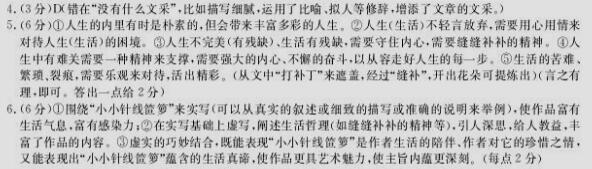 绣朵花当补丁 张金凤 “补丁”是个旧词,已经逐渐遥远,也许有一天会从我们的词典中走失。我有幸学会粗糙的针线活,得益于母亲教给我的打补丁的人生真谛。 我有一个精巧的针线笸箩,是母亲作为陪嫁郑重送给我的。针线笸箩是母亲亲手糊制,她把旧报纸捣成糊糊,搅拌些防虫的药材和糯米汁,然后依着模子糊成。纸糊的针线笸箩像个圆形的小箱笼,顶上还带着盖子,内里朴实的笸箩外层用彩色蜡花纸装饰,就显得绚丽美观,这就像母亲的生活哲理,内里是朴素的,却经常想办法给生活添点花色。 针线笸箩里有母亲精心准备的嫁妆:一把锋利的剪刀,一捆花花绿绿的彩线,大小不同的银针、顶针、针锥,小巧的粉布袋,还有一些花花绿绿的崭新布片儿。给我展示这特殊的嫁妆,母亲说,现在虽然很少动手做衣裳,但居家过日子,还是需要一个针线笸箩,扣子掉了需要钉,裤脚儿开了需要缝,以后的日子里,你用得着这个。 陪嫁针线笸箩是我家乡的风俗,在那个一切都要动手做的年代,针线笸箩就代表了女红,裁裁剪剪,缝缝补补,针线活儿是女人们的舞台和生活主色调。可是商品时代,改个裤脚儿都有专门作坊,一个针线笸箩似乎只是顺应母亲传承风俗的心意而已。 结婚之后,我把针线笸箩作为一件古董收藏,不久,我又诚心实意地把它从衣柜深处请出来。先生的衣服纽扣松了,怕不小心把纽扣掉落在外边,难以配上同样的,只能急忙找出针线笸箩,防患于未然,将那松动的和未松动的扣子,逐一牢牢固定;又过了不久,我有件衬衣的纽扣“不辞而别”,幸亏我及时发现遗落在地上的它,于是也赶紧拿针线“规劝”一番……此后的日子里,我就端着针线笸箩开始一个家庭妇女缝缝补补的生活。生活中难免在柴米油盐和烟熏火燎中生出磕磕绊绊,有一个个隐约的窟窿。但怎么能轻言放弃呢,我们需要以无比虔诚的心穿针引线,用细密的情感和针脚,缝补它的裂痕和伤口。 我结婚已经二十多年,母亲也已离世十余年,但是她送我的针线笸箩一直陪伴着我,我越来越珍惜它。因为小小的针线笸箩里面蕴含着多少生活真谛和母亲的祝福。 那一小布袋大小不同的扣子是生活的备胎,有些东西,丢了是找不回来的,你必须另外挑选哪怕逊色一点的及时补上去,就算花色不相同,也弥补了残缺。人生哪有那么完美,残缺了,生活就风侵雨蚀,一颗纽扣及时地守住你的内心,安抚你的困窘。那些小小的布片儿,就是生活的补丁,用剪刀来挑选、裁剪,用它们来填补生活的漏洞。缝补,自然不是原装,不会完全符合原初的梦想,但缝补就是不放弃,就是让抛锚的车继续旅程。生活是粗粝的,随着岁月的打磨,伤痕会很多,我们需要这种缝缝补补的精神。 那顶针是一个小的圆环铁箍,银白色的戴在手上,像戒指一样好看,乡下的妇人和老婆婆,经常手戴着顶针,那是实用,也是美,更是生活的智慧。顶针的表面有许多小小的凹孔,来迎接针的尾部,一根细小水滑的银针,需要扎透厚厚的衣裳和布壳子。那些坚硬的生活块垒,一根滑溜溜的细针难以顺利穿透,顶针恰恰给它一种依靠和力量。生活中有些坚硬尖锐的关口,是很难顺利通过的,所以需要内心打磨一个顶针,对着那些磐石一样的坚硬处,迅速地推进你的针,到达你的目的地。针锥有粗大的针尖,还有倒钩,手握的部分是一块沉甸甸的铁柄,这是更坚硬的精神支撑,在遇到巨大障碍的时候,用它先去打头阵,将一切阻碍洞穿后让我们的针——生活的理想——从容通过。粉布袋是一个沉默的荷包,内有一包粉末和一根来回拉伸的线,缝被子、棉衣的时候,需要针线长途跋涉,一根粉线引导着针线走得不偏不倚,走出一条漂亮的直线。 一个小小的针线笸箩里,承载着宏大的人生和无边的智慧。使用针线笸箩的过程中,我慢慢明白,母亲的一生为什么过得从容而不乏辉煌,她就是用一种缝补的精神去裁剪人生,那些苦难、繁琐、裂痕,一地鸡毛的琐碎和冗杂,都被母亲果断地剪下丢弃,用一块新的心气儿去打补丁,将生活的粗粝和残损遮盖过去。 粉布袋、剪刀、顶针、五彩的线,绣朵花儿当补丁,这就是母亲的人生。 (2018年7月7日《人民日报》第12版,略有删改) 4.下列对文本相关内容和艺术特色的分析鉴赏,不正确的一项是(3分) ( ) A.文章中的“小小的针线笸箩”在行文结构上起到穿针引线的作用,能自然巧妙地将文章的有关材料连缀起来,使文章井然有序。 B.“我有件衬衣的纽扣‘不辞而别’……于是也赶紧拿针线‘规劝’一番”“粉布袋是一个沉默的荷包”运用了比拟的修辞,增强了文章的形象性和感染力。 C.文章中“小小的针线笸箩里面蕴含着多少生活真谛和母亲的祝福”,是我在使用针线笸箩的过程中才慢慢懂得的,更是寄托了我越来越珍惜它的原因。 D.文章叙述真实,说明清楚,感悟自然,取材富有生活气息,运用的语言朴实无华,虽然没有什么文采,但字里行间流露出作者对母亲深深的感激与怀念之情。 5.文章中说“一个小小的针线笸箩里,承载着宏大的人生和无边的智慧”,请结合作品简要分析。(6分) 6.文章中有实写和虚写,虚实结合。这种写法有哪些好处?请结合作品作简要分析。(6分) 4、D