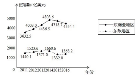 D.“一带一路”建设促进了我国与东南亚地区和东欧地区的贸易增长。在2011-2016年六年期间,我国与东南亚地区和东欧地区的贸易额呈总体增长趋势。