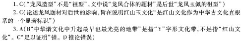 “直根系”这一概念是苏秉琦先生在20世纪80年代提出来的。苏先生认为,中华文明起源所涉及的范围是从关中西部起,经山西全境向西北至内蒙古河曲地区,向东北经冀西北延伸至辽西地区,形成“Y”字形文化带。这一地带是中华诸文明升起最早也是最光亮的地带,也是“中华文化总根系中一个最重要的直根系”。红山文化处在“Y”字形的右上部,是直根系的一个重要组成部分。 红山文化和中华古文化都有着高度发达的祖先崇拜。中国没有传统的宗教,以血缘为纽带的祖先崇拜是中国人信仰和崇拜礼仪的主要形式,也是中国文化传统的根脉。安阳殷墟西北岗王陵区内上千座祭祀坑和卜辞中对先公先王各类祭祀礼仪的记载表明,商代的祖先崇拜十分发达,为国家重典,礼繁而隆重,向前追溯到史前时期顺理成章,但目前所知的史前文化中,只有五千年前的红山文化可以与之有较为紧密的衔接。红山文化被认定为中华古文化直根系,发达的祖先崇拜是一个主要实证。 祭祀遗存的规范化也是理解红山文化为中华古文化直根系的重要方面。苏先生最早注意到辽西地区的红山文化,是在发现东山嘴遗址之时。这个遗址面对河川和大山山口的高岗、布局以中轴线为中心南圆北方、左右对称,这完全不同于其他史前文化,却与后世建筑,特别是礼仪性建筑如天坛、太庙、明十三陵的布局相近。红山文化建筑地址的规范化可视为中国传统祭祀礼仪的源头所在。 红山文化是史前两大玉文化中心之一,其玉文化具有高度抽象化又高度规范化的特点。以其中的龙和凤题材为例,红山文化玉器中的龙凤造型都已定型化,商代玉龙与玉雕龙在造型上一脉相承,玉风的翅与尾的表现方式也与商代青铜器上的凤鸟纹如出一辙。尤其是红山文化中已出现的龙凤合体题材,而且设计精妙,神态成熟,是后世玉器基本造型龙凤玉佩的祖型。这是红山文化作为中华古文化直根系的一个显著标识。 同玉器规范化和制度化相关的,是红山文化特殊的埋葬习俗,其中最重要的一个现象是“唯玉为葬”。玉器作为古代墓葬随葬品,见于全国各地各时期的考古文化,但唯红山文化只葬玉器而不葬其他陶石器等。玉器是一种被赋予思维观念的非实用器,有别于来自生活和生产等实用性的其他随葬器物。独以玉器为唯一随葬品而排斥其他,当反映红山人精神重于物质的观念。礼的源头,是理解红山文化为中华古文化直根系的重要方面。王国维释“礼”字的初型为“以玉事神”。红山文化“唯玉为葬”的习俗是礼起源于史前时期最为典型的证据。一般认为,礼是从夏商周三代开始的,现将中国传统礼制的起源追溯到五千年前的红山文化,这就再次确立了红山文化在中华文化总根系中的直根系地位。(摘编自郭大顺《为什么说红山文化是中华古文化的“直根系”》) 1.下列关于原文内容的理解和分析,不正确的一项是(3分) A. 红山文化是中华文化直根系的重要组成部分,至今已经有五千多年的历史。 B.红山文化是目前所知唯一能与商代祖先崇拜形成较为紧密衔接的史前文化。 C.红山文化玉器中龙凤造型与商代极其相似,也是后世玉器龙凤玉佩的祖型。 D.红山文化唯玉为葬,不葬其他实用性器物,是国内各地考古文化中独有的。 2. 下列对原文论证的相关分析,不正确的一项是(3分) A. 文章从四个维度充分论证了红山文化在中华文化总根系中的直根系地位,层次清晰。 B.红山文化与后世文明之间存在渊源关系,这是论证红山文化直根系地位的关键所在。 C. 第四段详述红山玉文化龙凤题材的影响,旨在证明其具有高度抽象化和规范化特点。 D. 中国传统礼制的起源可以追溯到红山文化,王国维对“礼”字的阐释是其有力佐证。 3.根据原文内容,下列说法正确的一项是(3分) A. 在研究过程中,既重视文物、遗址的发掘,又关注文献资料,二者相互印证,是考证古代历史文化的重要途经。 B.红山文化作为直根系的重要组成部分,处在“Y”字形的右上部,是中华诸文明之中升起最早也最光亮的地带。 C.东山嘴遗址南圆北方、左右对称的布局,不同于其他史前文化,足以证明中国的传统礼仪起源于红山文化。 D.如果红山文化中没有“唯玉为葬”的习俗,中国传统礼制将失去源头,红山文化也将难以确立其直根系地位。 1、C 2、C 3、A