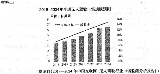 材料一: 无人驾驶的研究开始于20世纪70年代,从美国谷歌、英国 Venturer联盟和阿联酋的“EZ10”等,到中国的百度,无人驾驶都已经进入到路试阶段。虽然无人驾驶汽车也属于移动机器人和人工智能的一种,但是在市场应用上,与普通机器人及通用人工智能相比,无人驾驶汽车将在更短时间内得以普及。 无人驾驶汽车的各单元性能已满足当下的物流市场需求,其精度的提升主要依赖于导航技术的提升。配合互联网、物联网及持续提升的信息化平台技术的智能导航系统将会进一步提高无人驾驶汽车的市场应用能力。当然人工智能发展虽然神速,但无人驾驶汽车依然处于技术储备期,其性能全面提升尚需时日当路试完成后,为了进一步实现物流业降本增效,提升物流行业的全球竞争力,政府一纸行文全面鼓励无人驾驶或将成为大概率事件。 无人驾驶汽车极大地提升运输速度和运输效率,将会给物流业和物流企业带来较大冲击,智能装备替代有人司机,货运车辆变成了自动化运输网络中的智能装备。无人驾驶汽车带来物流的网络化、规模化和标准化将改善超限超载的低价运营状态,由此成为物流企业竞争的核心手段。 (摘编自《经济参考报》2018年5月29日) ![]() (摘编自《2018—2024年中国互联网+无人驾驶行业市场监测分析报告》) 材料三: 创新工场董事长李开复表示,无人驾驶落地除了技术,还需考虑到车辆、人员的保险和理赔等问题,在未来交通解决方案中, Hyperloop Kitty Hawk的飞车都给我们提供了无限想象。创新工场目前已经投资了4家无人驾驶公司。无人驾驶是以高效、便捷和可靠为具体目标的驾驶行为,需要人、车、路高度协同。广州公交集团董事长谢振东表示,无人驾驶整个生态是由各种产业链交织在一起形成的,目前无人驾驶的产业链尚未建立起来,未来需要从技术等各个方面做更多工作。在广州联通总经理廖江看来,无人驾驶要求车路协同,特别需要可靠的网络,5G技术和5G网络非常契合车路协同的要求。他说:“5G网络建设对自动驾驶发展很重要,然而5G本身建设有难度,它要求建更密集的基站,对运营商有很大的挑战。”广汽研究院郭继舜透露,广汽即将量产第一辆L3智能驾驶汽车,“但到现在为止,我们的主芯片由国外的一个供应商提供,有延期的风险。我们非常需要中国能先研发出合格的人工智能芯片,拥有足够的算力和功能安全。” (摘编自《科技日报》2018年11月28日) 材料四: 人类经过驾校训练,相对容易就可以掌握驾驶技能,但是用机器并非如此。中国工程院院士郑南宁说,对计算机而言实现逻辑推理等人类高级智慧只需要相对很少的计算能力,而实现感知、运动等智慧行为却需要巨大的计算能力。“人类思维是在记忆经验和知识的基础上进行預测模式分类以及学习的。每个人的大脑中都有预测的模型,对于驾驶行为而言,预测能力非常重要。”郑南宁表示,针对这些难题所开展的尝试,需要整合在基于认知计算引擎的自主驾驶系统中,这是无人驾驶研究领域值得研究的方向。 郑南宁表示,未来需要从脑认知和神经科学研究中得到启发,发展一种新的学习机器。“将神经科学和脑认知作为新的机器学习算法的灵感来源,使用这些知识来帮助我们思考在人工智能系统中如何实现同样的功能,是未来人工智能发展方向之一。”郑南宁说,“我们需要更多时间来发现受脑认知和神经科学启发的人工智能突破点在哪里。” (摘编自《光明日报》2018年12月07日) 4.下列对材料相关内容的理解,不正确的一项是(3分) A.当路试完成后,为了进一步实现物流业降本增效,提升物流行业的全球竞争力,政府极有可能出台政策全面鼓励无人驾驶。 B.据材料二可知,预测无人驾驶市场的规模与增长率都呈逐年上升态势,可见无人驾驶市场有着巨大的发展空间。 C.可靠的5G技术和5G网络可满足无人驾驶车路协同的要求,而密集的基站建设,对网络运营商也提出了挑战。 D.无人驾驶汽车需要有实现逻辑推理、感知运动等智慧行为的巨大的计算能力,同时还需要具有类似人类思维中的预测能力。 5.下列对材料相关内容的概括和分析,正确的一项是(3分) A.无人驾驶汽车已完成技术储备进入路试阶段,作为人工智能市场应用的一种,将要比通用人工智能及普通机器人更早地得到普及。 B.无人驾驶汽车用智能装备替代有人司机,极大地提升运输速度和运输效率,使得智慧物流保持超载低价状态的同时,更加网络化、规模化和标准化。 C.随着无人驾驶产业链的建立及完善,以高效、便捷和可靠为具体目标的无人驾驶将成为未来最终的交通解决方案。 D.若将受神经科学和脑认知启发的新的机器学习算法应用于人工智能系统,无人驾驶汽车或可实现新的技术突破,进而增强驾驶行为的预测能力。 6.一、三、四三则材料,对“无人驾驶”相关报道的侧重点有什么不同?请结合材料简要分析。(6分) 4.D.(概念混淆。原文是“对计算机而言实现逻辑推理等人类高级智慧只需要相对较少的计算能力,而实现感知、运动等智慧行为却需要巨大的计算能力”。) 5.D.(A.原文“无人驾驶汽车仍然处于技术储备期”,并非“完成技术储备后进入路试阶段”B.原文“物流的网络化、规模化和标准化将改善超限超载的低价运营状态”,并非“保持超载低价状态” 。C.原文“在未来交通解决中,Hyperloop公司的高铁、KittyHawk的飞车