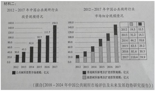 材料一: 每年的11月19日是世界厕所日。联合国设立它的初衷是讨论一些由厕所引发的问题,希望通过全球人民的努力,共同改善坏境卫生问题。 但是,拥有干净、教量充足的厕所其实是一件奢侈的事情。世界厕所组织一项最新调查显示,全球仍有高达獅的居民(26亿)从未使用过冲水厕所。每年,全世界由于卫生设施缺失致使150万名未满5岁的儿童死于腹泻,比艾滋病和疟疾共同造成的死亡人数还高。全球没有厕所的人高达数十亿,这意味着,人类生命的水和土壤狀量表经收集或处理的人类排进物污染,我们将环境变成了一个开放的下水道。如此大规模的人体排进物被直接排入环境之中,从而传播致命的疾病,对全球公共健康产生了破坏性影响。 卫生、干净的厕所可以拯救生命。根据世界卫生组织和联合国儿童基金会的报告,环境卫生的改羔结合安全饮水和良好的卫生服务。每年可以防止84.2万人死亡。其次,经过安全处理的废水很有可能成为能源、营养和水的负担得起的可持续来源。因而,厕所的革命,应体现在技术引领下的可持续发展。以技术革新为代表的厠所革命,将生法环境改造与生态环境发展相结合。将卫生清洁技术与自然的生态环保理念融为一体,是生态可持续发展的理想模式。厕所革命也将有力推动卫生扃所向生态厕所转型。目前,我国的厕所革命取得明显成效,厕所夜盖率已经由20年前的不到10%增加到今天的80%左右,但是欠发达地区和农村地区的厕所设施和卫生条件还比较落后,问题比较突出,仍然有24%的人口没有卫生厕所。 (摘编自《中国周刊》.2018年第12期) 材料二 ![]() (摘自《2018—2024年中国公共厕所市场评估及未来发展趋势研究报告》) 材料三:建国以来,我国的公厕经历了由露天公厕到传统旱厕再到水冲公厕的转变,同时公厕的设计观念也发生了改变,还兼顾到环保、城市的品位和人文关怀现在进行的“厕所革命需要进一步通过文化教化与舆论引导,倡导培养良好的文明如厕习惯和健康的生活方式,提升全民族的文明素养;需要加快科技创新,我国农村地区厕所发展滞后的一个重要原因是缺水,这就需要综合运用科技手段,资源化处理厕所废物,变庚为宝,让“厕所革命”成为发展,循环经济和生态经济的重要一环。小厕所关系大民生,只要我们发扬钉钉子精神,真抓实干,坚持不懈推进这项工作,就一定能够加长制约城文明提升的这块短板,更好地推动社会文明进步。 (摘编自中国社会科学网《厕所革命:折射—个乡村—座城市的文明程度》) 材料四: 眼下正如火如荼地在中国各地城乡开展的厕所革命,终将逐漸地改变中国民众日常生治中那些最难以为人们所自觉到的深层的观念,亦即涉及排世的行为、观念和环境的全面改观。 但必须指出的是,无论中国的厠所文明已经和将要发展到怎样的高度,它也无法避免地具有脆弱性,这是因为支撐着现代厕所文明的基础设施,亦即复杂的城市上下水道体系,原本就始终是脆弱的如果我们不把厕所问题局限于“卫生间”及其周边的那些有限的事项,而是把它和更为庞大的废水处理系统,和中囯社会的水资源、水环境,和中国社会的公共性缺失等问題相互联系起来,那么,厕所问题其实就是中国社会总问题的冰山一角。眼下的厕所盖命之于中国社会而言,还有很漫长的路程要走。 (摘自《厕所革命在中国》,《新华月报》2019年第1期) 4.下列对材料相关内容的理解,不正确的一项是(3分) A.厕所数量的不足、非洁净厕所的缺失,会导致水和土壤被严重污染,更会对人类的生命安全构成破坏性影响。因而,进行厕所革命意义重大。 B.2017年全国公共厕所投资市场规模15O.3亿元,与前一年相比,增速超过30%;2012-2017年,我国公共厕所投资年增速一直处于20%以上。 C.在我国的部分地区,简陋的厕所设施,以及多年来形成的如厕陋习等,使厕所问题成为制约城乡文明提升的一块短板,影响了社会文明进步。 D.我国的厕所革命已经取得了显著的成果,但依然存在不少问题,尤其是厕所文明的脆弱性,将会造成支撑现代厕所文明的基础设施的脆弱 5.下列对材料相关内容的概括和分析,不正确的一项是(3分) A.厕所贴近普通民众,其演进是人类生产力进步和科学水平不断提升的结果;厕所革命应突出生态环保理念,降低环境污染,发展循环经济 B.从材料二的数据来看,近几年我国旅游厕所新增及扩建投资规模增速要普通公厕,主要原因就是政府对旅游蚵所的重视度更高。 C.厕所能反映个人和公众的生活和精神特质,因而也能映照出文明和进步程度。人们可以说,探讨文明的差距,似乎就是一个厕所的距离。 D.原本平常的生活设施,却被接予“革命”之意,可见厕所革命绝不仅是盖房子而已,这应是一场产业革命.一场社会革命,一场文化革命。 6.我国的厕所革命尚未完成,怎样才能有效推进厕所革命呢?请结合材料简要概括。(6分) 参考答案 4(3分)D 本题中,D项,“尤其是厕所文明的脆弱性,将会造成支撑现代厕所文明的基础设施的脆弱”错误,选项错置因果,材料四中说的是“它也无法避免地具有脆弱性,这是因为支撑着现代厕所文明的基础设施,亦即复杂的城市上下水道体系,原本就始终是脆弱的”,由此可知,“支撑现代厕所文明的基础设施的脆弱”应是“厕所文明脆弱性”的原因,选项将二者的关系说反了。故选D。 5(3分)B 本题中,B项,“主要原因就是政府对