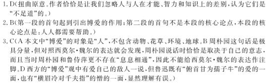 一切爱的形式都以博爱为基础。我指的博爱就是对所有的人都有一种责任感,关心、尊重和了解他人,也就是愿意提高其他人的生活情趣。这也是《圣经》里提到的一种爱的方式:爱他人应如爱己。博爱是对所有人的爱,其特点是这种爱没有独占性。如果我具有爱的能力,我就会去爱我周围的人。在博爱中凝聚着同所有人的结合,人的团结和统一。博爱的基础是认识到我们所有的人都是平等的。同人共有的核心相比,人与人之间在才能、智力和知识上的差别微不足道。要了解这种人共有的核心,必须要深入了解人,而不是停留在表面。如果我只看到一个人的表面,那我看到的主要是使我和他分开的差别。如果我了解到他的本质,我就会看到我们的共性,我们是兄弟这一事实。这样的一种核心对核心的关系——用来取代表面对表面的关系——是一种“中心关系”。西莫尔•魏尔曾经很优美地表达过这种关系:“同样的话可以是很一般的,也可以非同一般,这要按说这些话的方式而定。说话的方式则取决于这些话发自内心的深度,而不取决于个人意志。在双方息息相通的情况下,这些话会触动对方相等的内心深度。所以一个有能力区别的人就会听得出来这些话的分量究竟有多大!” 博爱是同等人之间的爱。但虽然我们是同等的,事实上也往往不完全“同等”,因为我们是人,所以需要帮助。今天是我需要帮助,明天也许是你。有这种要求并不意味着一个人弱小,另一个人强大。弱小是一种暂时状态,而自力更生,走自己的路的能力是普遍的持续状态。 对需要帮助的人,对穷人和陌生人的爱是博爱的基础。爱自己的骨肉不足为奇。每个动物都爱自己的后代并照料他们。软弱的人爱自己的主子,因为他靠主子为生;孩子爱自己的父母,因为他需要他们。只有当我爱那些与我个人利益无关的人时,我的爱情才开始发展。在《旧约》中,穷人是人爱的中心就说明了这一点,当然不仅是穷人,还有陌生人、寡妇、孤儿、民族的敌人、埃及人和伊多姆人。在对那些需要帮助的人产生同情的过程中,人开始发展他的博爱。在爱自己的同时,他也爱那些需要帮助的人,爱那些虚弱和惶恐不安的生命。同情包含着了解和认识的因素。在《旧约》里这么写道:“因为你们了解异乡人的心,因为你们也曾在埃及当过异乡人……所以你们也应该热爱异人! ” (摘编自弗罗姆《爱的艺术》) 1.下列关于原文内容的理解和分析.不正确的一项是(3分) A.一切爱的形式都以博爱为基础,博爱则是以对需要帮助的人,对穷人和陌生人的爱为基础的。 B.弗罗姆认为,人与人的共性是由人的本质决定的,而要了解这种本质,就必须深人了解人。 C.虽然每个人一生的路要靠自己走,但并非没有需要别人帮助的时候,求助不代表自 己弱小。 D.深入了解人,就是既认识到人人平等,也要清楚人与人之间事实上存在着的多方面的差别。 2.下列对原文论证相关分析,不正确的一顼是(3分) A.第一段定义“博爱”的概念、特点,然后从主体具有“爱的能力”延伸出博爱的基础、前提和内在必然性。 B.本文以每段的起首句为该段的核心论点,层次清晰;全文围绕着“博爱”这个中心话题进行论证。 C.本文作者在写作中需要加强自己的论证力时,也要引经据典,《圣经》就多次被拿来当做道理论据。 D.例证法中的事例可以是较为具体的故事,也可以列举若干事实,第三段中的举例形式就是后者。 3.根据原文内容,下列说法正确的一项是(3分) A.爱护动物,爱护一花一草,爱护环境,爱护我们赖以生存的地球,都体现着文中“博爱”的理念。 B.《雷雨》中周朴园的那句极具分量的话“谁指使你来的”,正好可以给西莫尔•魏尔的表述作注脚。 C. 一个人拥有了“博爱”的情怀,做到“老吾老,以及人之老;幼吾幼,以及人之幼”就不难了。 D.中国民族魂鲁迅“俯首付为孺子牛”的情怀,与文中《旧约》所倡导的“博爱”观完全一致。 参考答案 1、D 2、B 3、C