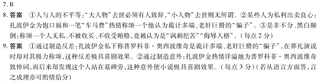 演说家 [俄]契诃夫 早上,八等文官基里尔•伊凡诺维今•瓦维洛诺夫下葬。在送填行列离开教堂前往墓地的时候,死者的同事,一位姓波普拉夫斯基的人,去找他的朋友格里戈里•彼得罗维奇•扎波伊金。这个扎波伊金,具有 一种罕见的才能,他擅长在婚礼上,葬礼上,各种各样的周年纪念会上发表即席演说。 “我呀,朋友,找你来了!”波普拉夫斯基正碰到他在家,说快穿上衣报,跟我走。我们有个同事死了, 这会儿正打发他去另一个世界=要是死个小人物,我们也不会来麻烦你,可这人是秘韦——某种意义上说,是办公厅的台柱子。给这么一个大人物举行葬礼,没人致辞是不行的。” “啊,秘书!”扎波伊金打了个哈欠,“是那个酒鬼吧?” “没错,就是那个酒鬼。这回有煎饼招待,还有各色冷盘……你还会领到一笔车马费。走吧,亲爱的!到了那边的墓地,你就天花乱坠地吹他一通,到时我们就千恩万谢啦。"扎波伊金欣然同意。 “我知道你们那个秘书,”他说着生上出租马车,“诡计多端,老奸巨猾,但愿他升天,这种人可少见。” “得了,骂死人可不妥啊。" “那当然。对死者要么三缄其口,要么大唱赞歌,不过他毕竞是个骗子。” 为死者做了安魂祈祷,等大家安静下来,扎波伊金朝前跨出一步,向众人扫了一眼,开口了: “能相信我们的眼晴和听觉吗?这棺木,这些热泪涟涟的脸,这些呻呤和号哭,岂不是一场噩梦?唉, 这不是梦,视觉也没有欺骗我们!眼前躺着的这个人,不久前我们还看到他是如此精力充沛,像个年轻人一 样活泼而纯洁,这个人不久前还在我们眼前辛勤工作,像一只不知疫倦的蜜蜂,把自己酿的蜜送进国家福利这一总的蜂房里。如今却已变成一堆骸骨,化作物质的幻影。不可弥补的损失啊!現在有谁能为我们取代他呢?好的文官我们这里有很多,然而普罗科菲•奥西波维奇却是绝无仅有的!他直到灵魂深处都忠于他神圣的职责,他不吝惜自己的精力,通宵达旦地工作,他无私,不收受贿赂。他疾恶如仇,那些想方设法损害公共利益的人,蟬些利用种种诱人的生活福利来拉扰他,让他背弃自己职责的人,统统遭到他的鄙视!由于他忠于职守,一心行善,他不知道生活的乐趣,甚至拒绝享受家庭生活的幸福。你们都知道,他至死都是一个单身汉!就在此刻我也能看到他那张刮得干干净净的、深受感动的脸,它对我们总是挂着善意的微笑;就 在此則我也能听到他那柔和的、亲切友好的声音。愿你的骸骨安宁,普罗科菲•奥西波维奇!安息吧,诚实而高尚的劳动者!" 扎波伊金继续说下去,可是听众却开始交头接寻。首先,大家务不明白,为什么演说家称死者为普罗科菲•奥西波维奇,死者明明叫基里尔.伊凡诺维奇呀。其次,大家都知道,死者生前一辈子都同他的合法妻子吵架,因此他算不得单身汉。最后,他留着红褐色的大胡子,为什么演说家说他的脸向来刮得干干净净的。 "普罗科菲•类西破堆奇!”演说家眼晴望着墓穴,热情洋溢地继续说道,“你总是愁眉苦脸,神色严厉,可是我们大家都知道,你有一颗正直而善良的心!” 不久,听众开始发现,演说家本人发生了某种奇柽的变化。他定睛瞧着一个地方,不安地扭动身子,自己也耸起肩膀来了。突然他打住了,吃惊得张大了嘴巴,转身对着波普拉夫斯基。 “你听我说,他活着呢!”他惊恐万状地说。 “谁活着?” “普罗科菲•奥西波维奇呀!瞧他站在墓碑旁边呢!” “他本来就没有死!死的叫基里尔•伊凡诺维奇!” “可是你刚才亲口说的,你们的秘书死了!” “基里尔•伊凡诺维奇是秘本呀。你这怪人,都搞乱了!普罗科菲•奥西波维奇是我们的前任秘书, 他两年前就调到第二科当科长了。” “咳,鬼才搞得清你们的事!” “你怎么停住了?接着讲,不讲可不妙!” 扎波伊金又种身对着墓穴,凭他三寸不烂之音继续致中断了的悼词。基碑旁果真站着普罗科菲•奥西波维奇——一个脸面到得干干净净的年老文官。他瞪着演说家,气呼呼地皱着眉头。 “不好呀,年轻人!”行完葬礼跟扎波伊金一道返回时,普罗科菲•奥西波维奇理怨道,“您的邓些诂说 死人也许合适,可是用来说活人.这简直是试刺挖苦,先生!天哪,您都说了些什么话?什么无私呀,不被收 买呀,不受賄呀!这些话用朱说活人只能是侮辱人格,先生!” 一八八六年十一月二十九日 (有删改) 7.下列对本文相关内容和艺术特色的分析鉴赏,不正确的一项是(3分) A.波普拉夫斯基没有反驳扎波伊金私下对死者表达的看法和评价,这既暗示死者与其前任具有共同特点,又为后文扎波伊金的失误埋下伏笔- B.小说详细描写扎波伊金在葬礼上即席所致的悼词,主要目的在于与题目“演说家”相照应,突出其所具有的杰出的语言才能。 C.在作者笔下,听众只对扎波伊金所致悼词的对象是谁暗自怀疑,却没有怀疑悼词中对死者品格不切实 际的称颂,这样写饱含者作者的深意。D.契诃夫的小说具有强烈的讽刺意味,这篇小说讽刺的对象几乎是文中涉及的所有人物,包括听众,而不只是“演说家”扎波伊金。 8.契诃夫是19世纪后期俄国批判现实主义短篇小说大师,请分析这篇小说对当时的现实作了哪些批判。 (6分) 9.小说极具喜剧效果,这种效果是如何制造出来的?请简要分析。(6分) 参考答案 7、B