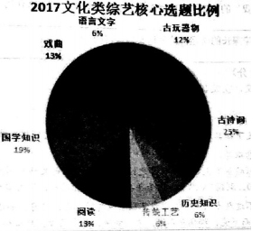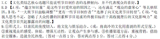 材料一: 知识类综艺一直都是电视台的杀手锏,隔三岔五来一次,总不会错。 因为,人本身对知识就有着天然的渴望,通过从小到大的学习,每个人都储备了一定的知识。而知识类综艺就是拿出某一方面知识去考验答题者,但答题者并非万能,当出现观众知道答案而答题者答不上来的情况,观众的虚荣心就得到了极大的满足;但若出现一类无所不能、无所不晓的答题者,观众又会有一种极其强烈的崇敬之心,心生“怎么可能”的五体投地之感。 在各类综艺霸屏的现在,知识类综艺总还是能占据一席之地。无论社会怎样变迁,对于知识的渴求依然旺盛,我们抛开那些比赛类综艺,其他的类似介绍某一工种的纪录片《我在故宫修文物》、介绍美食的纪录片《舌尖上的中国》等同样引起很多人极大的兴趣,这些综艺或者纪录片都蕴含极大的知识量,在看节目中学习,不也是老百姓一个小小的消遣吗? (摘编自《从<中国诗词大会>的走红聊聊国内知识类综艺节目》 材料二: 近年来,针对电视娱乐节目过多、跟风现象严重、内容质量不高等问题,相关部门下发了多项被业内称之为“限娱令”的相关政策。每有相关政策出台,伴随而来的是一大批节目面临调整。更有一些节目制作者因政策转向,选择了向文化类节目转型,以保守方式进行所谓“安全”的制作。 记者注意到,目前很多文化类节目收视并不理想,不少卫视刚刚摆脱唯收视率的极端,又陪入了无收视率的尴尬。如果说,曾经业内担心的是真人秀的泛滥因而质疑文化类节目到底“有没有”,那么当文化类节目兴起,同样需要提出到底“好不好”的疑问。毋庸置疑,文化类节日要努力提高节目质量,力求实现收视和口啤双丰收的效果。 央视科教频道副总监阚兆江曾表示:“文化类节目的挖掘目前还远远不够。”在他看来,一些文化类节目之所以受到质疑,一个重要原因是电视人思考不足,缺少应有的探索和努力,使得文化的呈现方式出了问题,把握文化含量、层次时忽略了大众传播的因素,忽略了节目追求的终极目标在于高收视背后的文化影响力。 (摘编自《别让“限”成综艺回归文化的动因》) 材料三 ![]() (摘编自人民网) 材料四 《国家宝藏》能够成为“网红”,就是国为它从大众比较喜闻乐见的“八卦”的视角解读国宝,而日本富士电视台的《我们一起学艺术》、英国数字频道CBBC的《Horrible History》能够在本土火热,也是因为他们将高冷的文化用喜剧的形式呈现在观众面前。 以色列Armoza的益智答题类文化节目《Who’s asking》,通过让观众提问的方式来增强观众的参与,节目里选手需要作答的问题全部来自环形大屏上的场外观众。而德国的《Time Travel Show》则通过复原某一时代内客的特定背景,营造沉浸式的观看体验,让观众跟随选手在不同时代穿梭。 《朗读者》在播出期间设立了朗读亭,借此扩大自身的影响范围;《见字如画》将节目切割成短视频,并推出“与你见字如面”的社交应用,吸引了人们的注意力;而《国家宝藏》则将B站作为自己的“热度发酵地”,以此打破“次元壁”,引发全民热议。 摘编自《从<中国诗词大会>到<一本好书>,文化类综艺的爆款方法论》) 7.下列说法,不符合文意的一项是(3分) A.材料一揭示了知识类综艺走红的心理原因,无论社会如何变迁,人们对于知识的天然渴求未曾改变。 B.虽然目前很多文化类节目收视并不理想,但与其它跟风现象严重、内容质量不高的电视娱乐节目相比,文化类节目的制作方式相对保守、“安全”。 C.由文化类综艺核心选题所占比例可知,观众对于古诗词怀有极大热情,节目制作者应在这一方面进行探索和努力。 D.《国家宝藏》能够成为“网红”,说明文化和娱乐并不是对立的,对于高冷的文化知识,比起一板一眼的说教灌输,寓教于乐的形式在今天显然更受欢迎。 8.下列对材料相关内容的理解和分析,正确的一项是(3分) A.因为《我在故宫修文物》《舌尖上的中国》等节目蕴含了极大的知识量,老百姓可以边看边学习,所以才引起了很多人的兴趣。 B.“限娱令”客观上促成了综艺回归文化,每次有相关政策出台,伴随而来的是一大批节目调整为文化类节目。 C.电视人思考不足,忽略了大众传播的因素和节目追求的终极目标在于高收视背后的文化影响力,随着文化类节目的兴起,这些问题迎刃而解。 D.现有的文化类节目多限于文学类文化类型,内容开掘上较为单一,有待于对更宽的文化类型范畴进行开掘。 9.从爆红到审美疲劳,国内才刚刚崛起的文化类综艺显然已经进入了瓶颈期,如何把传统文化融入当下生活,请结合材料四,谈谈你的建议。(4分) 答 7、C 8、D