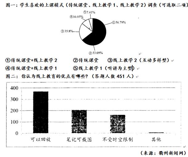 材料一: “云教育”是指基于云计算应用的教育平台服务。集教学、管理、学习等于一体,它搭建了一个可供教育主管部门、学校、教师、学生以及家长分工协作的在线平台,从而共同达成教学目标和育人任务。近年来,“云教育”受到国内外众多教育界人士关注,此次疫情的发生让“云教育”在我国得以大面积推广。不可否认,在实践过程中,“云教育”在新技术的运用、教学内容的设计、教育质量的保证等方面还存在一些问题。同时,“云教育”不可能完全代替线下教育,传统课堂仍具有无可取代的重要作用。当正常的教育教学秩序逐渐恢复,相信有关“云教育”的探索不会也不应停滞。 (摘编自杨国营《云教育拓展未来教育想象空间》) 材料二: ![]() (来源:衢州新闻网) 材料三: 国家中小学网络云平台于2月17日正式开通后,一直运行平稳顺畅,浏览人次逐步攀升,覆盖各省份。截至5月11日,国家中小学网络云平台浏览次数达20.73亿,访问人次达17.11亿。中国教育电视台空中课堂收视率大幅跃升,在全国卫视关注度排名进入前10。家长和学生普遍反映网络云平台界面清晰、使用便捷、内容丰富、资源优质、观看流畅。 “在‘停课不停学’工作中,各地充分利用现代信息技术手段,积累了宝贵经验。”教育部基础教育司司长吕玉刚介绍,教育部与工信、广电等部门在政策、技术上的密切合作是开展大规模在线教育的重要保障。线上教育为保障疫情期间“停课不停学”发挥了重要作用,促进了优质教育资源的共享共用,特别是为薄弱学校、艰苦边远农村地区输送了优质资源,是推进教育公平的重要途径。吕玉刚同时表示,这次在线教育实践,也暴露出网络运行保障能力还存在不足,体系化的优质数字教育资源不足,教师信息技术应用能力不足等问题,需要在今后的工作中加以破解。 如何保证在线学习与线下课堂教学质量实质等效?“教师需 要在实时交互的场景下,及时准确地采集学生的学习成效数据,随时调整教与学活动。在线教育要从‘单声道’向‘双声道’转变,从‘教师中心’向‘学生中心’转变。”清华大学在线教学指导专家组组长于歆杰介绍。 (摘自《国家中小学网络云平台浏览次数达20.73亿》,《人民日报》2020年5月5日) 17.下列关于“云教育”的理解和分析,不正确的一项是(3分) A.“云教育”集教学、管理、学习等于一体,有共享性、重复性、不受时空限制的便利性等优势,但也有自身的短板。 B.“云教育”要达成教学目标和育人任务,需要教育主管部门、学校、教师、学生以及家长的分工协作,缺-不可。 C.疫情期间“云教育”在我国能够大面积推广,得益于教育行政部门的重视与推动,工信、广电等部门的积极配合。 D.未来的“云教育”如果实现与线下课堂教学质量实质等效,将成为未来教育主流,并逐渐取代传统课堂。 18.下列对材料相关内容的概括和分析,不正确的一项是(3分) A.从材料二图一可以看出,课堂教学与互动式的线上教学融合最受学生青睐,听讲式的线上教学最不受欢迎。 B.从材料二可以看出,线上教育两种模式都具有课堂教学不可复制的三大优点,解决了传统课堂存在的问题。 C.这次疫情中,在线教育得到了广大用户的认同,他们普遍反映网络云平台使用便捷、内容丰富、资源优质。 D.新冠疫情期间,在线教育为全国中小学实现“停课不停学”提供了有力支持,产生了巨大的社会价值。 19.材料一结尾说:“当正常的教育教学秩序逐渐恢复,相信有关‘云教育’的探索不会也不应停滞。”请结合上述材料简要分析复课后“云教育”继续探索的必要性。(4分) 参考答案 17.D(3分)[解析]“逐渐取代传统课堂”错误,材料一中明确说“传统课堂仍具有无可取代的重要作用”。 18.B(3分)[解析]“解决了传统课堂存在的问题”不正确,从材料二中看不出线上教育能解决传统课堂存在的问题。 19.①云教育”具有内容丰富、资源优质、使用便捷等优势;②疫情期间“云教育”受到了广泛的欢迎,是推进教育公平的重要途径;③网络运行与技术运用能力还存在不足;④教学内容的设计与教学质量的保证还存在不足。 评分意见4分,每点1分,意思相同即可。