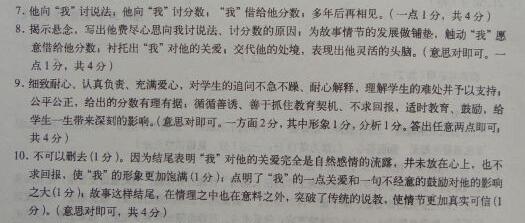 一阵小跑声过后,学校走廊里,一个男生小声而急促地叫我。我立定问他:“有什么事吗?” 他期期艾艾地说:“我——我能到你的办公室去说吗?”我点点头。他进来后,小心翼翼关上门,将手里卷着的画纸摊开在我面前说:“老师你看,我觉得自己画得挺好的,为什么只有65分呢?我看他这张还没我的好呢,他都70分呢。”他把同桌的那张画也摊了开来。 啊,原来是来讨说法的。这是一张美术作业,临摹书上的一幅写意国画《梅花麻雀图》。这算是期中考试了。 两张画摊在桌上,我给他分析:“你这张,梅花点得还蛮像样,麻雀的形体姿态也不错,可偏偏是‘点晴之笔’不准确,眼睛画偏了,这不是犯了常识性的错吗?他这张也有缺点,梅花浓淡深浅缺少变化,但作为画面主体的麻雀画得还是到位的……” 他听明白了,似乎也服气,但还不走,磨磨蹭蹭,抓了一会儿头皮,终于说出了要说的话:“老师,你这次能不能开开恩,送我5分,下次还你,行不行?” 我笑了起来,教书好些年了,还没碰到过这样的学生。 “你说说看,为什么一定要送你5分呢?” “你表扬过我的,说过我画画蛮好的。” “啊,我表扬过你?” “是的,你表扬过我两次,一次画素描头像,你说我暗部画得蛮透气,没有闷掉。还有一次画水彩,你说我天空染得蛮透明,没有弄脏。” “可是这次你只能得65分呀,再说这是考试,老师应该公正,是不是?” “可是我这次已经向我爸说过我美术考得不错的,否则老爸要说我吹牛,又要打我的……” “65分已经超过及格线了,以后再努力一下就是了。” “不不不,老师,我只好实话告诉你,这次期中考,几门主课我都没考好,语文65分,英语刚及格,数学只得了55分。我爸气死了,用皮带抽我,用脚踢我,说我没有一门考得像样,我说我副科蛮好的,美术至少能考70分……老师,你看——” 他撩起一条裤腿,露出了几条青紫的伤痕。 我不再多说,拿出一张宣纸,让他重画一幅。 半小时后,我用朱笔在他的画上写了个“70”,很醒目。出门时,他向我鞠躬,又轻轻问一句:“老师不会告诉其他同学的,对吗?”我含笑。 多年以后…… 我在地铁月台上等车,一旁座椅上一个男子向我微笑行注目礼,而后站起来说:“您不是教我们美术课的老师吗?” “你是?”我记不得他是哪位了。 “我就是那个向你讨分数的学生呀!”于是我想起了20多年前的那一幕。月台上, 我俩相互把上述故事一点点补充完整。 我问他现在在哪里工作,他说了一家公司的名称。 “那么,你现在是否经常向你的老板要求加薪?”我和他开起了玩笑。 他笑了,有些腼腆地说:“我们公司人不多,我当家。” “啊,那你就是老板了,你后来学的什么专业?” “计算机专业,毕业后搞软件设计。” “你过去数学好像不怎么好的,怎么选了这一行?” “老师,你还记不记得,那次在你办公室里你对我说的一句话,你说,像你这么聪明,想得出讨分数的人,怎么可以数学不及格?” 我说过吗?记不清了。可是他却一直记着,并为此改变了自己。 (摘自《新民晚报》2015年11月15日,作者:徐慧芬) 7.请概述“我”和“他”之间的故事。(4分) 8.文中画线部分有什么作用?请结合具体内容进行分析。(4分) 9.文中的“我”是个什么样的老师?请简要分析。(4分) 10.有人说,最后一段可以删去,你认为呢?请说出你的理由。(4分) 参考答案
