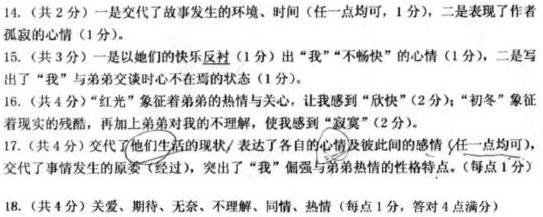 萧红 初冬,我走在清凉的街道上,遇见了我的弟弟。 “莹姐,你走到哪里去?” “随便走走吧!” “我们去吃一杯咖啡,好不好,莹姐。” 咖啡店的窗子在帘幕下挂着苍白的霜层。我把领口脱着毛的外衣搭在衣架上。 我们开始搅着杯子玲琅地响了。 “天冷了吧!并且也太孤寂了,你还是回家的好。”弟弟的眼睛是深黑色的。 我摇了头,我说:“你们学校的篮球队近来怎么样?还活跃吗?你还是很热心吗?” “我掷筐掷得更进步,可惜你总也没到我们的球场上来了。你这样不畅快是不行的。” 我仍搅着杯子,也许飘流久了的心情,就和离了岸的海水一般,若非遇到大风是不会翻起的。我开始弄着手帕。弟弟再向我说什么我已不去听清他,仿佛自己是沉坠在深远的幻想的井里。 我不记得咖啡怎样被我吃干了杯子。茶匙在搅着空的杯子时,弟弟说:“再来一杯吧!” 女侍者带着欢笑一般飞起的头发来到我们桌边,她又用很响亮的脚步摇摇地走了去。 也许因为清早或天寒,再没有人走进这咖啡店。在弟弟默默看着我的时候,在我的思想宁静得玻璃一般平的时候,壁间暖气管小小的嘶鸣的声音都听得到了。 “天冷了,还是回家好,心情这样不畅快,长久了是无益的。” “怎么?” “太坏的心情与你有什么好处呢?” “为什么要说我的心情不好呢?” 我们又都搅着杯子。有外国人走进来,那响着嗓子的、嘴不住在说的女人,就坐在我们的近边。她离得我越近,我越嗅到她满衣的香气,那使我感到她离得我更辽远,也感到全人类离得我更辽远。也许她那安闲而幸福的态度与我一点联系也没有。 我们搅着杯子,杯子不能像起初搅得发响了。街车好像渐渐多了起来,闪在窗子上的人影,迅速而且繁多了。隔着窗子,可以听到喑哑的笑声和喑哑的踏在行人道上的鞋子的声音。 “莹姐。”弟弟的眼睛是深黑色的。“天冷了,再不能飘流下去,回家去吧!”弟弟说,“你的头发这样长了,怎么不到理发店去一次呢?”我不知道为什么为他这话所激动了。 也许要熄灭的灯火在我心中复燃起来,热力和光明鼓荡着我: “那样的家我是不想回去的。” “那么飘流着,就这样飘流着?”弟弟的眼睛是深黑色的。他的杯子留在左手边,另一只手在桌面上,手心向上翻张了开来,要在空间摸索着什么似的。最后,他捉住自己的领巾。我看着他在抖动的嘴唇:“莹姐,我真担心你这个女浪人!”他牙齿好像更白了些,更大些,而且有力了,而且充满热情了。为热情而波动,他的嘴唇是那样的退去了颜色。并且他的全人有些近乎狂人,然而安静,完全被热情侵占着。 出了咖啡店,我们在结着薄碎的冰雪上面踏着脚。 初冬,早晨的红日扑着我们的头发,这样的红光使我感到欣快和寂寞。弟弟不住地在手下摇着帽子,肩头耸起了又落下了;心脏也是高了又低了。 渺小的同情者和被同情者离开了市街。 停在一个荒败的枣树园的前面时,他突然把很厚的手伸给了我,这是我们要告别了。 “我到学校去上课!”他脱开我的手,向着我相反的方向背转过去。可是走了几步,又转回来: “莹姐,我看你还是回家的好!” “那样的家我是不能回去的,我不愿意受和我站在两极端的父亲的豢养……” “那么你要钱用吗?” “不要的。” “那么,你就这个样子吗?你瘦了!你快要生病了!你的衣服也太薄啊!”弟弟的眼睛是深黑色的,充满着祈祷和愿望。 我们又握过手,分别向不同的方向走去。 太阳在我的脸面上闪闪耀耀。仍和未遇见弟弟以前一样,我穿过街头,我无目的地走。寒风,刺着喉头,时时要发作小小的咳嗽。 弟弟留给我的是深黑色的眼睛,这在我散漫与孤独的流荡人的心板上,怎能不微温了一个时刻? (有改动) 写作背景:1930年,萧红被思想保守、专制顽固的父亲勒令退学、完婚,她不愿意;后因劝伯父不要再增加地租而遭到毒打,便离家出走,又被父亲宣布开除祖籍。在外漂泊期间,偶遇正在同一所城市上学的弟弟。 14.通读全文,说说本文题目的作用。(2分) 15.作者着力描写“女侍者”和“外国女人”这两个人物有何作用?(3分) 16.谈谈你对文中画线句子“初冬,朝晨的红日扑着我们的头发,这样的红光使我感到欣快和寂寞”含义的理解。(4分) 17.从全文来看,文中大量语言描写有哪些作用?(4分) 18.文中五次出现“深黑色”的眼睛,请用简洁的词语概括出其中蕴藏的弟弟对“我”的情感、态度。(4分) 参考答案 ![]() |