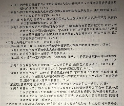 王伟锋 这是一块褐色的石头,外表看上去很普通,内里却蕴藏着美玉。它躺在山间的一条小溪边,寒来暑往,卧看花开花落,静观云卷云舒。 一年又一年,褐色石享受着阳光,闻着花香,听到淙淙的流水之声,真好啊,褐色石觉得,这就是幸福人生的至高境界了。 每天一觉醒来,褐色石就能感受到生活的诸般美好。游鱼在清澈的溪水里嬉戏,飞鸟倏忽间掠过水面,鱼儿们立刻抱头鼠窜;蛐蛐在草丛里专注地歌唱;梅花鹿蹦跳着跑来溪水找水喝;小松鼠调皮地在它身上蹭痒痒,蹭得它忍不住浑身也痒痒。 一天,地理学教授跟随驴友团登山,在小溪旁歇脚的时候,他对一块带花纹的石头敲敲打打了许久,蓦地大叫起来——这里有一块璞玉!他庄重地把花纹石抱起来。由于石头太大,他把包里许多东西都丢弃了。 花纹石被带出了大山,这让褐色石很是替花纹石的命运担忧。一块石头,远离大山,远离阳光、花香和流水,是一件多么可怕而不幸的事情。 但接下来发生的事,却让褐色石始料未及。地理学教授走后不久,漫山遍野突然来了黑压压许多人,疯狂地在山上找寻着,挖掘着……为了争抢一块石头不惜互相谩骂,甚至打得头破血流。 花纹石真的是一块璞玉啊,可以想象,它现在是多么风光!那么,自己也是一块美玉,怎么没有人发现自己的价值呢?褐色石为自己鸣不平,它大喊大叫起来,希望引起人们的注意。但没有人理会它,狂热的人们在它身上踩来踩去,就是没有人弯腰捡起它。也有人满怀希望地看它一眼,立刻飞起一脚把它踢开——什么破玩意儿! 褐色石成了出气筒,被人踢来踢去,伤痕累累。世间万物皆有尊严,何况一块蕴藏美玉的有思想的石头!褐色石简直气疯了——这些人真是有眼无珠! 不知过了多久,山里终于安静下来。人们散去了,有的满载而归,有的失魂落魄,还有人把性命丢在了山里,成了孤魂野鬼。 望着天上那轮残缺的月亮,褐色石抚摸着身上的伤痕,暗下决心:自己一定要像花纹石那样走出去,见识大世面,出人头地;谁要能把自己带出山去,一定好好报答人家! 难挨的等待中,机遇终于降临。一个瘦弱的小男孩上山来了,他把褐色石随意地捡了起来,连同其他几块石头一起带了下山。 小男孩想把石头卖给玉器厂,老板不屑一顾,要赶他走,但经不住小男孩的苦苦哀求,只好让工人打开。当褐色石的外皮打开时,人们瞬间惊呆了——居然是一块颜色纯正、精美绝伦的翡翠! 小男孩欢呼起来,他上高中考大学的费用没问题了。褐色石对小男孩充满了感激,它也打开心扉,实实在在地报答了人家。 就这样,褐色石——不,如今它已经是一块翡翠了,被玉雕大师精心雕琢,成了一件举世无双的艺术品,在五光十色的华丽灯光下接受络绎不绝的掌声与赞美。 但好景不长,它被一个富豪收藏家买下,安置在地下室,锁进了保险柜,还用厚厚的防弹钢板做成安全罩,严严实实地罩起来。收藏家每年只打开保险柜一次。褐色石头再也见不到阳光了。 它大喊大叫地抗议,但没有人理会它,四周只是一片深沉的黑暗。 它想不明白,自己应该感到幸运还是悲哀。它常常在梦中回到那个阳光灿烂、花香馥郁、流水淙淙的山中小溪。可是,那样自由自在的日子,一去不返,它永远也回不去了。 (摘自《2015年中国微型小说精选》,有删改) 5.下列对小说有关内容的分析和概括,不恰当的一项是 A.作者通过叙述褐色石头的遭遇,揭示了命运的多边性,表达了对世人盲目逐利行为的批评。 B.“褐色石简直气疯了”的根本原因是:人们在山里疯狂地挖掘石头破坏了自己的生活。 C.褐色石感激把自己带出大山的小男孩,实实在在地报答人家,这体现了它的知恩图报。 D.小说采用拟人的手法,从褐色石的角度展开叙述,赋予褐色石“人”的情态,构思新颖。 6.结合语境,品味下面语句,简要分析其表达效果。(3分) 游鱼在清澈的溪水里嬉戏,飞鸟倏忽间掠过水面,鱼儿们立刻抱头鼠窜;蛐蛐在草丛里专注地歌唱;梅花鹿蹦跳着跑来溪水找水喝;小松鼠调皮地在它身上蹭痒痒,蹭得它忍不住浑身也痒痒。 7.小说叙写花纹石被带出大山的情节,有什么作用?请结合小说内容简要分析。(3分) 8.小说结尾写到褐色石想不明白“自己应该感到幸运还是悲哀”,你认为它是幸运还是悲哀?请结合文本,阐述你的观点和理由。(5分) 参考答案 ![]() ![]() |