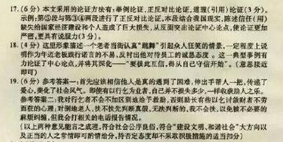 ①陌生人都可以信任吗?回答的比率相差甚远,从挪威的65%到巴西的5%左右。世界银行的史蒂夫·奈克指出的:“信任是影响一个国家经济健康的最有力的因素之一。在信任度较低的时候,个人和组织在参与经济交易时会更警惕,因而往往抑制国家经济。” ②人生或者社会最大的浪费,就是彼此都不相信!知名危机管理专家王微说:“信任也是生产力。”当彼此信任度越高,管理就越少,彼此方便,成本自然下降,工作也越愉快。 ③多年前一个朋友的朋友第一次包车去西藏,路过一个小村庄,一个小女孩拦住了他们的车,问他们是不是要路过前面的某个镇子,司机说“是”,于是那女孩便让司机带上给在前方某镇子打工的哥哥1000元钱,而司机和女孩素不相识。当时我朋友的朋友震惊于人与人之间的那份纯真,从此爱上西藏。 ④想买书,店内却没老板,书友可在纸上写下购书名单,将钱自行放入钱筒中。这成为台湾“BOOK ANEW”二手书店特色,成为爱书人口耳相传的诚实书店。27岁的老板认为,“爱书的人素质高,不会偷书”,且书的单价低,转卖也无法获利。信任的后果是,书友们一般多塞钱支持他。书店办得越来越好。 ⑤商务部曾有个统计,我国企业每年因信用缺失导致的直接和间接经济损失高达6000亿元。我国每年签订约40亿份合同中,履约率只有50%。在诚信成本太高,而失信又几乎没什么成本的情况下,违约、造假、欺诈的故事几乎每天都在上演。这两年,红木古典家具市场低迷,雪上加霜的是,我的一个朋友,被遵化的一个生意伙伴“拖欠”380万货款,其实是赖账,朋友是在醉的时候跟我说,他知道,在这个骗子横行的年代,被骗是多么丢人。 ⑥这就是信的代价。血淋淋、活生生的代价。没有信任,人是真的孤单! ⑦信,一个字,好贵重;如果变成两个字“相信”——互相信任,人生即可轻盈。世界最幸福国家挪威,年度人均GDP高达5.3万美元,为世界最高水平。74%的挪威人都表示其他人值得信任,这个比例为各国之最。 ⑧信,是没有被污染的初心是天光,它有一种辉映,叫相信,彼此互信。纽约市的一个流浪汉Valentine,在路上向一个企业高管Harris女士乞讨。Harris女士拿出自己的信用卡让他去买点东西,并等他回来还卡。流浪汉并没有逃之夭夭,很快把卡还给了这位慷慨的女士。流浪汉事后说,“她相信了我,我不能辜负这份信任,永远不会!” ⑨1984年的一天,一个66岁老头在华尔街穿着裙子和裤袜扭动腰肢翩翩起舞,惹得众人狂笑。他不是疯子,他正是刚和员工打赌输了的沃尔玛创始人老沃尔顿,他告诉人们,老板更应信守承诺。 ⑩要彼此相信,得从自己守信开始。信任,是所有关系的基础,无论经商还是待人接物? 16、选文中作者阐明的主要观点是什么?(4分) 17、本文采用了哪些论证方法,试选择一种论证方法,结合本文具体内容简要分析其作用。(6分) 18、结合选文,说说第9段划线句在表达上的作用(4分) 19、阅读下面的链接材料并回答问题(6分) “老人倒地扶不扶”和“困窘者街头求助帮不帮”等问题,社会上对此争论激烈。 肯定方认为,应该“扶”“助”。据有关机构调查,老人倒地讹诈的现象极少,“不扶”“不助”违背文明社会“扶弱济困”的公德,“不扶”已造成的许多不良后果,也拷问着社会的良知。 否定方也有“不扶”“不助”的道理。 请结合选文说说你怎样对待这类事情? 参考答案 16.阐明的主要观点是信任是所有关系的基础。 ![]() |