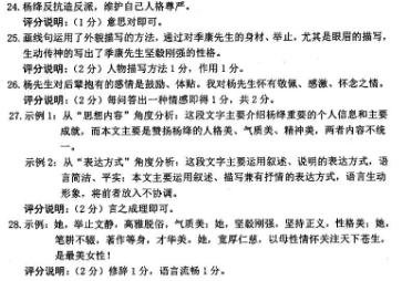 ①早在做同事之前,在东四头条的社科院宿舍大院,我和杨绛先生就做过邻居,按“翰林院”(中国 社会科学院)不成文的规矩,作为小字辈的我,要按其本名,尊称她“季康先生”。 初见时,季康先生年过半百。精瘦娇小,举止文静轻柔,但整个人极有精神,特别是两道遒劲高挑而又急骤下折的弯眉,显示出一种坚毅刚强的性格。她的衣着从来都整齐利索,即使在家不意碰见来访者敲门的时候。她始终保持着西洋妇女那种特定的“尊重自己,也尊重别人”的习惯。 ③在公共场合,季康先生从来都是低姿态的,她脸上总是挂着一丝谦逊的微笑。她总是把自己的语言压缩到最少。 ④在我见到的大家名流中,钱、杨二位先生要算是最为平实,甚至最为谦逊的两位,季康先生虽然有时穿得雍容华贵,神情态度却平和得像邻里阿姨。 ⑤但这个看似低调谦恭的阿姨,也有吃了熊心豹子胆的时候,且这个时候出现得无比不合时宜。“文革”之初,他们被造反派揪出来,挂了牌子押上批斗会。可杨季康对“天兵天将”的推推搡搡公然进行了反抗,而且怒目而视。要知道,不少老战士都没有一个敢于如此维护自己被践踏了的尊严的。 ⑥“文革”后期,钱、杨二位先生尚未获得平反,有家回不了 ,四处流转。但对于这群甚至未能为他们说句公道话的晚辈,他们以极高的涵养、含蓄内敛且从不显于言辞的方式予以理解、宽容和无私帮助。 ⑦有一次, 我家因额外开支经济上一时告急,杨先生得知后主动支援了我们几百元钱。以后每月都资助我二十元人民币。后来我还获知,研究所里每月不落地从先生那里得到接济的竟有十多个像我们这样的年轻人,且持续了好几年。经历了人生的磨难,却能如此悲悯,如此退让,如此宽厚慈祥,如此菩萨心肠,这是我在“翰林院”所见到的唯一一例。 ⑧先生施恩于后辈,大部分无法用金钱计算。20世圮80年代初,我访法归 来写的两本书准备出版,因考虑到之前有前辈权威的横眉冷对,我特地在前言中恭敬写明“抛砖引玉”。当然,敬赠给钱、杨二位先生,抱的心态自然不同。很快,杨先生回信了,还是一贯的低调谦恭与幽默:“假如你抛出一块小砖, 肯定会引来大堆的砖头瓦片,但是珠玉在前,砖就不敢出来了……天气酷热,多多保重……杨绛八月十三日钟书同候。” ⑨先生过百岁大寿时,深知先生君子之道的我,自然不敢上门叼扰。当电话里听到老太太爽朗清晰的声音时,我仿佛又回到了三十年前的那个夏天,依然如喝了冰水那样舒心畅快——只是多少也有几分伤感,因为不可能有“钟书同候”了。 (选文有改动) 【注释】①人瑞,常指百岁以上德高望重的人。 24.请用简洁的语言概括第⑤段的主要内容。(1分) 25.赏析第②段画线句子。(2分) 26.从第⑧段杨先生的回信中,可以看出她对后辈抱有什么感情?联系全文,说说“我”对杨先生怀有什么感情?(2分) 27.下列这段文字是从“百度”中下载的。这段文字不宜添加到《最美人瑞这样走来》一文中。请从思想内容或表达方式中的一个方面说明理由。(2分) 杨绛,钱钟书的夫人,本名杨季康,生于1911年7月17日,祖籍江苏无锡,1932年毕业于苏州东吴大学。1935-1938年留学英法,回国后曾在上海复女子文理学院、清华大学任教。1949年后,在中国社会科学院文学研究所、外国文学研究所工作。杨绛女士是著名作家、翻译家、外国文学研究家,主要文学作品有《洗澡》《干校六记》,另有《堂吉诃德》等译著。 28.假如杨绎被评为中国“最美女性”,请根据本文内容以及你对她的了解,为她设计一段颁奖词。(要求:至少使用一种修辞方法)(2分) 参考答案 24.杨绛反抗造反派,维护自己人格尊严