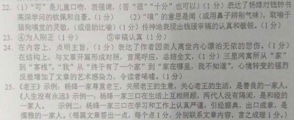 杨绛 自从迁居三里河寓所,我们好像跋涉长途之后,终于有了一个家,我们可以安顿下来了。 我们仨,却不止三人。每个人摇身一变,可变成好几个人。例如阿瑗小时才五六岁的时候,我三姐就说:“你们一家呀,圆圆头最大,钟书最小。”我的姐姐妹妹都认为三姐说得对。阿瑗长大了,会照顾我,像姐姐;会陪我,像妹妹;会管我,像妈妈。阿瑗常说:“我和爸爸最‘哥们’,我们两个顽童,爸爸还不配做我的哥哥,只配做弟弟。”我又变为最大的。钟书是我们的老师。我和阿瑗都是好学生,虽然近在咫尺,我们如有问题,问一声就能解决,可是我们决不打扰他,我们都勤查字典,到无法自己解决才发问。他可高大了。但是他穿衣吃饭,都需我们母女把他当孩子般照顾,他又很弱小。 他们两个会联成一帮向我造反,例如我出国期间,他们连床都不铺,预知我将回来,赶忙整理。我回家后,阿瑗轻声嘀咕:“狗窠真舒服。”有时他们引经据典的淘气话,我一时拐不过弯,他们得意说:“妈妈有点笨哦!”我的确是最笨的一个。我和女儿也会联成一帮,笑爸爸是色盲,只识得红、绿、黑、白四种颜色。其实钟书的审美感远比我强,但他不会正确地说出什么颜色。我们会取笑钟书的种种笨拙。也有时我们夫妇联成一帮,说女儿是学究,是笨蛋,是傻瓜。 我们对女儿,实在很佩服。我说:“她像谁呀?”钟书说:“爱教书,像爷爷;刚正,像外公。”她在大会上发言,敢说自己的话,她刚做助教,因参与编《英汉小词典》,当了代表,到外地开一个极左的全国性语言学大会。有人提出凡“女”字旁的字都不能用,大群左派都响应赞成。钱瑗是最小的小鬼,她说:“那么,毛主席词‘寂寞嫦娥舒广袖’怎么说呢?”这个会上被贬得一文不值的大学者如丁声树、郑易里等老先生都喜欢钱瑗。 钱瑗曾是教材评审委员会的审稿者。一次某校要找个认真的审稿者,校方把任务交给钱瑗。她像猎狗般嗅出这篇论文是抄袭。她两个指头,和钟书一模一样地摘着书页,稀里哗啦地翻书,也和钟书翻得一样快,一下子找出了抄袭的原文。 一九八七年师大外语系与英国文化委员会合作建立中英英语教学项目,钱瑗是建立这个项目的人,也是负责人。在一般学校里,外国专家往往是权威。一次师大英语系新聘的英国专家对钱瑗说,某门课他打算如此这般教。钱瑗说不行,她指示该怎么教。那位专家不服。据阿瑗形容:“他一双碧蓝的眼睛骨碌碌地看着我,像猫。”钱瑗带他到图书室去,把他该参考的书一一拿给他看。这位专家想不到师大图书馆竟有这些高深的专著。学期终了,他到我们家来,对钱瑗说:“Yuan,you worked me hard”,但是他承认“得益不浅”。师大外国专家的成绩是钱瑗评定的。 阿瑗是我生平杰作,钟书认为“可造之材”,我公公心目中的“读书种子”。她上高中学背粪桶,大学下乡下厂,毕业后又下放四清,九蒸九焙,却始终只是一粒种子,只发了一点芽芽。做父母的,心上不能舒坦。 人世间不会有小说或童话故事那样的结局:“从此,他们永远快快活活地一起过日子。” 人间没有单纯的快乐。快乐总夹带着烦恼和忧虑。 人间也没有永远。 一九九七年早春,阿瑗去世。一九九八年岁末,钟书去世。我们三人就此失散了。就这么轻易地失散了。“世间好物不坚牢,彩云易散琉璃脆”。现在,只剩下了我一人。 我清醒地看到以前当做“我们家”的寓所,只是旅途上的客栈而已。家在哪里,我不知道,我还在寻觅归途。 22.结合语境,分析文中的划线句子里加点词的妙处。(4分) (1)他可高大了。_____________________________________________________________________ (2)她像猎狗般嗅出这篇论文是抄袭。__________________________________________________ 23.钱钟书、杨绛夫妇学贯中西,却对女儿钱媛”实在很佩服“,第四段到第六段详细回忆了钱媛的三件事情,仿照示例概括钱媛令父母佩服之处,填写在下列横线上。(2分) ④_________________----⑤_______________----⑥学问高深 24.根据你的理解,从内容上或结构上任选一个角度,具体说说第十二自然段在文中的作用(2分) 答: 25.《人生没有永远》一文中,杨绛先生在耄耋之年回忆了一家三口往日的生活,我们在学过的课文《老王》里也能看到他们家的生活点滴。请分别结合两篇文章的内容,说说杨绛一家给你留下了怎样的印象。(4分) 参考答案