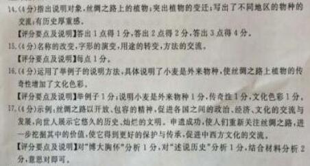 白雁 ①丝绸之路已经有两千多年的历史,它是一条古代中国腹地连接亚非欧商业贸易的通道。经过这条通道,中西方互通有无。一些具有传奇色彩的植物,就通过这条通道传入了中国。 ②黄瓜名称的改变就具有传奇色彩。黄瓜最初叫“胡瓜”,公元6世纪前传入中国。“胡瓜”为什么改叫“黄瓜”呢?原来隋炀帝因为有鲜卑血统而“讳胡”,所以将涉“胡”的字眼一律更换。按照五行学说,黄为土色,位在中央,因此黄色属于中央之色。隋朝以鲜卑血统入主中原,为了宣示隋皇室统治的正统性,才无视“黄瓜”之绿色而改为黄色。 ③小麦的原产地是西亚和北非地区的两河流域,而中国发现的最早的小麦,出土于距今约四千年前的新疆小河墓地。大约一千年之后,小麦的身影又出现于小河墓地以东的吐鲁番地区。能证明小麦是外来植物的事例还有很多。比如出土于中原黄河流域的甲骨文中有“来”和“麦”这两个汉字,就保存了小麦由西向东传入中原地区这一具有传奇色彩的历史信息。“来”的繁体字是“来”,甲骨文字形之一 ,很明显是一个象形字,像一株小麦的形状,中间是直立的麦秆,上面是左右对生的麦叶,下面是麦根。“来”的甲骨文字形之二 ,上面的斜撇像成熟后下垂的麦穗。后来甲骨文被金文取代,“来”的金文字形将下垂的麦穗之形变为一横,而且表示麦秆的一竖还穿透了这一横,这就为字形的“讹变”埋下了伏笔。据此看来,“来”的本义是外来的小麦,引申为来去的“来”。“麦”的繁体字是“麥”,甲骨文字形,上面是“来”,即麦子;下面是“夂”,像一只脚趾朝下的脚。甲骨文中的脚都是有方向性的,脚趾朝下就表示从外而来,因此整个字形会意为:麦子是从外地引进而来的作物。你看,这其中是不是充满了传奇性?④其实,具有传奇色彩的植物还不止这些呢。大蒜的原产地是西亚和中亚,最迟在汉代传入中国。它的最初用途是和西方一样作为药用的,后来又变成了辟邪之物。原产于印度的甘蔗传入中国南方后,唐朝向印度学习熬糖法制作出了红糖。唐代宗年间四川一带人探索出了制作白糖的方法,然后再次传回到了印度。 ⑤丝绸之路上穿行的植物还有很多。在这些植物传奇变化的背后,还有很多文化遗产的奥秘等待我们去探索。 ⑥丝绸之路正以它博大的胸怀向世人述说着它的历史…… (选自2015年7月第8期《科学大众》,有删改) 14.结合全文,分析本文标题包含了哪些信息。(4分) 15.文章分别从哪些角度说明了这几种植物的“传奇色彩”?请用简洁的语言概括。(4分) 16.请指出第③段划线句运用了哪种说明方法,并分析其作用。(4分) 17.阅读材料,谈谈你对第⑥节划线句子的理解。(4分) 材料:“申遗”是某国家或地区以某一特殊文化遗产价值申请列入世界遗产名录的行为。申遗成功后,可使该遗产项目得到较好的保护。2014年中哈吉三国“丝绸之路”联合申遗成功。 参考答案 14.指出说明对象,丝绸之路上的植物;突出植物的变变迁;写出了不同地区的物种的交流,有历史厚重感。 15.名称的改变,字形的演变,用途的转变,方法的交流。