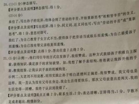 王旭 乌云从南面的天空急急地飞过来,眼看就到头顶上了,大老刘急忙抱起塑料布往麦场里跑,今天收的麦子,不能被雨水冲了。 电话响了。谁的电话?真是添乱。哦,是儿子的,儿子大学毕业后,在城里工作,成了家,有了孩子。 “爷……” “哎……是孙子哟。”大老刘心里灌了蜜,劳累顿时全散了。 “我今天收麦了!”孙子高兴地喊。 大老刘一听,恁小的孩子能收麦?上哪收麦?城里有麦子?收麦是很累人的活计,时间紧,天热,活计重,活计脏,一个麦收等于两个秋收,人们说“一麦两秋”就是说收麦活重。大太阳底下如火烤,麦秸上有一层厚厚的灰,手一动,灰便飞起来。还有小蠓虫子围着头飞来飞去,直打脸,往鼻子嘴里钻。 “你——收麦?累不累?”“一点也不累。好玩着呢!” 好玩?收麦子好玩?割麦时要蹲在熟透的麦子边,蹲累了,跪地上,跪累了,坐地上,一点点地往前欠着身子,一把一镰才割四指远,一天也就割亩把地。一天下来,浑身是灰,往床上一躺,像散了架子。 “今天我和爸妈一起去体验农家乐了,妈妈还给我买了一身运动装,我穿上可好看了。带上饮料,我最爱喝的。” “这不是旅游吗?” “差不多,你猜我割了多少麦子?” 这一问难住大老刘了,孙子一天能割多少麦子呢?半亩不能,有一间房子大的一片儿就不少了。他想着。 “猜不到吧。我割了二百六十棵麦子!”孙子很有成就感。 天哪,孙子能用棵来统计割麦的数量! “割那么多,累吗?”大老刘算是明白了,孙子是玩,不是收麦子。 “不累!妈妈一边给我打着伞,一边给我拿饮料,一会儿喂我一口,一会儿给我擦擦汗;爸爸接我割的麦子,我割一棵,爸爸计一棵,一共二百六十棵!” 大老刘没有回话,只“噢”了一声。 “爷,唐诗错了!就那句‘谁知盘中餐,粒粒皆辛苦’!” “咋错了?”大老刘心里一疼,像是被谁狠狠地砸了一下,赶紧问。 “我觉得,收麦一点也不辛苦啊!我把麦棵交给加工人员,他给我打了二万零五十八粒麦子,可是哪有一点辛苦啊?所以‘粒粒皆辛苦’错了!” 乌云遮蔽了天空,远处传来了雷声。 大老刘愣了半天,才说:“明天你回来帮爷爷割麦子吧。” 第二天,艳阳高照,真是麦收的好天气!大老刘只带了孙子一个人下了田。只一会儿工夫,孙子就脸色潮红,汗珠直滴,动作也慢了下来,开始用求救的眼光看向爷爷。大老刘什么话也没说。孙子越割越慢,终于割不动了。大者刘指着孙子割下的麦子说:“你数一数,今天你割了多少粒麦子?”孙子看着自己浑身湿透的衣服和那割下的一点点麦子,一下子呆住了…… 一进门,孙子就累得瘫倒在地上,苦着脸说:“真是‘粒粒皆辛苦’啊……”看着孩子疲劳的样子,爸爸妈妈噌的一下脸红了,大老刘却高兴地笑了。 (选自2016年第7期《微型小说选刊》,有删改) 18.请用合适的词在下列方框中写出“大老刘”的心理状态。(4分) 接到孙子电话时 →听说孙子参加割麦时 → 听到孙子说劳动不辛苦时 →听到孙子说“真是‘粒粒皆辛苦’啊”时 19.请说说文中画线句子的写作意图。(4分) 20.阅读下列两句话,联系全文,回答问题。(5分) 孙子看着自己浑身湿透的衣服和那割下的一点点麦子,一下子呆住了…… 爸爸妈妈噌的一下脸红了。 (1)这两句话中的加点词都用了什么方法描写人物? ▲ (1分) (2)简要分析加点词的内涵。 呆住了: ▲ 脸红了: ▲ 21.《月迹》中的奶奶是一个高明的教育家,她注重引导孩子自己去寻找月亮,发现美,把孩子的心灵不断带进新的高尚境界。文中的“大老刘”也用这样的方式教育了“孙子”。请你结合生活实际,谈谈对他们这种教育方式的认识。(80-100字,5分) 参考答案 18.欣喜,吃惊,沉重(伤心,郁闷);欣慰 19、写出了麦收的辛苦,与下文孙子愉快的农家乐劳动形成对比;为下文写孙子体会到劳动的辛苦埋下伏笔。