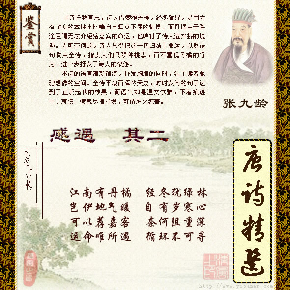 张九龄 江南有丹橘,经冬犹绿林。 岂伊地气暖,自有岁寒心。 可以荐嘉客,奈何阻重深。 运命唯所遇,循环不可寻。 徒言树桃李,此木岂无阴? 【诗文解释】 江南一带生长着的丹橘,经过严冬仍然碧绿成林。哪里是因为江南地气温暖,全凭自己有耐寒的本性。本来可以推荐给嘉宾,无奈阻隔太多路途遥远。命运决定了遭遇,循环的天道无法追寻。世人只说种植桃李,难道丹橘就不能荫凉吗? 二: 江南一带生长的丹橘,经过寒冬还绿叶葱茏。 哪里是因为地气温暖,全凭自己有耐寒本性。 本可以献给贵客嘉宾,无奈阻隔着崇山峻岭。 命运决定了这种遭遇,循环的道理难以追寻。 世人只是说栽植桃李,难道丹橘就不能遮阴? ![]() 【词语解释】 岂:难道。 伊:那里,指江南。 岁寒心:耐寒的本性。 荐:进献。 嘉客:嘉宾贵客。 奈何:无奈。 阻重深:山高水深,阻隔重重。 运命:命运。 循环:周而复始,变化莫测。 寻:探求。 徒言:只说。 树:种植。 此木:指丹橘。 阴:树阴。 【诗文赏析】 本诗托物言志,诗人借赞颂丹橘,经冬犹绿,是因为有耐寒的本性来比喻自己坚贞不屈的情操。而丹橘由于路途阻隔无法介绍给嘉宾的命运,也映衬了诗人遭排挤的境遇。无可奈何的,诗人只得把这一切归结于命运,以反诘句收束全诗,指责人们只顾种桃李,而不重视丹橘的行为,进一步抒发了诗人的愤怨。 《感遇十二首》中的第二首也依然是托物言志诗,借歌颂丹橘表达诗人遭受排挤的愤懑心情和坚贞不屈的节操。看到本诗,人们很容易想起屈原的《橘颂》。本诗开篇便说“江南有丹橘,经冬犹绿林”,其托物言志之意非常明显。在南国,深秋时多数树木的叶片都会枯黄凋零,更别说能经受寒冬的摧残。可是,丹橘却能“经冬犹绿林”。句中一个“犹”字,饱含着诗人的赞美之情。那么,丹橘经冬犹绿,到底是因为独特的地理优势,还是本性使然呢?若是地理优势造成,也就不值得赞叹了。因此诗人先用反问句“岂伊地气暖”一“纵”,又用肯定句“自有岁寒心”一“收”,令诗情跌宕起伏,独具韵味。在古代诗文中,“岁寒心”多指松柏。诗人在此赞颂丹橘与松柏一样具有忍受严寒的节操,是别有一番深意的。 《橘柚垂华实》是汉代《古诗》中的一篇,其中一句“委身玉盘中,历年冀见食”,以橘柚的遭遇抒发了诗人不被世用的愤慨。而本诗中的“可以荐嘉客”,就是“冀见食”之意。丹橘经冬而不凋,不因严寒而改变节操,已经很值得赞美;它结出丰硕的果实,只想贡献给他人,更可见它的品德高尚。按理说,如此优良的树木、果实是应当向嘉宾推荐的,无奈却被重山深水无情地阻隔了!一句“奈何阻重深”,使人仿佛听到了诗人无奈的叹息声。 而“运命惟所遇,循环不可寻”两句,明确吐露了诗人托物言志之意:无论是丹橘还是人,其遭遇好坏与命运相关。而命运好坏的缘由则像循环往复的自然之理那样,无法探究。这两句诗委婉幽深,饱含着诗人复杂的感情。 在末尾,诗人用反问语气结束全诗:世人只说栽种桃李,莫非橘树就无法遮阴、没有功用吗?在诗的前半部分,诗人已写明橘树绿荫耐寒、果实甘美,但它的命运却又如此多舛,这究竟是为什么呢?在《韩非子•外储说左下》中有这样一个寓言:阳虎对赵简主说,他曾经亲自培养了一批人才,然而当他有危难的时候,这批人才却都不帮他。因此阳虎慨叹道:“虎不善树人。”赵简主说:“树橘柚者,食之则甘,嗅之则香;树枳棘者,成而刺人。故君子慎所树。”只栽种桃李而不栽种橘柚,此类“君子”,总不能算作“慎所树”吧! 本诗的语言清新简练,抒发胸臆的同时,给了读者驰骋想像的空间。全诗平淡而浑然天成,时时发问的句子达到了正反起伏的效果,而语气却是温文尔雅,不着痕迹中,哀伤、愤怒尽情抒发,可谓炉火纯青。